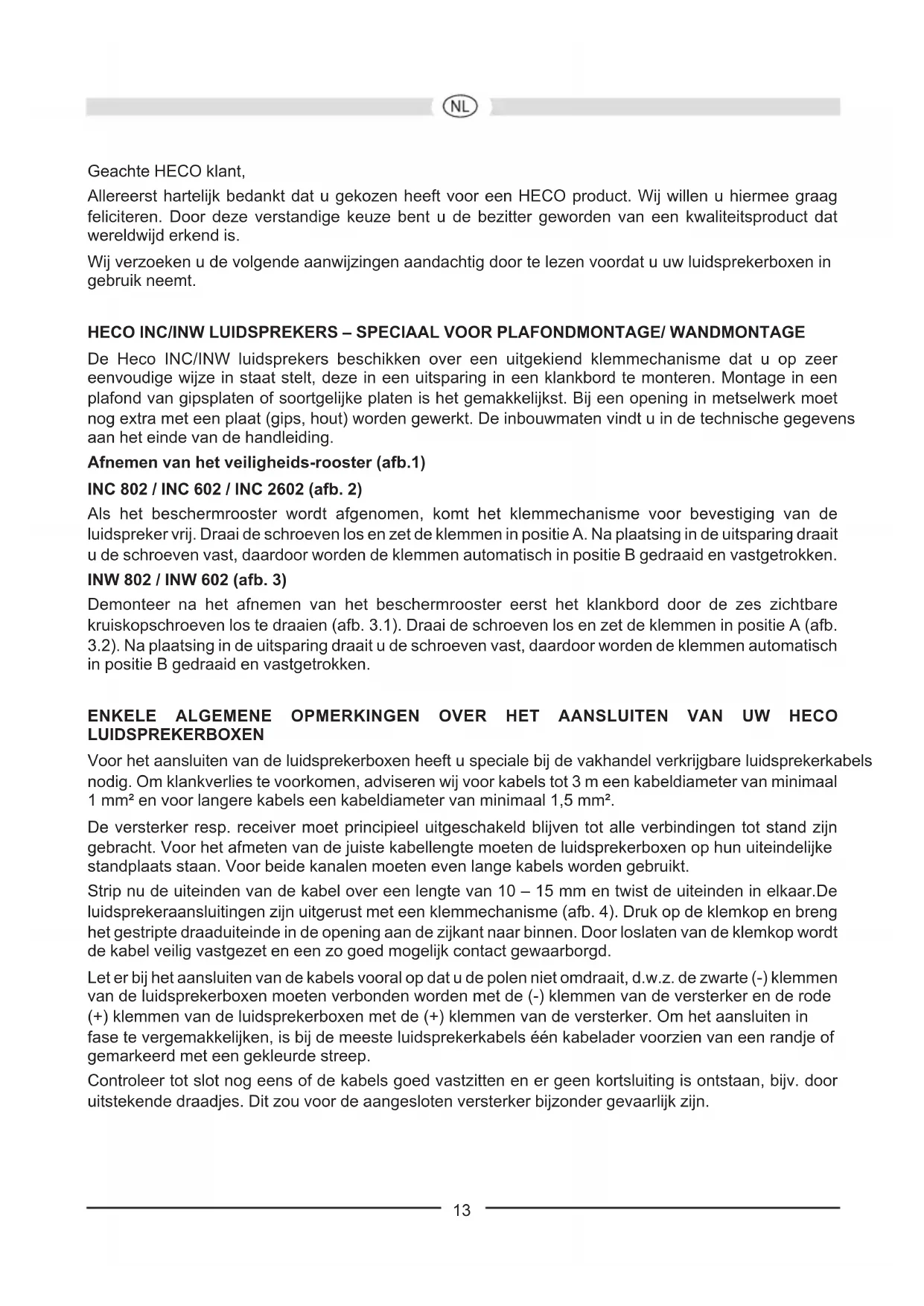 Puissance nominale : 120 / 200 W 100 / 180 W 100 / 180 W Impédance : 4 – 8 Ohm 4 – 8 Ohm 2 x 4 Ohm Fréquence de coupure: 3500 Hz 3500 Hz 3600 Hz Bande passante : 32 – 32 000 Hz 35 – 32 000 Hz 35 – 30 000 Hz Puissance recommandée en sortie de l’amplificateur: 30 – 180 W 30 – 140 W 30 – 160 W Efficacité (1W/ 1m) : 91 dB 90 dB 90 dB Dimensions extérieures Ø: 272 mm 231 mm 231 mm Découpe Ø: 242 mm 198 mm 198 mm Profondeur d‘encastrement: 112 mm 98 mm 92 mm INW 602 INW 602 Puissance nominale : 120 / 200 W 100 / 180 W Impédance : 4 Ohm 4 – 8 Ohm Fréquence de coupure: 3500 Hz 3500 Hz Bande passante : 32 – 32 000 Hz 38 – 32 000 Hz Puissance recommandée en sortie de l’amplificateur: 30 – 180 W 30 – 160 W Efficacité (1W/ 1m) : 91 dB 90 dB Dimensions extérieures (l x h): 253 x 356 mm 219 x 306 mm Découpe (l x h): 223 x 325 mm 188 x 274 mm Profondeur d‘encastrement: 90 mm 75 mm SOUS TOUTES RESERVES DE MODIFICATIONS TECHNIQUES. 12Geachte HECO klant, Allereerst hartelijk bedankt dat u gekozen heeft voor een HECO product. Wij willen u hiermee graag feliciteren. Door deze verstandige keuze bent u de bezitter geworden van een kwaliteitsproduct dat wereldwijd erkend is. Wij verzoeken u de volgende aanwijzingen aandachtig door te lezen voordat u uw luidsprekerboxen in gebruik neemt. HECO INC/INW LUIDSPREKERS – SPECIAAL VOOR PLAFONDMONTAGE/ WANDMONTAGE De Heco INC/INW luidsprekers beschikken over een uitgekiend klemmechanisme dat u op zeer eenvoudige wijze in staat stelt, deze in een uitsparing in een klankbord te monteren. Montage in een plafond van gipsplaten of soortgelijke platen is het gemakkelijkst. Bij een opening in metselwerk moet nog extra met een plaat (gips, hout) worden gewerkt. De inbouwmaten vindt u in de technische gegevens aan het einde van de handleiding. Afnemen van het veiligheids-rooster (afb.1) INC 802 / INC 602 / INC 2602 (afb. 2) Als het beschermrooster wordt afgenomen, komt het klemmechanisme voor bevestiging van de luidspreker vrij. Draai de schroeven los en zet de klemmen in positie A. Na plaatsing in de uitsparing draait u de schroeven vast, daardoor worden de klemmen automatisch in positie B gedraaid en vastgetrokken. INW 802 / INW 602 (afb. 3) Demonteer na het afnemen van het beschermrooster eerst het klankbord door de zes zichtbare kruiskopschroeven los te draaien (afb. 3.1). Draai de schroeven los en zet de klemmen in positie A (afb. 3.2). Na plaatsing in de uitsparing draait u de schroeven vast, daardoor worden de klemmen automatisch in positie B gedraaid en vastgetrokken. ENKELE ALGEMENE OPMERKINGEN OVER HET AANSLUITEN VAN UW HECO LUIDSPREKERBOXEN Voor het aansluiten van de luidsprekerboxen heeft u speciale bij de vakhandel verkrijgbare luidsprekerkabels nodig. Om klankverlies te voorkomen, adviseren wij voor kabels tot 3 m een kabeldiameter van minimaal 1 mm² en voor langere kabels een kabeldiameter van minimaal 1,5 mm². De versterker resp. receiver moet principieel uitgeschakeld blijven tot alle verbindingen tot stand zijn gebracht. Voor het afmeten van de juiste kabellengte moeten de luidsprekerboxen op hun uiteindelijke standplaats staan. Voor beide kanalen moeten even lange kabels worden gebruikt. Strip nu de uiteinden van de kabel over een lengte van 10 – 15 mm en twist de uiteinden in elkaar.De luidsprekeraansluitingen zijn uitgerust met een klemmechanisme (afb. 4). Druk op de klemkop en breng het gestripte draaduiteinde in de opening aan de zijkant naar binnen. Door loslaten van de klemkop wordt de kabel veilig vastgezet en een zo goed mogelijk contact gewaarborgd. Let er bij het aansluiten van de kabels vooral op dat u de polen niet omdraait, d.w.z. de zwarte (-) klemmen van de luidsprekerboxen moeten verbonden worden met de (-) klemmen van de versterker en de rode (+) klemmen van de luidsprekerboxen met de (+) klemmen van de versterker. Om het aansluiten in fase te vergemakkelijken, is bij de meeste luidsprekerkabels één kabelader voorzien van een randje of gemarkeerd met een gekleurde streep. Controleer tot slot nog eens of de kabels goed vastzitten en er geen kortsluiting is ontstaan, bijv. door uitstekende draadjes. Dit zou voor de aangesloten versterker bijzonder gevaarlijk zijn. 13AKOESTISCHE AANPASSING Met kwalitatief hoogwaardige schakelaars kunt u een andere frequentie kiezen voor het aanpassen van de klankkleur van het luidsprekersysteem: