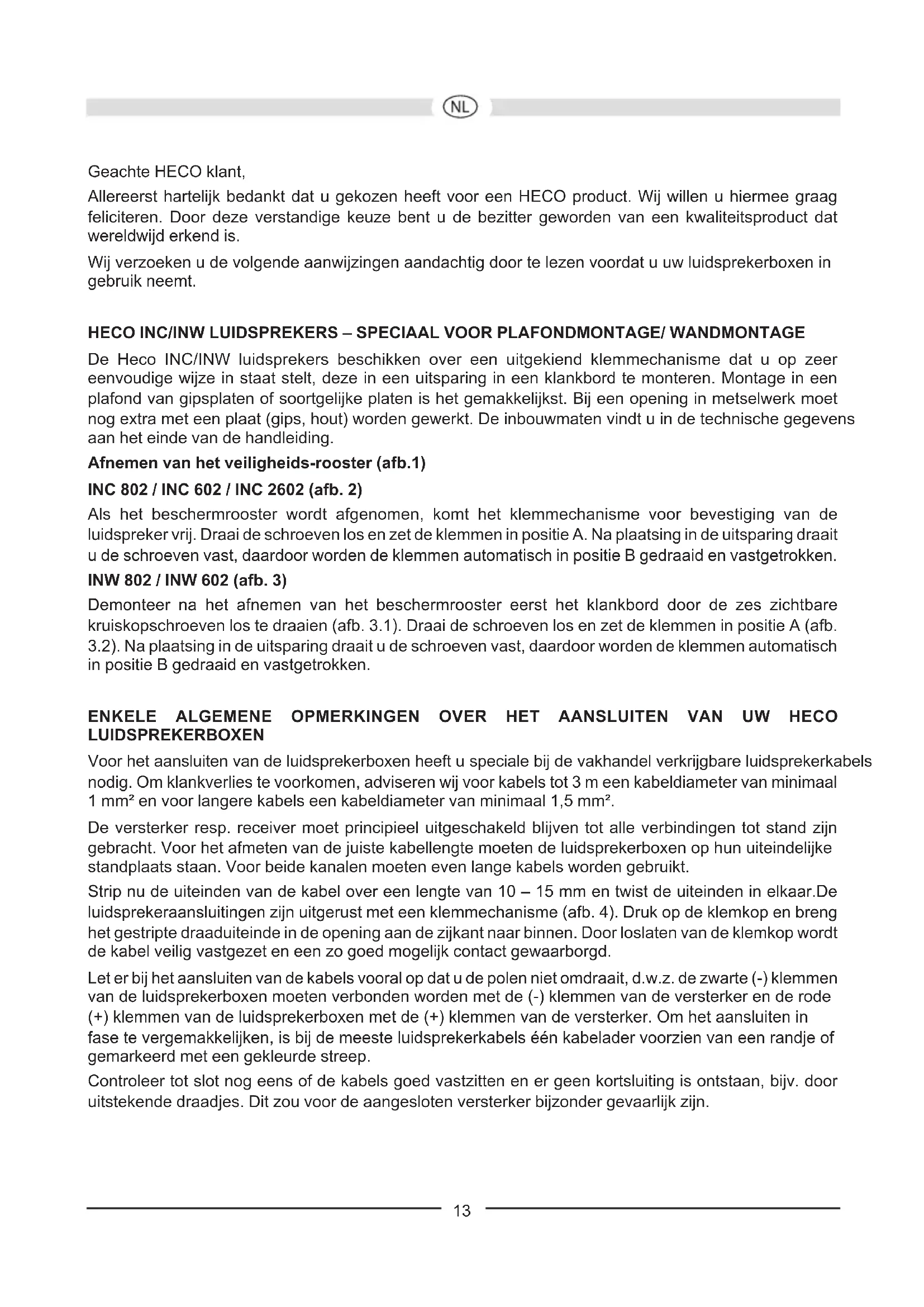 Puissance nominale : 120 / 200 W 100 / 180 W 100 / 180 W Impédance : 4 – 8 Ohm 4 – 8 Ohm 2 x 4 Ohm Fréquence de coupure: 3500 Hz 3500 Hz 3600 Hz Bande passante : 32 – 32 000 Hz 35 – 32 000 Hz 35 – 30 000 Hz Puissance recommandée en sortie de l’amplificateur: 30 – 180 W 30 – 140 W 30 – 160 W Efficacité (1W/ 1m) : 91 dB 90 dB 90 dB Dimensions extérieures Ø: 272 mm 231 mm 231 mm Découpe Ø: 242 mm 198 mm 198 mm Profondeur d‘encastrement: 112 mm 98 mm 92 mm INW 602 INW 602 Puissance nominale : 120 / 200 W 100 / 180 W Impédance : 4 Ohm 4 – 8 Ohm Fréquence de coupure: 3500 Hz 3500 Hz Bande passante : 32 – 32 000 Hz 38 – 32 000 Hz Puissance recommandée en sortie de l’amplificateur: 30 – 180 W 30 – 160 W Efficacité (1W/ 1m) : 91 dB 90 dB Dimensions extérieures (l x h): 253 x 356 mm 219 x 306 mm Découpe (l x h): 223 x 325 mm 188 x 274 mm Profondeur d‘encastrement: 90 mm 75 mm SOUS TOUTES RESERVES DE MODIFICATIONS TECHNIQUES. 12Geachte HECO klant, Allereerst hartelijk bedankt dat u gekozen heeft voor een HECO product. Wij willen u hiermee graag feliciteren. Door deze verstandige keuze bent u de bezitter geworden van een kwaliteitsproduct dat wereldwijd erkend is. Wij verzoeken u de volgende aanwijzingen aandachtig door te lezen voordat u uw luidsprekerboxen in gebruik neemt. HECO INC/INW LUIDSPREKERS – SPECIAAL VOOR PLAFONDMONTAGE/ WANDMONTAGE De Heco INC/INW luidsprekers beschikken over een uitgekiend klemmechanisme dat u op zeer eenvoudige wijze in staat stelt, deze in een uitsparing in een klankbord te monteren. Montage in een plafond van gipsplaten of soortgelijke platen is het gemakkelijkst. Bij een opening in metselwerk moet nog extra met een plaat (gips, hout) worden gewerkt. De inbouwmaten vindt u in de technische gegevens aan het einde van de handleiding. Afnemen van het veiligheids-rooster (afb.1) INC 802 / INC 602 / INC 2602 (afb. 2) Als het beschermrooster wordt afgenomen, komt het klemmechanisme voor bevestiging van de luidspreker vrij. Draai de schroeven los en zet de klemmen in positie A. Na plaatsing in de uitsparing draait u de schroeven vast, daardoor worden de klemmen automatisch in positie B gedraaid en vastgetrokken. INW 802 / INW 602 (afb. 3) Demonteer na het afnemen van het beschermrooster eerst het klankbord door de zes zichtbare kruiskopschroeven los te draaien (afb. 3.1). Draai de schroeven los en zet de klemmen in positie A (afb. 3.2). Na plaatsing in de uitsparing draait u de schroeven vast, daardoor worden de klemmen automatisch in positie B gedraaid en vastgetrokken. ENKELE ALGEMENE OPMERKINGEN OVER HET AANSLUITEN VAN UW HECO LUIDSPREKERBOXEN Voor het aansluiten van de luidsprekerboxen heeft u speciale bij de vakhandel verkrijgbare luidsprekerkabels nodig. Om klankverlies te voorkomen, adviseren wij voor kabels tot 3 m een kabeldiameter van minimaal 1 mm² en voor langere kabels een kabeldiameter van minimaal 1,5 mm². De versterker resp. receiver moet principieel uitgeschakeld blijven tot alle verbindingen tot stand zijn gebracht. Voor het afmeten van de juiste kabellengte moeten de luidsprekerboxen op hun uiteindelijke standplaats staan. Voor beide kanalen moeten even lange kabels worden gebruikt. Strip nu de uiteinden van de kabel over een lengte van 10 – 15 mm en twist de uiteinden in elkaar.De luidsprekeraansluitingen zijn uitgerust met een klemmechanisme (afb. 4). Druk op de klemkop en breng het gestripte draaduiteinde in de opening aan de zijkant naar binnen. Door loslaten van de klemkop wordt de kabel veilig vastgezet en een zo goed mogelijk contact gewaarborgd. Let er bij het aansluiten van de kabels vooral op dat u de polen niet omdraait, d.w.z. de zwarte (-) klemmen van de luidsprekerboxen moeten verbonden worden met de (-) klemmen van de versterker en de rode (+) klemmen van de luidsprekerboxen met de (+) klemmen van de versterker. Om het aansluiten in fase te vergemakkelijken, is bij de meeste luidsprekerkabels één kabelader voorzien van een randje of gemarkeerd met een gekleurde streep. Controleer tot slot nog eens of de kabels goed vastzitten en er geen kortsluiting is ontstaan, bijv. door uitstekende draadjes. Dit zou voor de aangesloten versterker bijzonder gevaarlijk zijn. 13AKOESTISCHE AANPASSING Met kwalitatief hoogwaardige schakelaars kunt u een andere frequentie kiezen voor het aanpassen van de klankkleur van het luidsprekersysteem: