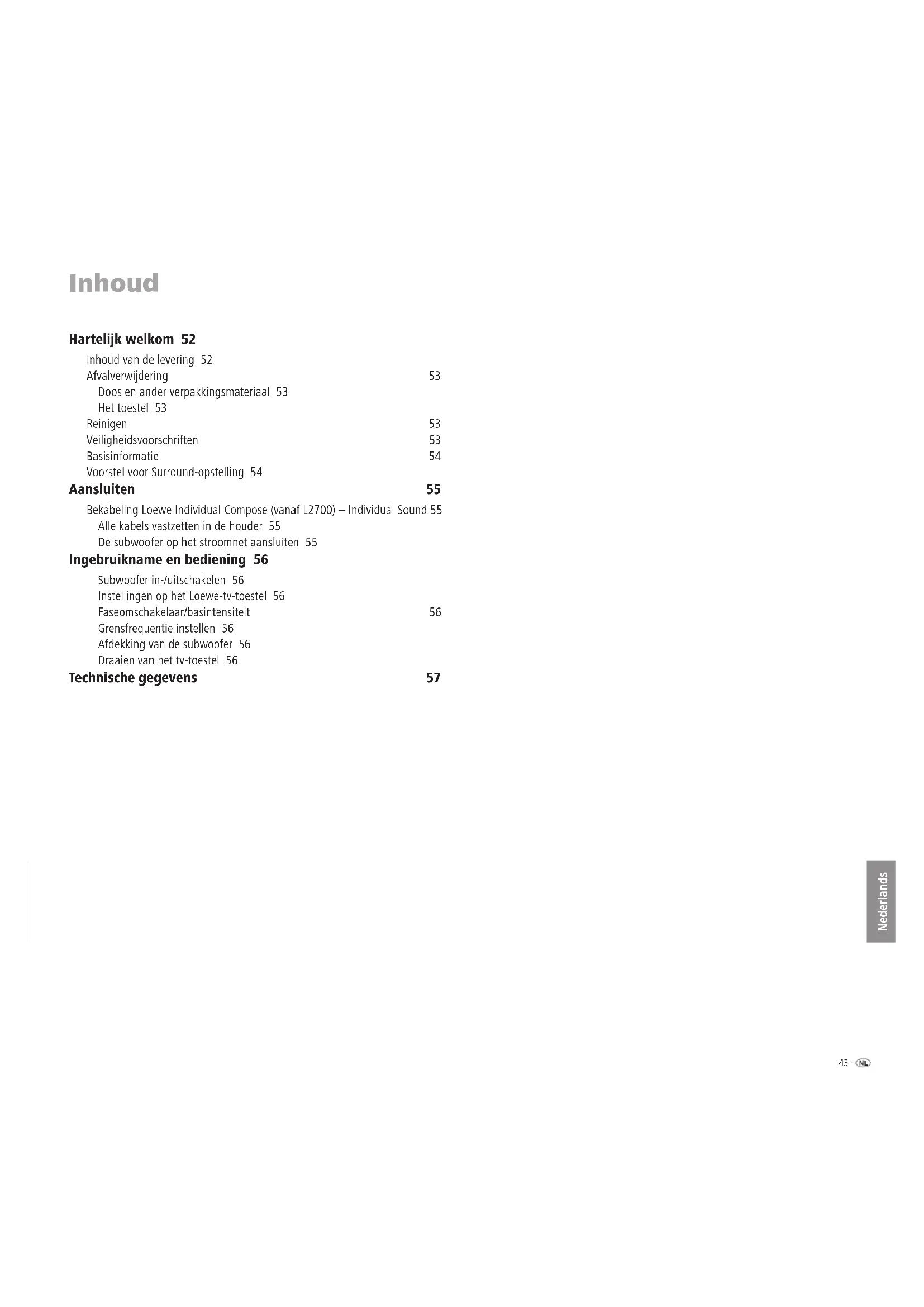 Ajuste de la frecuencia límite El regulador “Crossover Frequency“ le permite ajustar la frecuencia límite para la reproducción de graves entre 50 Hz y 250 Hz, según los altavoces que tenga conectados. En el caso del Center Stand, recomendamos ajustarlo a 120Hz. Cubierta del Subwoofer Una vez que haya realizado los ajustes descritos en “Puesta en funcionamiento y manejo“, vuelva a colocar la cubierta en la parte trasera del Subwoofer. Giro del televisor Una vez montada, la unidad formada por el televisor y su soporte puede girarse a mano lateralmente ± 45°.41 - Español Datos técnicos Center Floor Stand I Compose Dimensiones en cm Ø 50,2 x altura 53,1 Peso en kg 19,5 Principio de tres vías, disposición d‘Appolito Equipamiento 1 x graves 80 mm, membrana de papel 1 x Altavoz de tonos medios 80 mm, membrana de papel 1 x cúpula de tela recubierta para agudos, Ø 33mm Resistencia 50W (Sinus) / 90W (máx. música) Impedancia 4 -8 ohmios Gama de transmisión 120 Hz–22 kHz ± 3dB Presión acústica 84 dB spl (1w/m) CH/07/05/A1 © by Loewe Opta 2007- 42 Español43 - Nederlands Inhoud Hartelijk welkom 52 Inhoud van de levering 52 Afvalverwijdering 53 Doos en ander verpakkingsmateriaal 53 Het toestel 53 Reinigen 53 Veiligheidsvoorschriften 53 Basisinformatie 54 Voorstel voor Surround-opstelling 54 Aansluiten 55 Bekabeling Loewe Individual Compose (vanaf L2700) – Individual Sound 55 Alle kabels vastzetten in de houder 55 De subwoofer op het stroomnet aansluiten 55 Ingebruikname en bediening 56 Subwoofer in-/uitschakelen 56 Instellingen op het Loewe-tv-toestel 56 Faseomschakelaar/basintensiteit 56 Grensfrequentie instellen 56 Afdekking van de subwoofer 56 Draaien van het tv-toestel 56 Technische gegevens 57- 44 Nederlands Hartelijk welkom Wij danken u dat u voor een Loewe-product heeft gekozen. Wij zijn blij u tot onze klanten te mogen rekenen. De naam Loewe staat voor producten die zowel technisch als qua design en gebruiksvriendelijkheid aan zeer hoge eisen voldoen . Dit geldt zowel voor tv als voor dvd, video, audio en accessoires. Techniek en design mogen daarbij geen doel op zich zijn, maar moeten onze klanten een optimaal kijk- en luisterplezier verschaffen. Wij lieten ons voor het design ook niet leiden door modetrends, die snel over- waaien. U hebt zich immers een kwaliteitstoestel aangeschaft, waar u niet vlug op uitgekeken wilt zijn. Het Individual Sound-luidsprekersysteem werd afgestemd op Loewe Flat-tv-toe- stellen. Het luidsprekersysteem is individueel uitbreidbaar van een eenvoudige stereo- combinatie over een variant met vier satellietluidsprekers en een centerluid- spreker tot een uiterst hoogwaardige oplossing met vier staande luidsprekers. Daarbij behoort ook steeds de subwoofer met ingebouwde versterker. Op die manier kunt u DVD’s in Dolby Digital bioscoopkwaliteit weergeven. U kunt echter ook stereoprogramma’s of stereoweergaven (van de videorecorder of DVD-player) in Dolby ProLogic of Virtual of Circle Surround in een quasi 5.1 Surroundsignaal omzetten en met het Individual Sound-luidsprekersysteem weergeven. Als uw tv-toestel (vanaf chassis L2700) is uitgerust met een digitale tuner (DVB), wordt het ontvangen digitale Surround-signaal gedecodeerd en via de Individual Sound-installatie weergegeven. De Individual Sound-luidsprekerinstallatie wordt automatisch met het Loewe Flat-tv-toestel in- en uitgeschakeld. De instellingen voor Dolby Digital kunt u in alle gemak uitvoeren via de menu‘s van de Loewe Flat-tv. Inhoud van de levering Subwoofer I Sound, bestelnr. 66203A/D01 Subwoofer I Sound Luidsprekerkabel (6 m) Textielslang Houders voor textielslang Gebruiksaanwijzing Montage-instructies