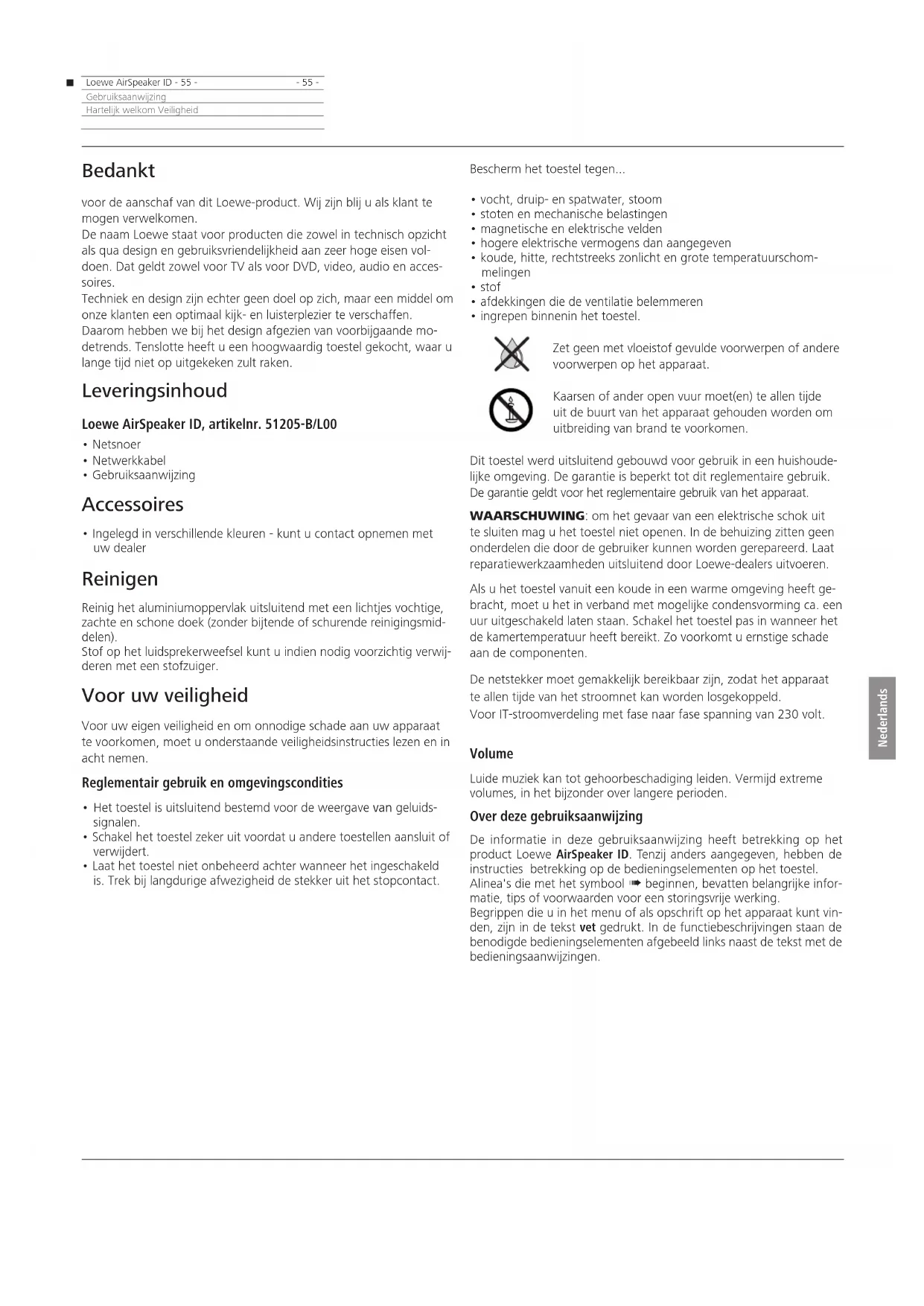 - 55 -GebruiksaanwijzingHartelijk welkom Veiligheid Bedankt voor de aanschaf van dit Loewe-product. Wij zijn blij u als klant te mogen verwelkomen. De naam Loewe staat voor producten die zowel in technisch opzicht als qua design en gebruiksvriendelijkheid aan zeer hoge eisen vol- doen. Dat geldt zowel voor TV als voor DVD, video, audio en acces- soires. Techniek en design zijn echter geen doel op zich, maar een middel om onze klanten een optimaal kijk- en luisterplezier te verschaffen. Daarom hebben we bij het design afgezien van voorbijgaande mo- detrends. Tenslotte heeft u een hoogwaardig toestel gekocht, waar u lange tijd niet op uitgekeken zult raken. Leveringsinhoud Loewe AirSpeaker ID, artikelnr. 51205-B/L00