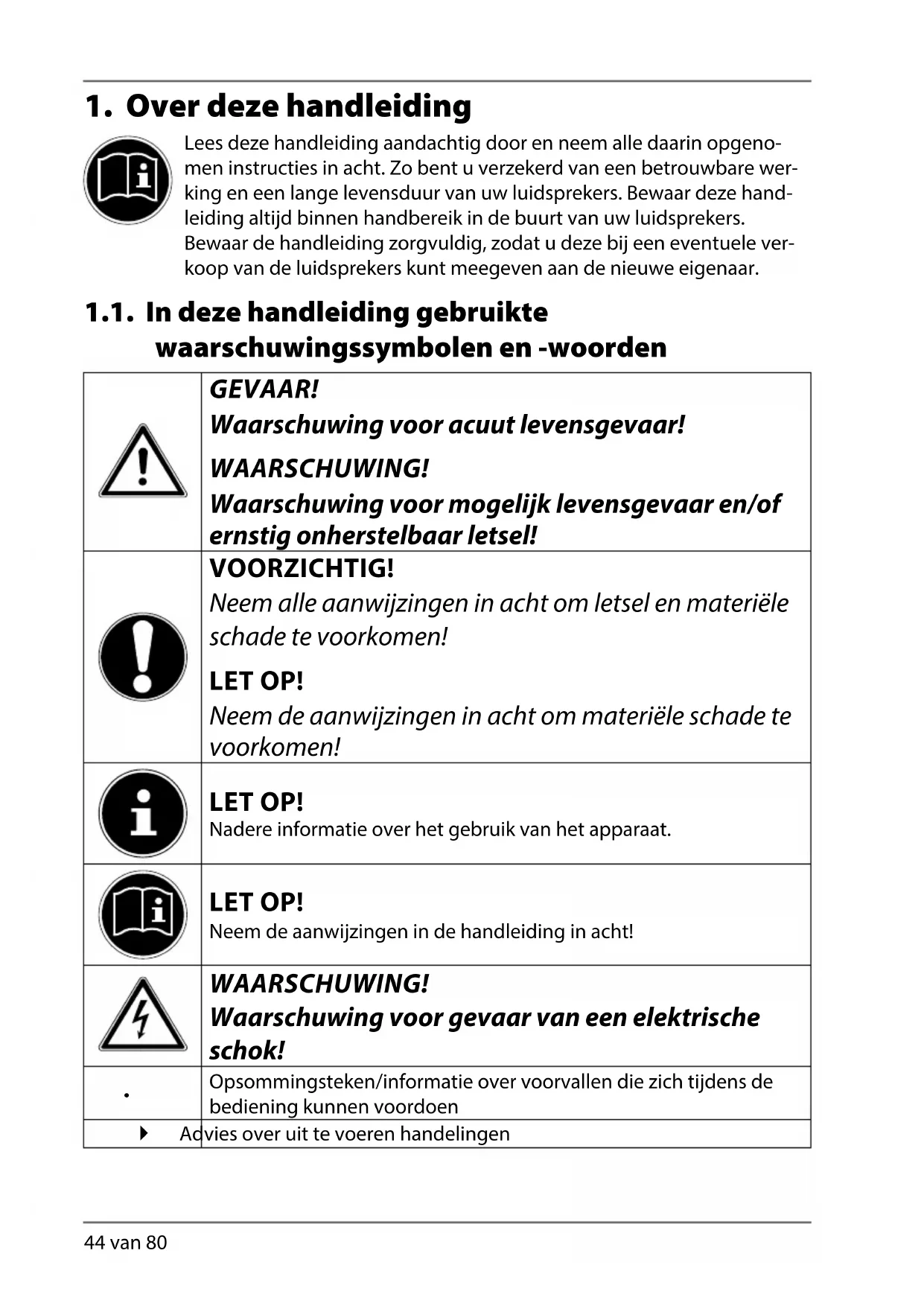 Lees deze handleiding aandachtig door en neem alle daarin opgeno- men instructies in acht. Zo bent u verzekerd van een betrouwbare wer- king en een lange levensduur van uw luidsprekers. Bewaar deze hand- leiding altijd binnen handbereik in de buurt van uw luidsprekers. Bewaar de handleiding zorgvuldig, zodat u deze bij een eventuele ver- koop van de luidsprekers kunt meegeven aan de nieuwe eigenaar. 1.1. In deze handleiding gebruikte waarschuwingssymbolen en -woorden GEVAAR! Waarschuwing voor acuut levensgevaar! WAARSCHUWING! Waarschuwing voor mogelijk levensgevaar en/of ernstig onherstelbaar letsel! VOORZICHTIG! Neem alle aanwijzingen in acht om letsel en materiële schade te voorkomen! LET OP! Neem de aanwijzingen in acht om materiële schade te voorkomen! LET OP! Nadere informatie over het gebruik van het apparaat. LET OP! Neem de aanwijzingen in de handleiding in acht! WAARSCHUWING! Waarschuwing voor gevaar van een elektrische schok!