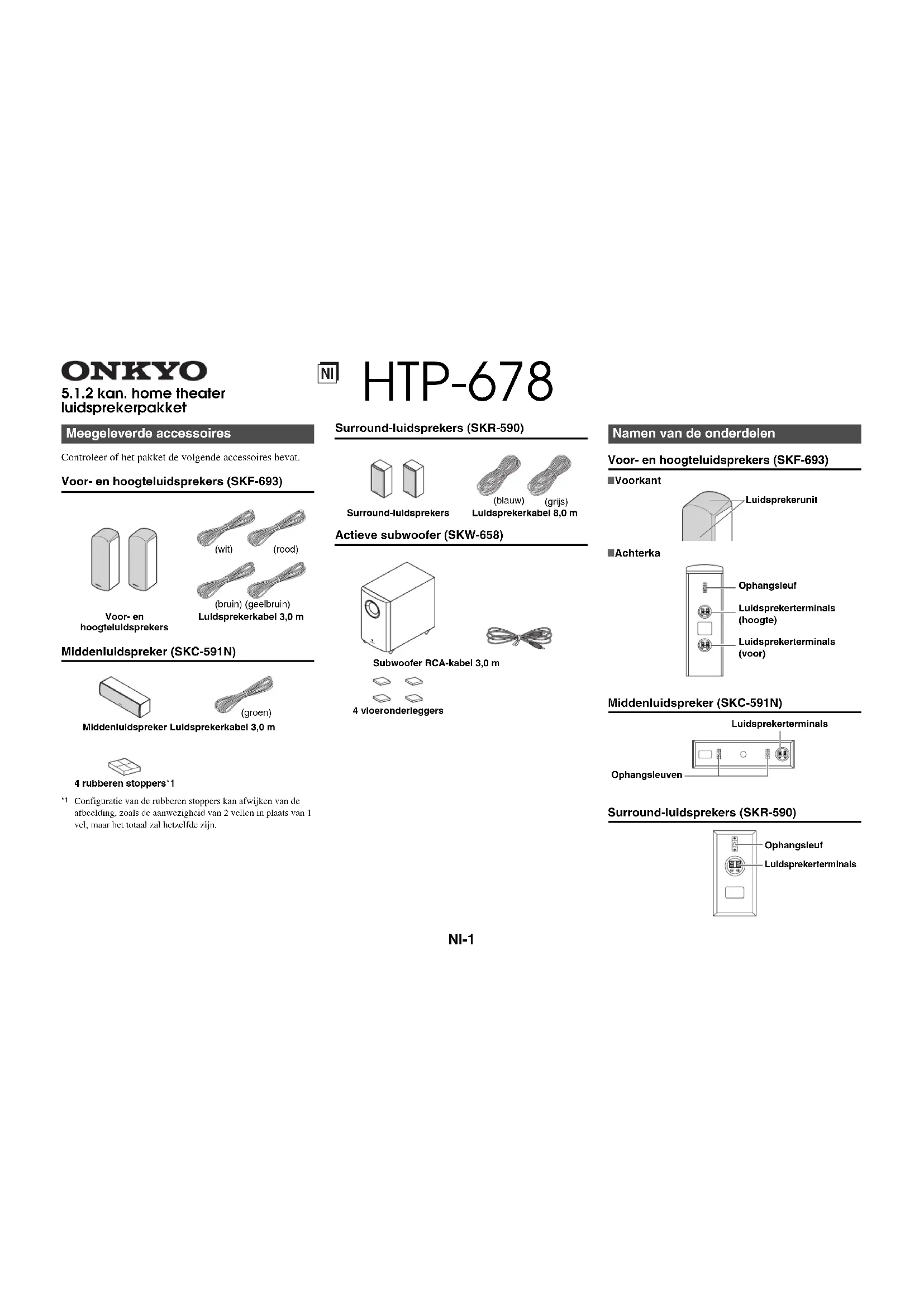 Configuratie van de rubberen stoppers kan afwijken van de afbeelding, zoals de aanwezigheid van 2 vellen in plaats van 1 vel, maar het totaal zal hetzelfde zijn. Surround-luidsprekers (SKR-590) Actieve subwoofer (SKW-658) Voor- en hoogteluidsprekers (SKF-693) Middenluidspreker (SKC-591N) Surround-luidsprekers (SKR-590) Meegeleverde accessoires Voor- en hoogteluidsprekersLuidsprekerkabel 3,0 mMiddenluidspreker Luidsprekerkabel 3,0 m4 rubberen stoppers*1 (wit)(rood) (bruin) (geelbruin) (groen) Subwoofer RCA-kabel 3,0 m4 vloeronderleggers (blauw)(grijs) Namen van de onderdelen Luidsprekerterminals(hoogte)OphangsleufLuidsprekerterminals(voor)■ Achterka■ VoorkantLuidsprekerunit LuidsprekerterminalsOphangsleuven LuidsprekerterminalsOphangsleuf HTP-678 Luidsprekerkabel 8,0 m Surround-luidsprekersNl-2 Opgelet