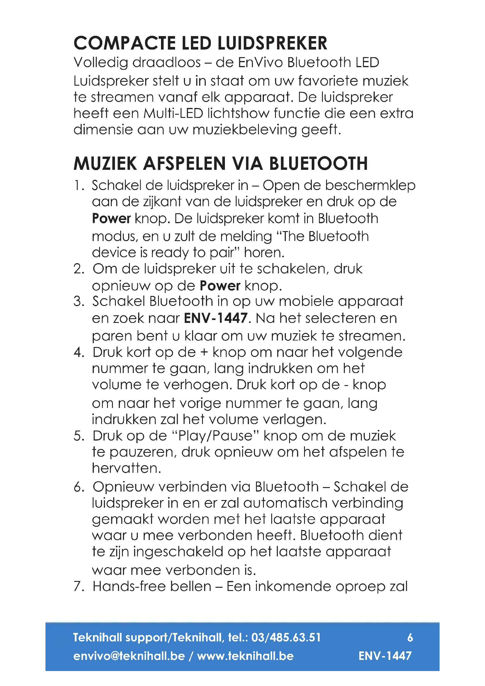 Laad de luidspreker op door de laadkabel (micro USB) in de 5V poort aan de zijkant van de luidspreker. Steek het andere uiteinde van de kabel in een voedende USB poort (5V DC) (computer of thuislader). SPATWATERDICHT Zorg dat de beschermklem correct is afgesloten om de luidspreker spatwaterdicht (IPX4) te laten zijn.Teknihall support/Teknihall, tel.: 03/485.63.51 envivo@teknihall.be / www.teknihall.be ENV-1447