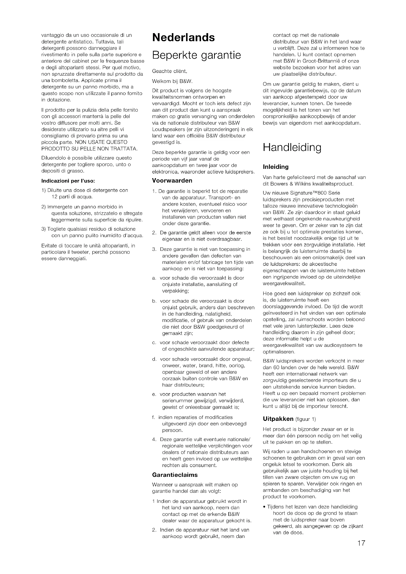 con un panno pulito inumidito d’acqua. Evitate di toccare le unità altoparlanti, in particolare il tweeter, perché possono essere danneggiati. Nederlands Beperkte garantie Geachte cliënt, Welkom bij B&W. Dit product is volgens de hoogste kwaliteitsnormen ontworpen en vervaardigd. Mocht er toch iets defect zijn aan dit product dan kunt u aanspraak maken op gratis vervanging van onderdelen via de nationale distributeur van B&W Loudspeakers (er zijn uitzonderingen) in elk land waar een officiële B&W distributeur gevestigd is. Deze beperkte garantie is geldig voor een periode van vijf jaar vanaf de aankoopdatum en twee jaar voor de elektronica, waaronder actieve luidsprekers. Voorwaarden