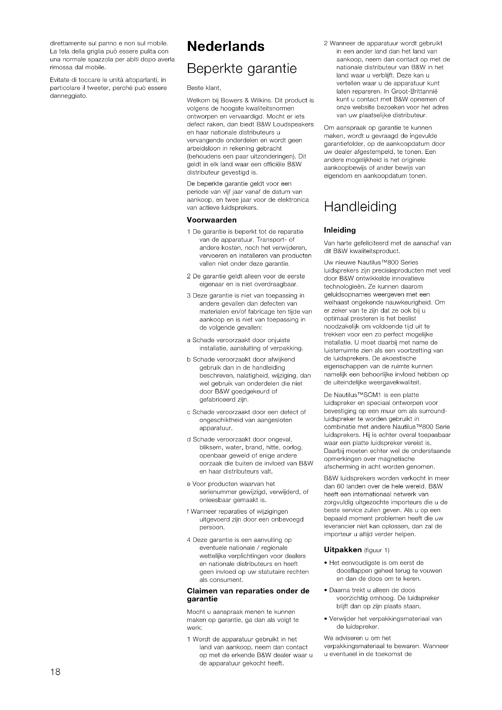 ). Più alta è la potenza utilizzata minori sono le possibilità che l’amplificatore vada in clipping. Potete spesso dire quanto sia valido un amplificatore nel pilotare carichi di diffusori difficili guardando il suo dato di potenza sia su 4 che su 8 ø. Il miglior rapporto è quello che si avvicina a 2:1 indice di una buona erogazione di corrente. Per ridurre l’effetto che hanno i cavi sulla risposta in frequenza del diffusore, bisognerebbe mantenere molto bassa l’impedenza del cavo a tutte le frequenze (misurando in serie sia i conduttori positivi che quelli negativi) e sicuramente al di sotto di 0,1 ø. Alle basse frequenze, la resistenza in corrente continua del cavo è il fattore dominante e dovreste scegliere un diametro di conduttore sufficente per ottenere l’impedenza richiesta al di là della lunghezza del cavo di cui avete bisogno. Alle medie ed alle alte frequenze la componente induttiva dell’impedenza può prevalere sulla resistenza in corrente continua. Questa ed altre proprietà influenzate dalla struttura accurata del cavo diventano importanti. Chiedete al vostro rivenditore un consiglio sui migliori cavi adatti alle vostre esigenze. Manutenzione La superficie del cabinet generalmente ha solo bisogno di essere spolverata. Se volete utilizzare un prodotto spray per pulire, rimuovete prima la griglia delicatamente dal cabinet. Spruzzate poi 17direttamente sul panno e non sul mobile. La tela della griglia può essere pulita con una normale spazzola per abiti dopo averla rimossa dal mobile. Evitate di toccare le unità altoparlanti, in particolare il tweeter, perché può essere danneggiato. Nederlands Beperkte garantie Beste klant, Welkom bij Bowers & Wilkins. Dit product is volgens de hoogste kwaliteitsnormen ontworpen en vervaardigd. Mocht er iets defect raken, dan biedt B&W Loudspeakers en haar nationale distributeurs u vervangende onderdelen en wordt geen arbeidsloon in rekening gebracht (behoudens een paar uitzonderingen). Dit geldt in elk land waar een officiële B&W distributeur gevestigd is. De beperkte garantie geldt voor een periode van vijf jaar vanaf de datum van aankoop, en twee jaar voor de elektronica van actieve luidsprekers. Voorwaarden 1 De garantie is beperkt tot de reparatie van de apparatuur. Transport- of andere kosten, noch het verwijderen, vervoeren en installeren van producten vallen niet onder deze garantie. 2 De garantie geldt alleen voor de eerste eigenaar en is niet overdraagbaar. 3 Deze garantie is niet van toepassing in andere gevallen dan defecten van materialen en/of fabricage ten tijde van aankoop en is niet van toepassing in de volgende gevallen: a Schade veroorzaakt door onjuiste installatie, aansluiting of verpakking. b Schade veroorzaakt door afwijkend gebruik dan in de handleiding beschreven, nalatigheid, wijziging, dan wel gebruik van onderdelen die niet door B&W goedgekeurd of gefabriceerd zijn. c Schade veroorzaakt door een defect of ongeschiktheid van aangesloten apparatuur. d Schade veroorzaakt door ongeval, bliksem, water, brand, hitte, oorlog, openbaar geweld of enige andere oorzaak die buiten de invloed van B&W en haar distributeurs valt. e Voor producten waarvan het serienummer gewijzigd, verwijderd, of onleesbaar gemaakt is. f Wanneer reparaties of wijzigingen uitgevoerd zijn door een onbevoegd persoon. 4 Deze garantie is een aanvulling op eventuele nationale / regionale wettelijke verplichtingen voor dealers en nationale distributeurs en heeft geen invloed op uw statutaire rechten als consument. Claimen van reparaties onder de garantie Mocht u aanspraak menen te kunnen maken op garantie, ga dan als volgt te werk: 1 Wordt de apparatuur gebruikt in het land van aankoop, neem dan contact op met de erkende B&W dealer waar u de apparatuur gekocht heeft. 2 Wanneer de apparatuur wordt gebruikt in een ander land dan het land van aankoop, neem dan contact op met de nationale distributeur van B&W in het land waar u verblijft. Deze kan u vertellen waar u de apparatuur kunt laten repareren. In Groot-Brittannië kunt u contact met B&W opnemen of onze website bezoeken voor het adres van uw plaatselijke distributeur. Om aanspraak op garantie te kunnen maken, wordt u gevraagd de ingevulde garantiefolder, op de aankoopdatum door uw dealer afgestempeld, te tonen. Een andere mogelijkheid is het originele aankoopbewijs of ander bewijs van eigendom en aankoopdatum tonen. Handleiding Inleiding Van harte gefeliciteerd met de aanschaf van dit B&W kwaliteitsproduct. Uw nieuwe Nautilus™800 Series luidsprekers zijn precisieproducten met veel door B&W ontwikkelde innovatieve technologieën. Ze kunnen daarom geluidsopnames weergeven met een welhaast ongekende nauwkeurigheid. Om er zeker van te zijn dat ze ook bij u optimaal presteren is het beslist noodzakelijk om voldoende tijd uit te trekken voor een zo perfect mogelijke installatie. U moet daarbij met name de luisterruimte zien als een voortzetting van de luidsprekers. De akoestische eigenschappen van de ruimte kunnen namelijk een behoorlijke invloed hebben op de uiteindelijke weergavekwaliteit. De Nautilus™SCM1 is een platte luidspreker en speciaal ontworpen voor bevestiging op een muur om als surround- luidspreker te worden gebruikt in combinatie met andere Nautilus™800 Serie luidsprekers. Hij is echter overal toepasbaar waar een platte luidspreker vereist is. Daarbij moeten echter wel de onderstaande opmerkingen over magnetische afscherming in acht worden genomen. B&W luidsprekers worden verkocht in meer dan 60 landen over de hele wereld. B&W heeft een internationaal netwerk van zorgvuldig uitgezochte importeurs die u de beste service zullen geven. Als u op een bepaald moment problemen heeft die uw leverancier niet kan oplossen, dan zal de importeur u altijd verder helpen. Uitpakken (figuur 1)