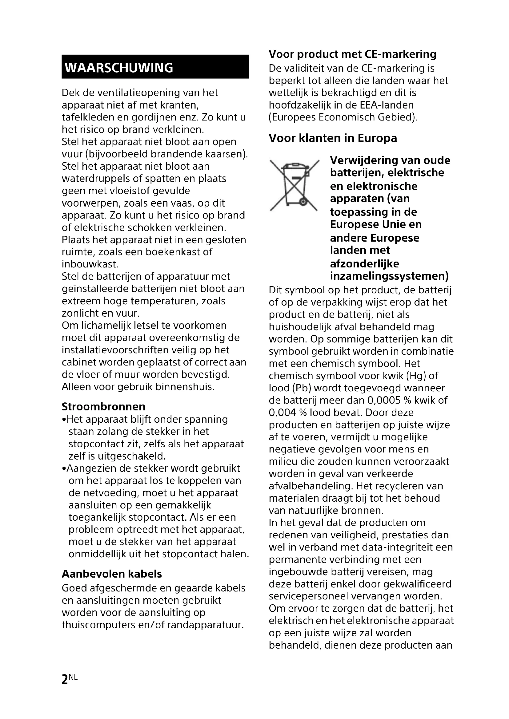 - Aangezien de stekker wordt gebruikt om het apparaat los te koppelen van de netvoeding, moet u het apparaat aansluiten op een gemakkelijk toegankelijk stopcontact. Als er een probleem optreedt met het apparaat, moet u de stekker van het apparaat onmiddellijk uit het stopcontact halen. Aanbevolen kabels Goed afgeschermde en geaarde kabels en aansluitingen moeten gebruikt worden voor de aansluiting op thuiscomputers en/of randapparatuur. Voor product met CE-markering De validiteit van de CE-markering is beperkt tot alleen die landen waar het wettelijk is bekrachtigd en dit is hoofdzakelijk in de EEA-landen (Europees Economisch Gebied). Voor klanten in Europa Verwijdering van oude batterijen, elektrische en elektronische apparaten (van toepassing in de Europese Unie en andere Europese landen met afzonderlijke inzamelingssystemen) Dit symbool op het product, de batterij of op de verpakking wijst erop dat het product en de batterij, niet als huishoudelijk afval behandeld mag worden. Op sommige batterijen kan dit symbool gebruikt worden in combinatie met een chemisch symbool. Het chemisch symbool voor kwik (Hg) of lood (Pb) wordt toegevoegd wanneer de batterij meer dan 0,0005 % kwik of 0,004 % lood bevat. Door deze producten en batterijen op juiste wijze af te voeren, vermijdt u mogelijke negatieve gevolgen voor mens en milieu die zouden kunnen veroorzaakt worden in geval van verkeerde afvalbehandeling. Het recycleren van materialen draagt bij tot het behoud van natuurlijke bronnen. In het geval dat de producten om redenen van veiligheid, prestaties dan wel in verband met data-integriteit een permanente verbinding met een ingebouwde batterij vereisen, mag deze batterij enkel door gekwalificeerd servicepersoneel vervangen worden. Om ervoor te zorgen dat de batterij, het elektrisch en het elektronische apparaat op een juiste wijze zal worden behandeld, dienen deze producten aan WAARSCHUWING3