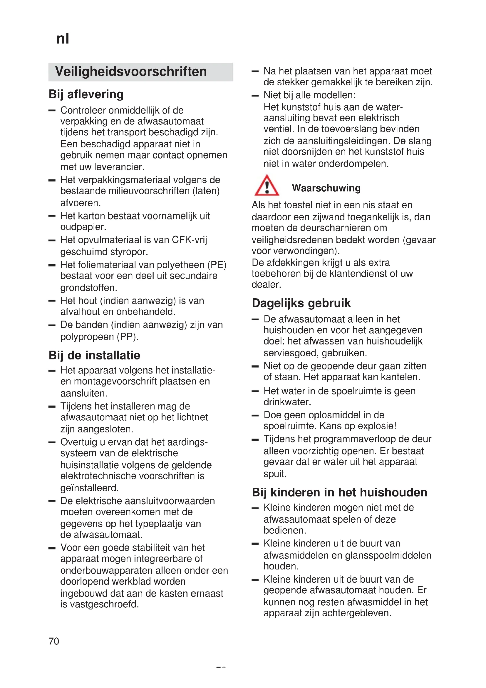 Veiligheidsvoorschriften Bij aflevering Controleer onmiddellijk of de verpakking en de afwasautomaat tijdens het transport beschadigd zijn. Een beschadigd apparaat niet in gebruik nemen maar contact opnemen met uw leverancier. Het verpakkingsmateriaal volgens de bestaande milieuvoorschriften (laten) afvoeren. Het karton bestaat voornamelijk uit oudpapier. Het opvulmateriaal is van CFK-vrij geschuimd styropor. Het foliemateriaal van polyetheen (PE) bestaat voor een deel uit secundaire grondstoffen. Het hout (indien aanwezig) is van afvalhout en onbehandeld. De banden (indien aanwezig) zijn van polypropeen (PP). Bij de installatie Het apparaat volgens het installatie- en montagevoorschrift plaatsen en aansluiten. Tijdens het installeren mag de afwasautomaat niet op het lichtnet zijn aangesloten. Overtuig u ervan dat het aardings- systeem van de elektrische huisinstallatie volgens de geldende elektrotechnische voorschriften is geïnstalleerd. De elektrische aansluitvoorwaarden moeten overeenkomen met de gegevens op het typeplaatje van de afwasautomaat. Voor een goede stabiliteit van het apparaat mogen integreerbare of onderbouwapparaten alleen onder een doorlopend werkblad worden ingebouwd dat aan de kasten ernaast is vastgeschroefd. Na het plaatsen van het apparaat moet de stekker gemakkelijk te bereiken zijn. Niet bij alle modellen: Het kunststof huis aan de water- aansluiting bevat een elektrisch ventiel. In de toevoerslang bevinden zich de aansluitingsleidingen. De slang niet doorsnijden en het kunststof huis niet in water onderdompelen. Waarschuwing Als het toestel niet in een nis staat en daardoor een zijwand toegankelijk is, dan moeten de deurscharnieren om veiligheidsredenen bedekt worden (gevaar voor verwondingen). De afdekkingen krijgt u als extra toebehoren bij de klantendienst of uw dealer. Dagelijks gebruik De afwasautomaat alleen in het huishouden en voor het aangegeven doel: het afwassen van huishoudelijk serviesgoed, gebruiken. Niet op de geopende deur gaan zitten of staan. Het apparaat kan kantelen. Het water in de spoelruimte is geen drinkwater. Doe geen oplosmiddel in de spoelruimte. Kans op explosie! Tijdens het programmaverloop de deur alleen voorzichtig openen. Er bestaat gevaar dat er water uit het apparaat spuit. Bij kinderen in het huishouden Kleine kinderen mogen niet met de afwasautomaat spelen of deze bedienen. Kleine kinderen uit de buurt van afwasmiddelen en glansspoelmiddelen houden. Kleine kinderen uit de buurt van de geopende afwasautomaat houden. Er kunnen nog resten afwasmiddel in het apparaat zijn achtergebleven.nl