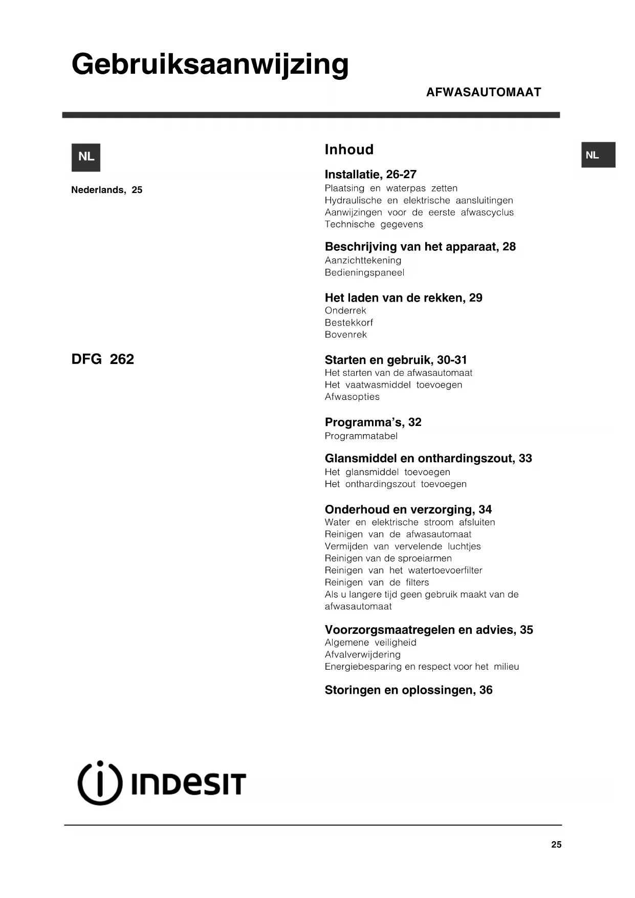 DFG 262 EU - Vaatwassers INDESIT - Gratis gebruiksaanwijzing en handleiding