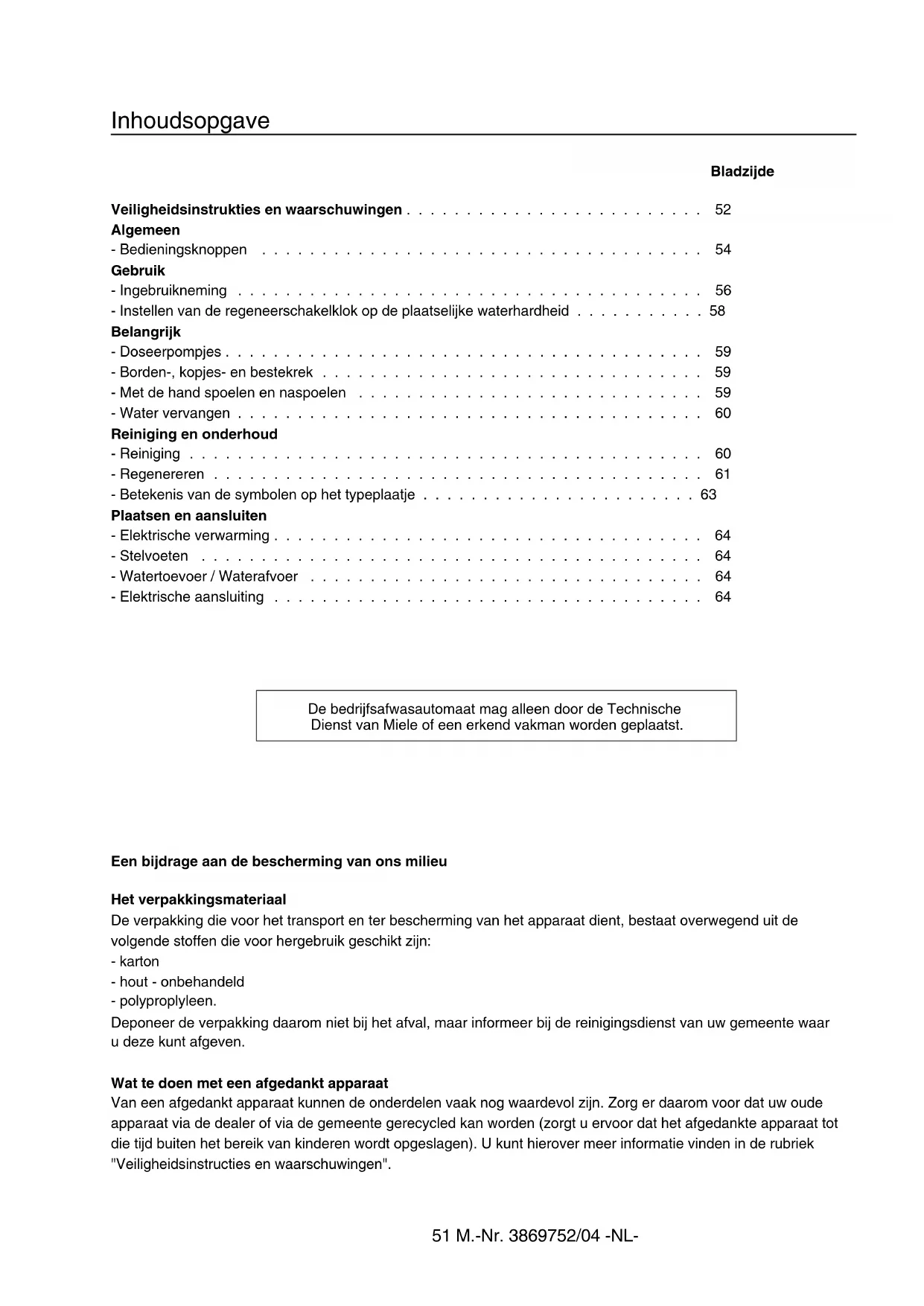 C ). Als de afwasautomaat op koud water wordt aangesloten leidt dat tot een vermindering van de bordencapaciteit en tevens tot een ho- ger energieverbruik. Plaats de automaat horizontaal door de stel- voeten te verstellen. Het apparaat moet met spanstrips aan de vloer worden bevestigd als het apparaat zon- der aanvoertafel wordt geplaatst. Om eventuele vorstschade te voorkomen mag het apparaat in geen geval in vorstgevoe- lige ruimtes worden geplaatst. M.-Nr. 3869752/04 -NL- 6465 M.-Nr. 3869752/04 -NL-Nederland: Miele Nederland B.V. Postbus 166 (postadres), 4130 ED Vianen telefoon: (03 47) 37 89 11 France: