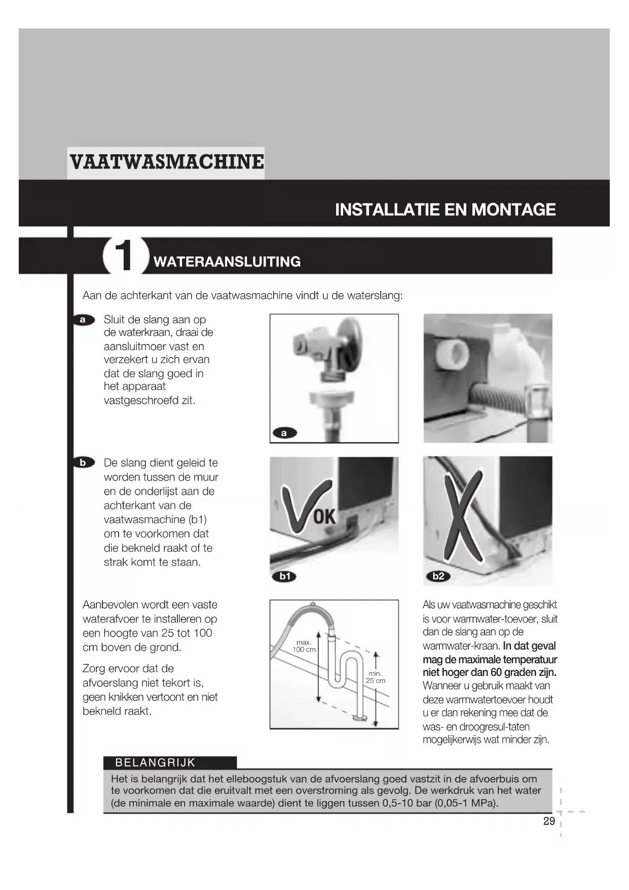 Als uw vaatwasmachine geschikt is voor warmwater-toevoer, sluit dan de slang aan op de warmwater-kraan. In dat geval mag de maximale temperatuur niet hoger dan 60 graden zijn. Wanneer u gebruik maakt van deze warmwatertoevoer houdt u er dan rekening mee dat de was- en droogresul-taten mogelijkerwijs wat minder zijn. max. 100 cm min. 25 cmHet is belangrijk dat het elleboogstuk van de afvoerslang goed vastzit in de afvoerbuis om te voorkomen dat die eruitvalt met een overstroming als gevolg. De werkdruk van het water (de minimale en maximale waarde) dient te liggen tussen 0,5-10 bar (0,05-1 MPa).BELANGRIJK Sluit de slang aan op de waterkraan, draai de aansluitmoer vast en verzekert u zich ervan dat de slang goed in het apparaat vastgeschroefd zit. Aan de achterkant van de vaatwasmachine vindt u de waterslang: