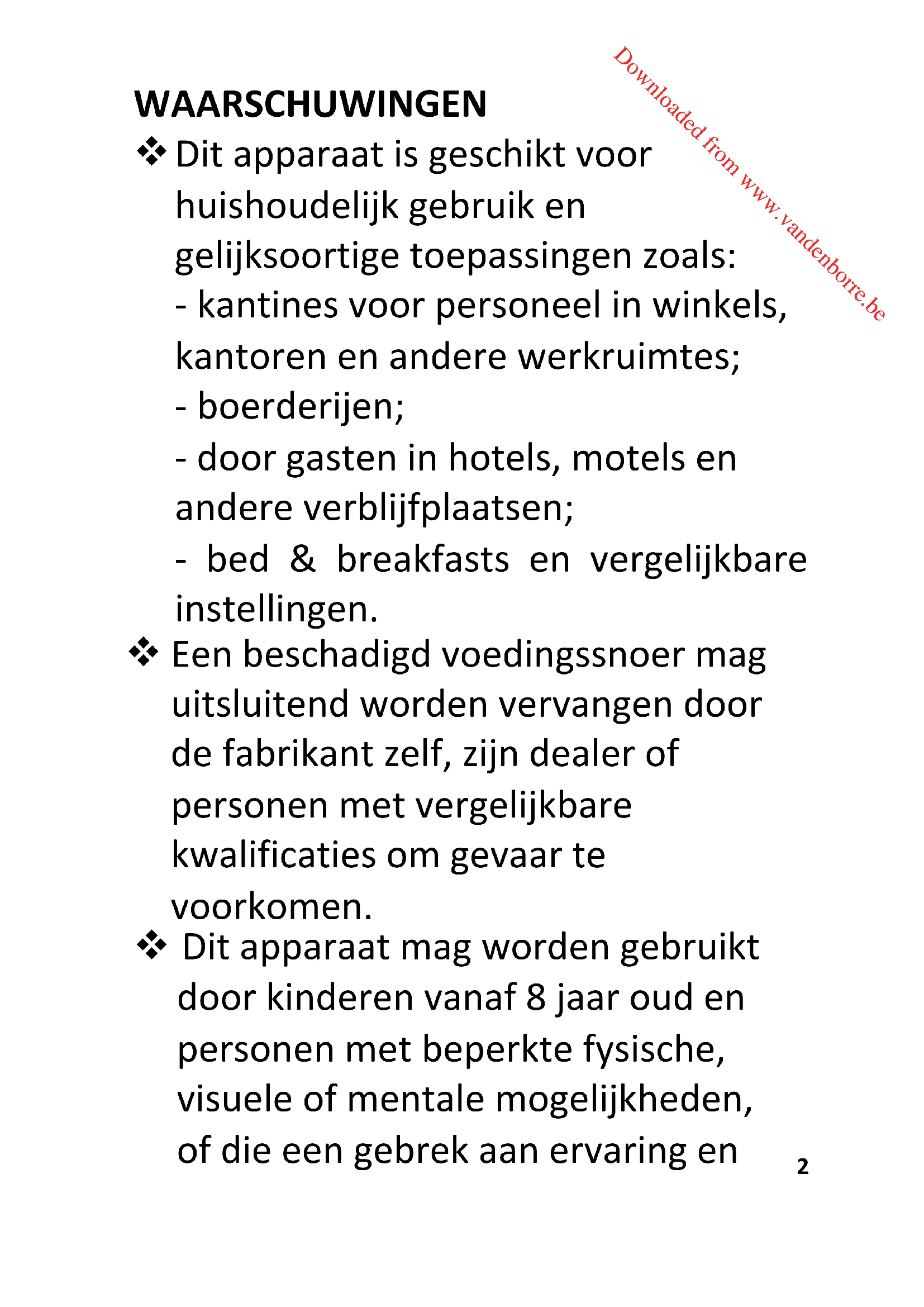 Dit apparaat is geschikt voor huishoudelijk gebruik en gelijksoortige toepassingen zoals: - kantines voor personeel in winkels, kantoren en andere werkruimtes; - boerderijen; - door gasten in hotels, motels en andere verblijfplaatsen; - bed & breakfasts en vergelijkbare instellingen. Downloaded from www.vandenborre.bekennis hebben indien ze gepaste instructies hebben gekregen zodat ze het apparaat op een veilige manier kunnen gebruiken en op de hoogte zijn van de gevaren die het gebruik van het apparaat met zich meebrengt. Laat kinderen niet met het apparaat spelen. Kinderen mogen het apparaat niet zonder toezicht reinigen of onderhouden. De openingen mogen niet worden belemmerd door een vloerkleed. Messen en ander kookgerei met scherpe punten moeten met de punt naar beneden gericht in de bestekkorf geplaatst of horizontaal worden neergelegd.