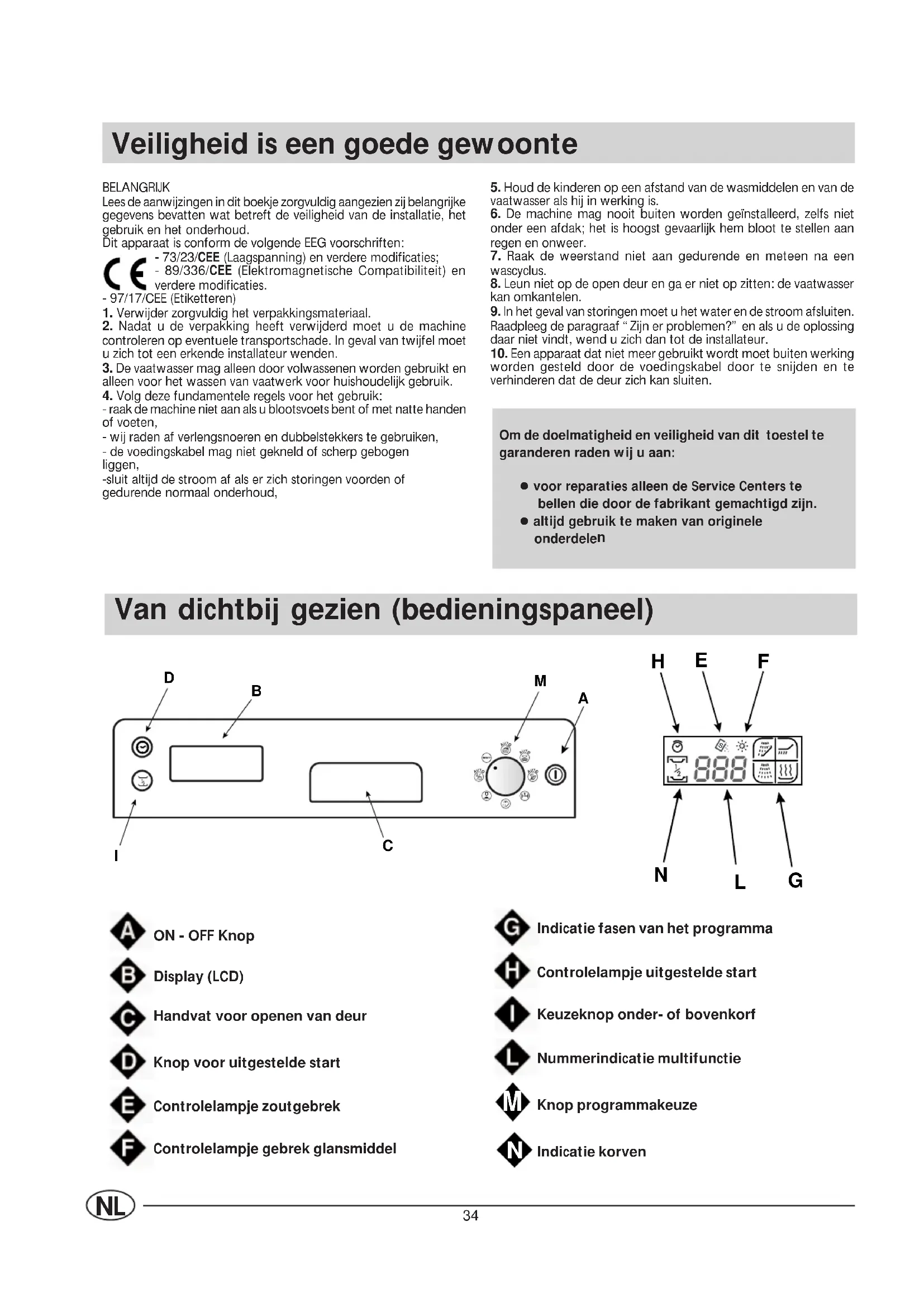 Veiligheid is een goede gewoonte BELANGRIJKLees de aanwijzingen in dit boekje zorgvuldig aangezien zij belangrijkegegevens bevatten wat betreft de veiligheid van de installatie, hetgebruik en het onderhoud.Dit apparaat is conform de volgende EEG voorschriften: - 73/23/CEE (Laagspanning) en verdere modificaties; - 89/336/CEE (Elektromagnetische Compatibiliteit) enverdere modificaties.- 97/17/CEE (Etiketteren)1. Verwijder zorgvuldig het verpakkingsmateriaal.2. Nadat u de verpakking heeft verwijderd moet u de machinecontroleren op eventuele transportschade. In geval van twijfel moetu zich tot een erkende installateur wenden.3. De vaatwasser mag alleen door volwassenen worden gebruikt enalleen voor het wassen van vaatwerk voor huishoudelijk gebruik.4. Volg deze fundamentele regels voor het gebruik:- raak de machine niet aan als u blootsvoets bent of met natte handenof voeten,- wij raden af verlengsnoeren en dubbelstekkers te gebruiken,- de voedingskabel mag niet gekneld of scherp gebogenliggen,-sluit altijd de stroom af als er zich storingen voorden ofgedurende normaal onderhoud,5. Houd de kinderen op een afstand van de wasmiddelen en van devaatwasser als hij in werking is.6. De machine mag nooit buiten worden geïnstalleerd, zelfs nietonder een afdak; het is hoogst gevaarlijk hem bloot te stellen aanregen en onweer.7. Raak de weerstand niet aan gedurende en meteen na eenwascyclus.8. Leun niet op de open deur en ga er niet op zitten: de vaatwasserkan omkantelen.9. In het geval van storingen moet u het water en de stroom afsluiten.Raadpleeg de paragraaf “Zijn er problemen?” en als u de oplossingdaar niet vindt, wend u zich dan tot de installateur.10. Een apparaat dat niet meer gebruikt wordt moet buiten werkingworden gesteld door de voedingskabel door te snijden en teverhinderen dat de deur zich kan sluiten.Om de doelmatigheid en veiligheid van dit toestel tegaranderen raden wij u aan:l voor reparaties alleen de Service Centers te bellen die door de fabrikant gemachtigd zijn.l altijd gebruik te maken van originele onderdele