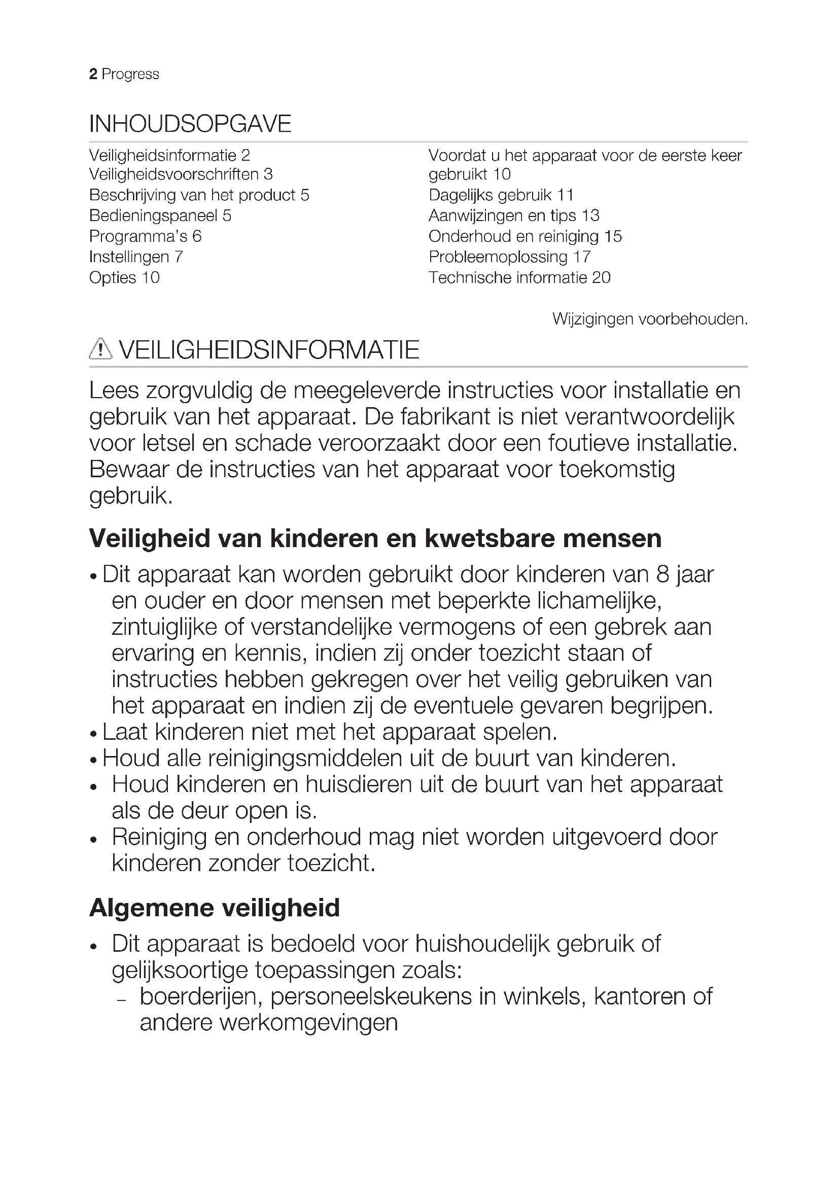 Als het hete water door een alternatieve, milieuvriendelijkere energiebron geproduceerd wordt (bijv. zonnepanelen en windenergie), gebruik dan een heetwatervoorziening om het energieverbruik te verminderen. MILIEUBESCHERMING Recycle de materialen met het symbool . Gooi de verpakking in een geschikte verzamelcontainer om het te recyclen. Help om het milieu en de volksgezondheid te beschermen en recycle het afval van elektrische en elektronische apparaten. Gooi apparaten gemarkeerd met het symbool niet weg met het huishoudelijk afval. Breng het product naar het milieustation bij u in de buurt of neem contact op met de gemeente. Progress 21CONTENTS Safety information 22 Safety instructions 23 Product description 25 Control panel 25 Programmes 26 Settings 27 Options 29 Before first use 30 Daily use 31 Hints and tips 32 Care and cleaning 34 Troubleshooting 36 Technical information 39 Subject to change without notice. SAFETY INFORMATION Before the installation and use of the appliance, carefully read the supplied instructions. The manufacturer is not responsible if an incorrect installation and use causes injuries and damages. Always keep the instructions with the appliance for future reference. Children and vulnerable people safety