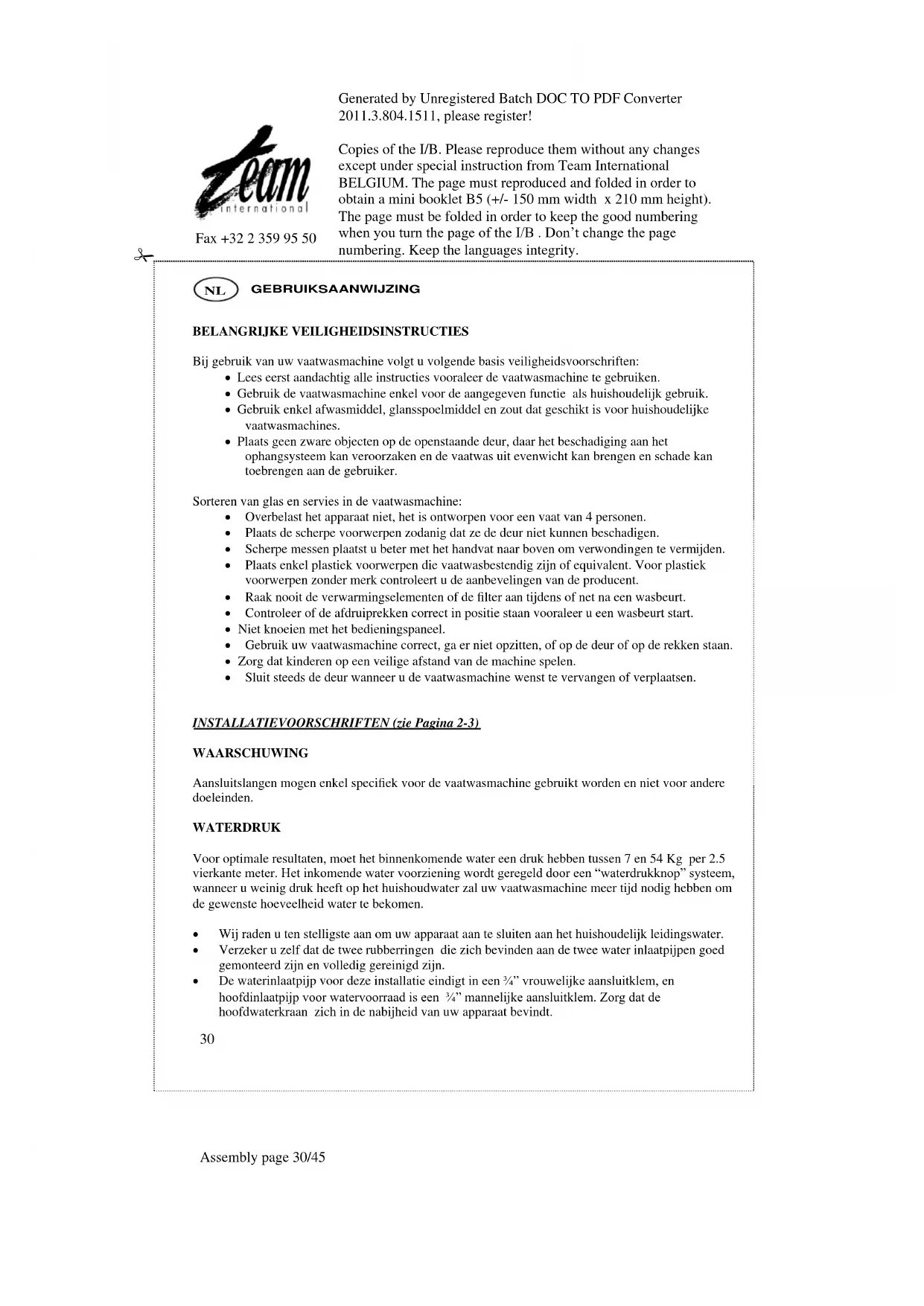 Schakel uw apparaat uit en trek de stekker uit het stopcontact. Draai de watertoevoer af en draai de wateraansluitpijp van de kraan, vergget niet dat de waterpijp onderdruk. Sluit de afvoerpijp af, vergeet echter niet dat er zich nog water in de pijp kan bevinden dus ledig deze in de afvoerpijp. Er kan zich nog water in het apparaat bevinden , wees dus voorzichtig wanneer u het verplaatst.Generated by Unregistered Batch DOC TO PDF Converter 2011.3.804.1511, please register! Copies of the I/B. Please reproduce them without any changes except under special instruction from Team International BELGIUM. The page must reproduced and folded in order to obtain a mini booklet B5 (+/- 150 mm width x 210 mm height). The page must be folded in order to keep the good numbering when you turn the page of the I/B . Don‟t change the page numbering. Keep the languages integrity.