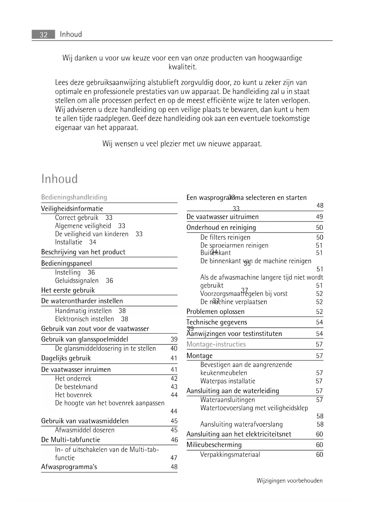 - Éliminez le loquet de la porte, cela évitera aux enfants de s'enfermer dans l'appareil et de mettre ainsi leur vie en danger. Branchement électrique 31Wij danken u voor uw keuze voor een van onze producten van hoogwaardige kwaliteit. Lees deze gebruiksaanwijzing alstublieft zorgvuldig door, zo kunt u zeker zijn van optimale en professionele prestaties van uw apparaat. De handleiding zal u in staat stellen om alle processen perfect en op de meest efficiënte wijze te laten verlopen. Wij adviseren u deze handleiding op een veilige plaats te bewaren, dan kunt u hem te allen tijde raadplegen. Geef deze handleiding ook aan een eventuele toekomstige eigenaar van het apparaat. Wij wensen u veel plezier met uw nieuwe apparaat. Inhoud Bedieningshandleiding 33 Veiligheidsinformatie 33 Correct gebruik 33 Algemene veiligheid 33 De veiligheid van kinderen 33 Installatie 34 Beschrijving van het product 34 Bedieningspaneel 35 Instelling 36 Geluidssignalen 36 Het eerste gebruik 37 De waterontharder instellen 37 Handmatig instellen 38 Elektronisch instellen 38 Gebruik van zout voor de vaatwasser 39 Gebruik van glansspoelmiddel 39 De glansmiddeldosering in te stellen 40 Dagelijks gebruik 41 De vaatwasser inruimen 41 Het onderrek 42 De bestekmand 43 Het bovenrek 44 De hoogte van het bovenrek aanpassen