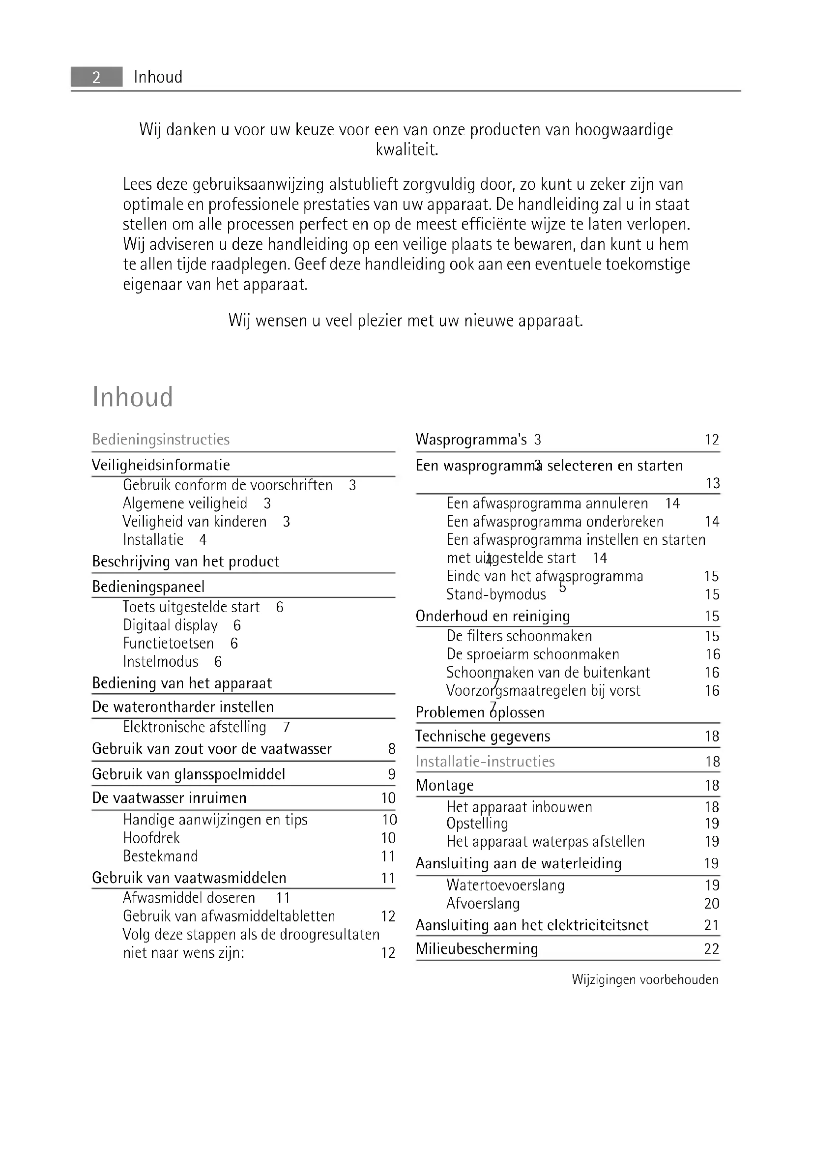 Een afwasprogramma annuleren 14 Een afwasprogramma onderbreken 14 Een afwasprogramma instellen en starten met uitgestelde start 14 Einde van het afwasprogramma 15 Stand-bymodus 15 Onderhoud en reiniging 15 De filters schoonmaken 15 De sproeiarm schoonmaken 16 Schoonmaken van de buitenkant 16 Voorzorgsmaatregelen bij vorst 16 Problemen oplossen 16 Technische gegevens 18 Installatie-instructies 18 Montage 18 Het apparaat inbouwen 18 Opstelling 19 Het apparaat waterpas afstellen 19 Aansluiting aan de waterleiding 19 Watertoevoerslang 19 Afvoerslang 20 Aansluiting aan het elektriciteitsnet 21 Milieubescherming 22 Wijzigingen voorbehouden