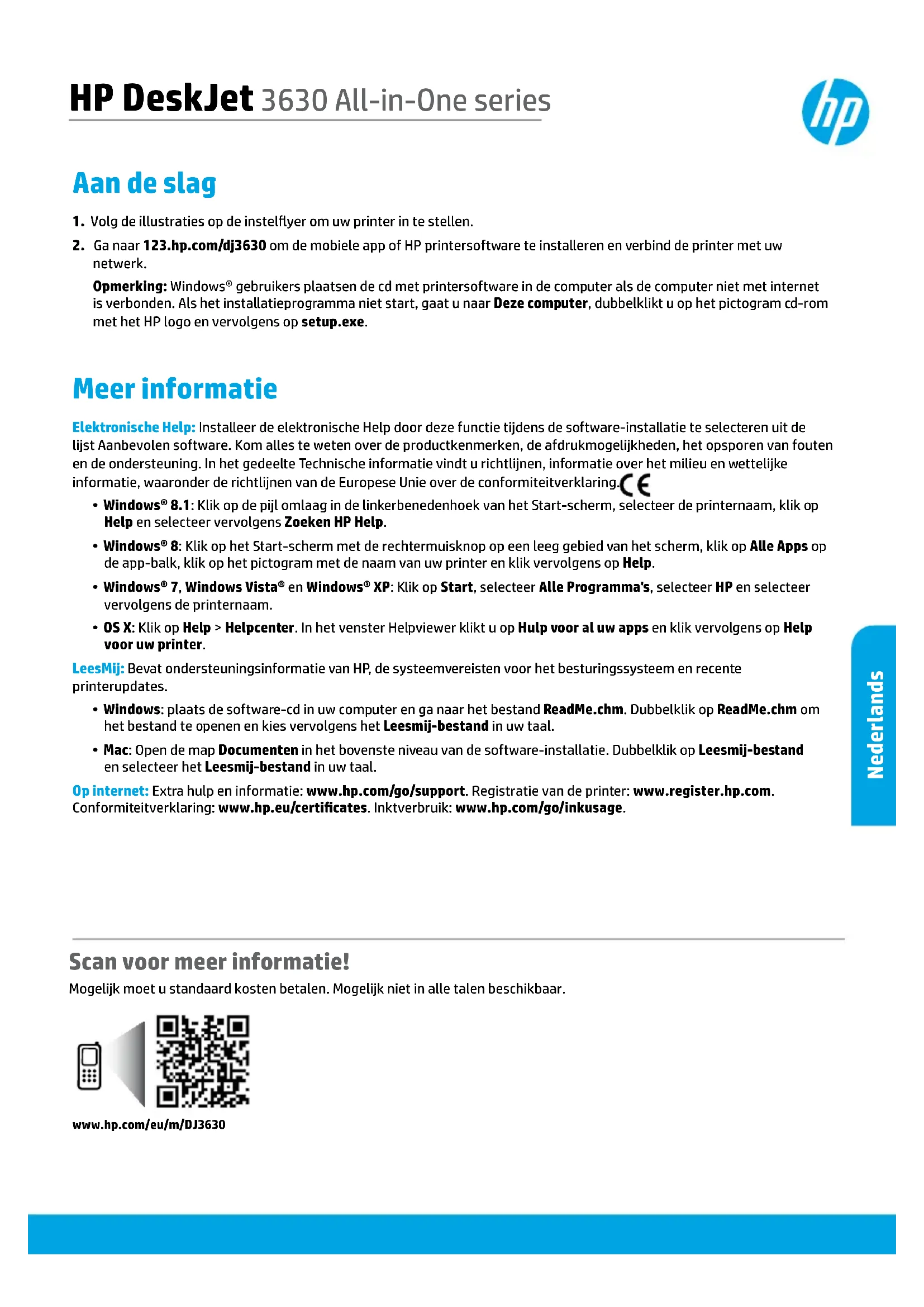 fabrieksgarantie. Nederland: Hewlett-Packard Nederland BV, Startbaan 16, 1187 XR Amstelveen België : Hewlett-Packard, BVBA/SPRL, P.O. Naast deze fabrieksgarantie kunt u op basis van nationale wetgeving ten opzichte van uw verkoper rechten ontlenen aan de verkoopovereenkomst. De HP-fabrieksgarantie laat de wettelijke rechten onder de toepasselijke nationale wetgeving ongemoeid. HP-product Duur van beperkte garantie Softwaremedia 90 dagen Printer 1 jaar Print- of inktcartridges Tot het HP-cartridge leeg is of de "einde garantie"-datum (vermeld op de inktcartridge) is bereikt, afhankelijk van wat het eerst van toepassing is. Deze garantie dekt geen HP-inktproducten die opnieuw zijn gevuld, opnieuw zijn gefabriceerd of zijn gerepareerd, noch HP-inktproducten die op verkeerde wijze zijn gebruikt of behandeld. Printkoppen (geldt alleen voor producten met printkoppen 1 jaar die door de klant kunnen worden vervangen) Accessoires 1 jaar tenzij anders vermeld Nederlandswww.hp.com/eu/m/DJ3630 Skanna koden så får du veta mer! Standardavgifter för dataöverföring kan tillämpas. Informationen kanske inte är tillgänglig på alla språk. Läs mer Elektronisk hjälp: Installera den elektroniska hjälpen genom att välja den i listan över rekommenderad programvara under programvaruinstallationen. Läs mer om produktfunktioner, utskrift, felsökning och support. Få aviseringar och information om miljö och regleringar, inklusive information om bestämmelser inom EU och regelefterlevnad, i avsnittet Teknisk information.