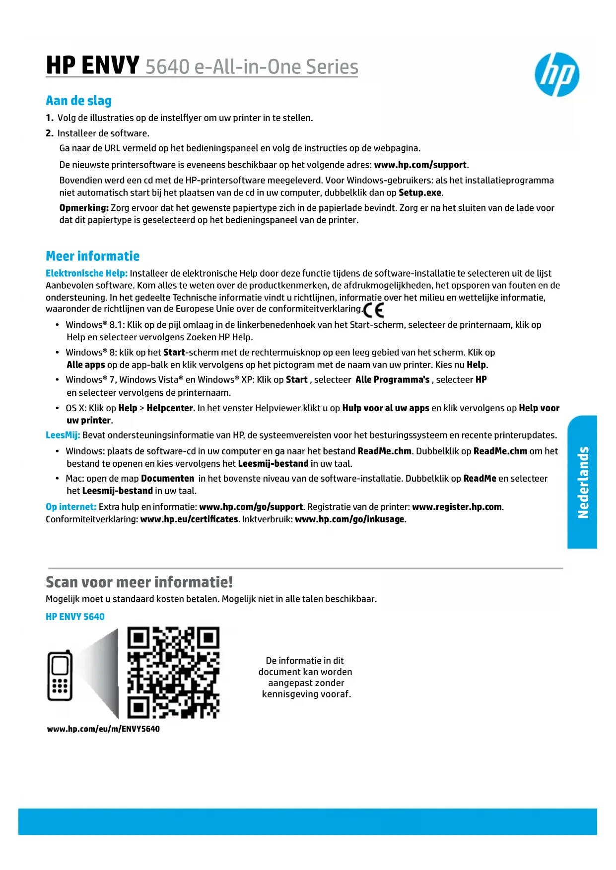 fabrieksgarantie. Nederland: Hewlett-Packard Nederland BV, Startbaan 16, 1187 XR Amstelveen België : Hewlett-Packard, BVBA/SPRL, P.O. Naast deze fabrieksgarantie kunt u op basis van nationale wetgeving ten opzichte van uw verkoper rechten ontlenen aan de verkoopovereenkomst. De HP-fabrieksgarantie laat de wettelijke rechten onder de toepasselijke nationale wetgeving ongemoeid. HP-product Duur van beperkte garantie Softwaremedia 90 dagen Printer 1 jaar Print- of inktcartridges Tot het HP-cartridge leeg is of de "einde garantie"-datum (vermeld op de inktcartridge) is bereikt, afhankelijk van wat het eerst van toepassing is. Deze garantie dekt geen HP-inktproducten die opnieuw zijn gevuld, opnieuw zijn gefabriceerd of zijn gerepareerd, noch HP-inktproducten die op verkeerde wijze zijn gebruikt of behandeld. Printkoppen (geldt alleen voor producten met printkoppen 1 jaar die door de klant kunnen worden vervangen) Accessoires 1 jaar tenzij anders vermeld Nederlandswww.hp.com/eu/m/ENVY5640Informationen i det här dokumentet kan komma att bli inaktuell utan föregående meddelande. Skanna koden så får du veta mer! Standardavgifter för dataöverföring kan tillämpas. Informationen kanske inte är tillgänglig på alla språk. Lär dig mer Elektronisk hjälp: Installera den elektroniska hjälpen genom att välja den i listan över rekommenderad programvara under programvaruinstallationen. Lär dig mer om produktfunktioner, utskrift, felsökning och support. Få aviseringar och information om miljö och regleringar, inklusive information om bestämmelser inom EU och regelefterlevnad, i avsnittet Teknisk information.