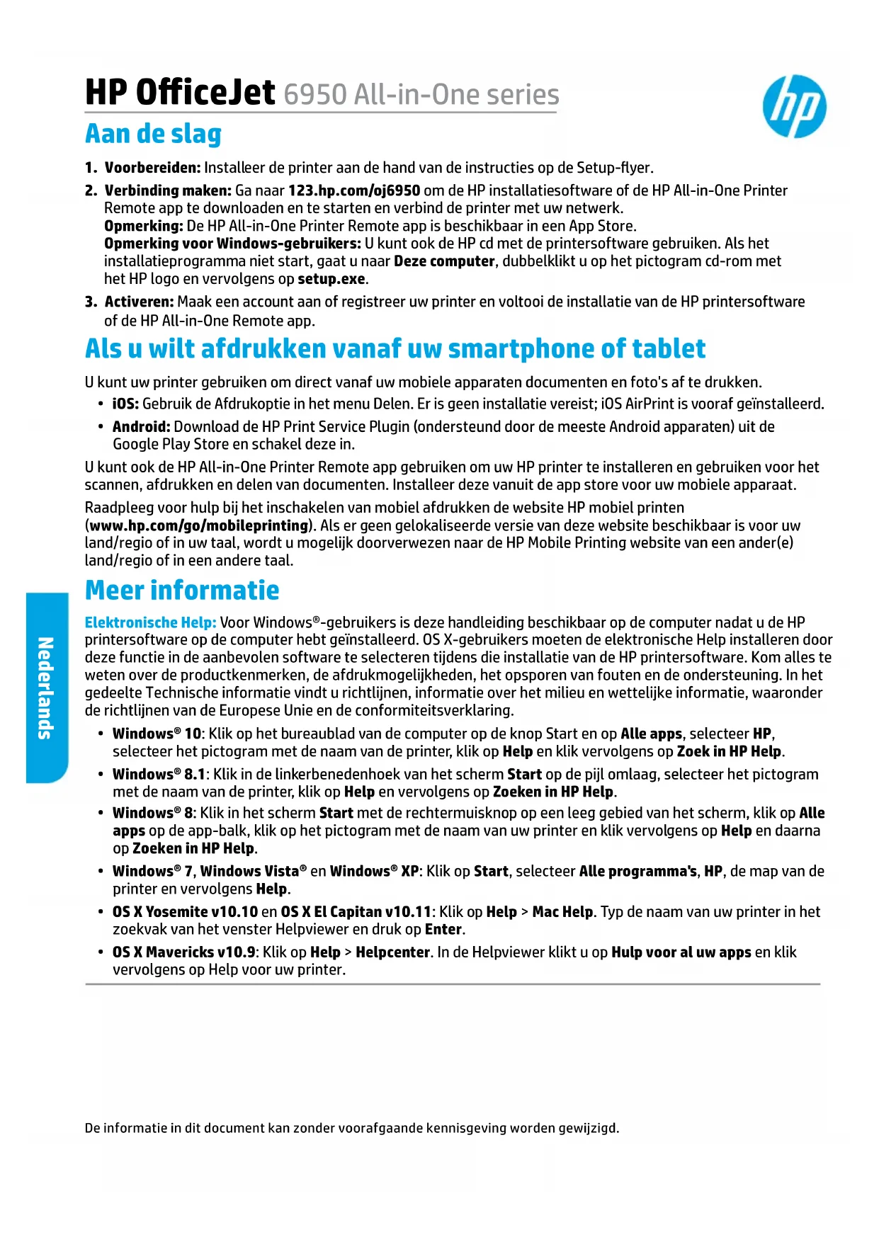 echten. De wettelijke rechten van de consument worden op geen enkele wijze beperkt of beïnvloed door de Beperkte Garantie van HP. Raadpl eeg voor meer informatie de volgende webpagina: Wettelijke garantie van de consument of u kan de website van het Eur opees Consumenten Centrum bezoeken. Consumenten hebben het recht om te kiezen tussen enerzijds de Beperkte Garantie van HP o f anderzijds het aanspreken van de verkoper in toepassing van de wettelijke garantie. Klik v oor meer informatie op de volgende link: Wettelijke Garantie Consument (www.hp.com/go/eu-legal) of raadpleeg de website van het Eur opees Consumenten Centrum (http:// ec.europa.eu/consumers/solving_consumer_disputes/non-judicial_redress/ecc-net/). HP-product Duur van beperkte garantie Printer 1 jaar garantie op hardware Print- of inktcartridges Tot het HP-cartridge leeg is of de "einde garantie"-datum (vermeld op de inktcartridge) is bereikt, afhankelijk van wat het eerst van toepassing is. Deze garantie dekt geen HP-inktproducten die opnieuw zijn gevuld, opnieuw zijn gefabriceerd of zijn gerepareerd, noch HP-inktproducten die op verkeerde wijze zijn gebruikt of behandeld. Printkoppen (geldt alleen voor producten met printkoppen 1 jaar die door de klant kunnen worden vervangen) Accessoires 1 jaar tenzij anders vermeld NederlandsHP OiceJet 6950 All-in-One series Oplysningerne heri kan ændres uden varsel. Kom godt i gang