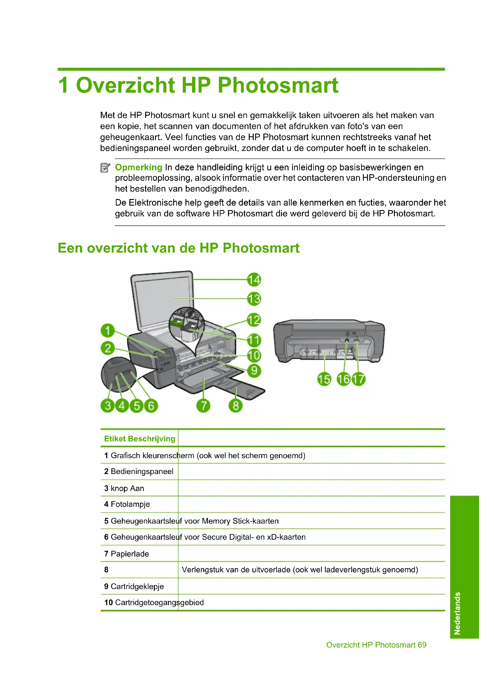 Etiket Naam en beschrijving 1 Terug: hiermee gaat u terug naar de vorige dia. 2 Cancel (Annuleren): hiermee stopt u de huidige bewerking, gaat u terug naar de standaard instellingen, en wordt de huidige fotoselectie gewist. 3 OK: hiermee selecteert u een menu-instelling, waarde of foto. 4 Scannen: hiermee opent u vanuit het beginscherm Menu Scannen. Wanneer u andere schermen dan het beginscherm bekijkt, selecteert u hiermee opties in verband met het huidige display. 5 Foto: hiermee opent u vanuit het beginscherm Menu Foto. Wanneer u andere schermen dan het beginscherm bekijkt, selecteert u hiermee opties in verband met het huidige display. 6 Kopiëren: hiermee opent u vanuit het beginscherm Menu Kopiëren. Wanneer u andere schermen dan het beginscherm bekijkt, selecteert u hiermee opties in verband met het huidige display. Hoofdstuk 1 (vervolg) 70 HP Photosmart C4600 serie NederlandsMeer informatie zoeken Er is een scala aan bronnen beschikbaar, zowel gedrukt als elektronisch, waarin u informatie kunt vinden over het instellen en gebruiken van de HP Photosmart. Startershandleiding De startershandleiding bevat instructies voor de installatie van de HP Photosmart. Zorg dat u de stappen uit de startershandleiding in de juiste volgorde uitvoert. Als u problemen ondervindt tijdens de installatie, raadpleegt u het gedeelte Problemen oplossen achter in de startershandleiding of het gedeelte " Problemen oplossen en ondersteuning" op pagina 81 in deze handleiding. Elektronische Help In de elektronische Help vindt u uitgebreide instructies voor functies van de HP Photosmart die niet worden beschreven in deze handleiding, waaronder functies die alleen beschikbaar zijn met de HP Photosmart-software. De elektronische Help biedt ook informatie over bepaalde voorschriften en het milieu. De elektronische Help openen: