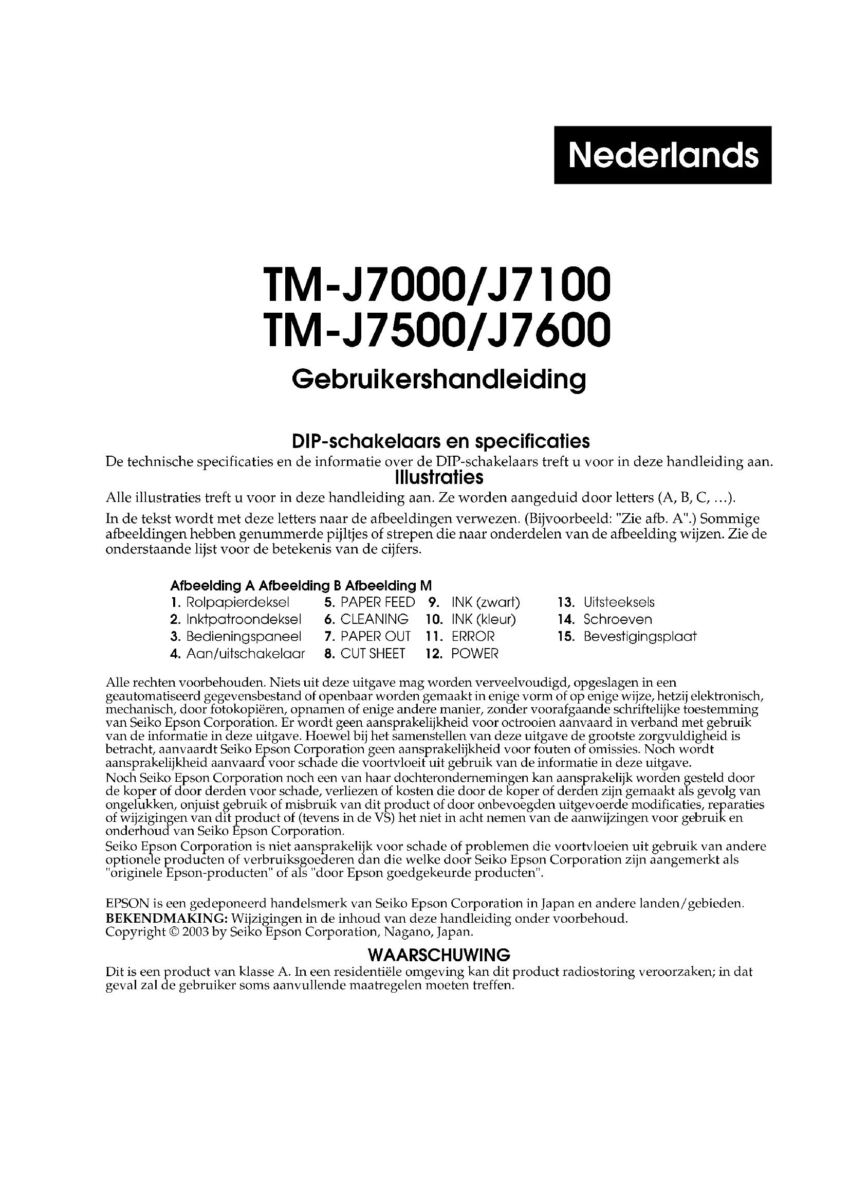 - Lesen Sie die Informationen auf dem Netzadapter-Etikett (Nennwerte, Warnungen/ Vorsichtsmaßnahmen) aufmerksam durch und achten Sie darauf, dass Sie diese vor dem Einbau des Netzadapters in den Drucker auch verstanden haben.Nederlands TM-J7000/J7100 TM-J7500/J7600 Gebruikershandleiding DIP-schakelaars en specificaties De technische specificaties en de informatie over de DIP-schakelaars treft u voor in deze handleiding aan. Illustraties Alle illustraties treft u voor in deze handleiding aan. Ze worden aangeduid door letters (A, B, C, …). In de tekst wordt met deze letters naar de afbeeldingen verwezen. (Bijvoorbeeld: "Zie afb. A".) Sommige afbeeldingen hebben genummerde pijltjes of strepen die naar onderdelen van de afbeelding wijzen. Zie de onderstaande lijst voor de betekenis van de cijfers. Alle rechten voorbehouden. Niets uit deze uitgave mag worden verveelvoudigd, opgeslagen in een geautomatiseerd gegevensbestand of openbaar worden gemaakt in enige vorm of op enige wijze, hetzij elektronisch, mechanisch, door fotokopiëren, opnamen of enige andere manier, zonder voorafgaande schriftelijke toestemming van Seiko Epson Corporation. Er wordt geen aansprakelijkheid voor octrooien aanvaard in verband met gebruik van de informatie in deze uitgave. Hoewel bij het samenstellen van deze uitgave de grootste zorgvuldigheid is betracht, aanvaardt Seiko Epson Corporation geen aansprakelijkheid voor fouten of omissies. Noch wordt aansprakelijkheid aanvaard voor schade die voortvloeit uit gebruik van de informatie in deze uitgave. Noch Seiko Epson Corporation noch een van haar dochterondernemingen kan aansprakelijk worden gesteld door de koper of door derden voor schade, verliezen of kosten die door de koper of derden zijn gemaakt als gevolg van ongelukken, onjuist gebruik of misbruik van dit product of door onbevoegden uitgevoerde modificaties, reparaties of wijzigingen van dit product of (tevens in de VS) het niet in acht nemen van de aanwijzingen voor gebruik en onderhoud van Seiko Epson Corporation. Seiko Epson Corporation is niet aansprakelijk voor schade of problemen die voortvloeien uit gebruik van andere optionele producten of verbruiksgoederen dan die welke door Seiko Epson Corporation zijn aangemerkt als "originele Epson-producten" of als "door Epson goedgekeurde producten". EPSON is een gedeponeerd handelsmerk van Seiko Epson Corporation in Japan en andere landen/gebieden. BEKENDMAKING: Wijzigingen in de inhoud van deze handleiding onder voorbehoud. Copyright © 2003 by Seiko Epson Corporation, Nagano, Japan. WAARSCHUWING Dit is een product van klasse A. In een residentiële omgeving kan dit product radiostoring veroorzaken; in dat geval zal de gebruiker soms aanvullende maatregelen moeten treffen.Afbeelding A Afbeelding B Afbeelding M