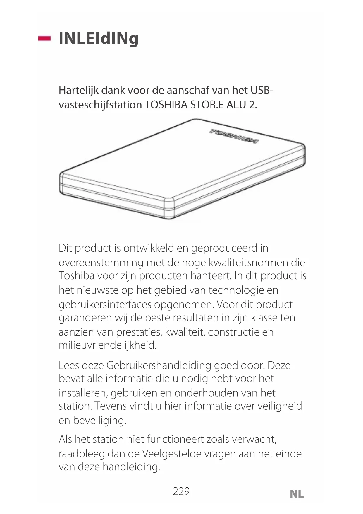 INLEIdINg Hartelijk dank voor de aanschaf van het USB- vasteschijfstation TOSHIBA STOR.E ALU 2. Dit product is ontwikkeld en geproduceerd in overeenstemming met de hoge kwaliteitsnormen die Toshiba voor zijn producten hanteert. In dit product is het nieuwste op het gebied van technologie en gebruikersinterfaces opgenomen. Voor dit product garanderen wij de beste resultaten in zijn klasse ten aanzien van prestaties, kwaliteit, constructie en milieuvriendelijkheid. Lees deze Gebruikershandleiding goed door. Deze bevat alle informatie die u nodig hebt voor het installeren, gebruiken en onderhouden van het station. Tevens vindt u hier informatie over veiligheid en beveiliging. Als het station niet functioneert zoals verwacht, raadpleeg dan de Veelgestelde vragen aan het einde van deze handleiding.230