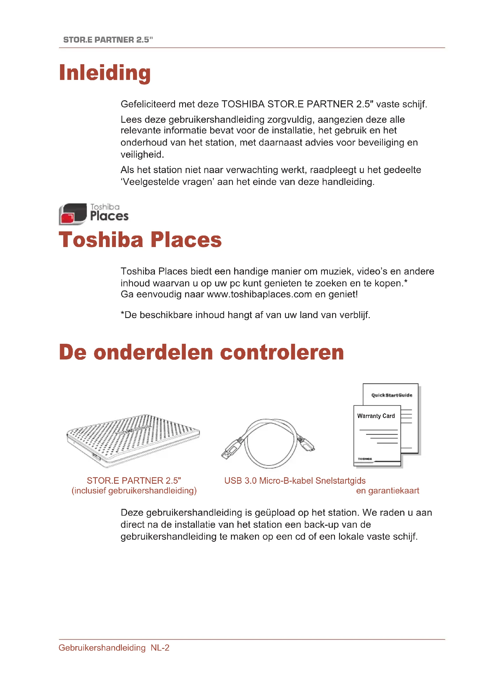 Inleiding Gefeliciteerd met deze TOSHIBA STOR.E PARTNER 2.5" vaste schijf. Lees deze gebruikershandleiding zorgvuldig, aangezien deze alle relevante informatie bevat voor de installatie, het gebruik en het onderhoud van het station, met daarnaast advies voor beveiliging en veiligheid. Als het station niet naar verwachting werkt, raadpleegt u het gedeelte ‘Veelgestelde vragen’ aan het einde van deze handleiding. Toshiba Places Toshiba Places biedt een handige manier om muziek, video’s en andere inhoud waarvan u op uw pc kunt genieten te zoeken en te kopen.* Ga eenvoudig naar www.toshibaplaces.com en geniet! *De beschikbare inhoud hangt af van uw land van verblijf. De onderdelen controleren Warranty Card