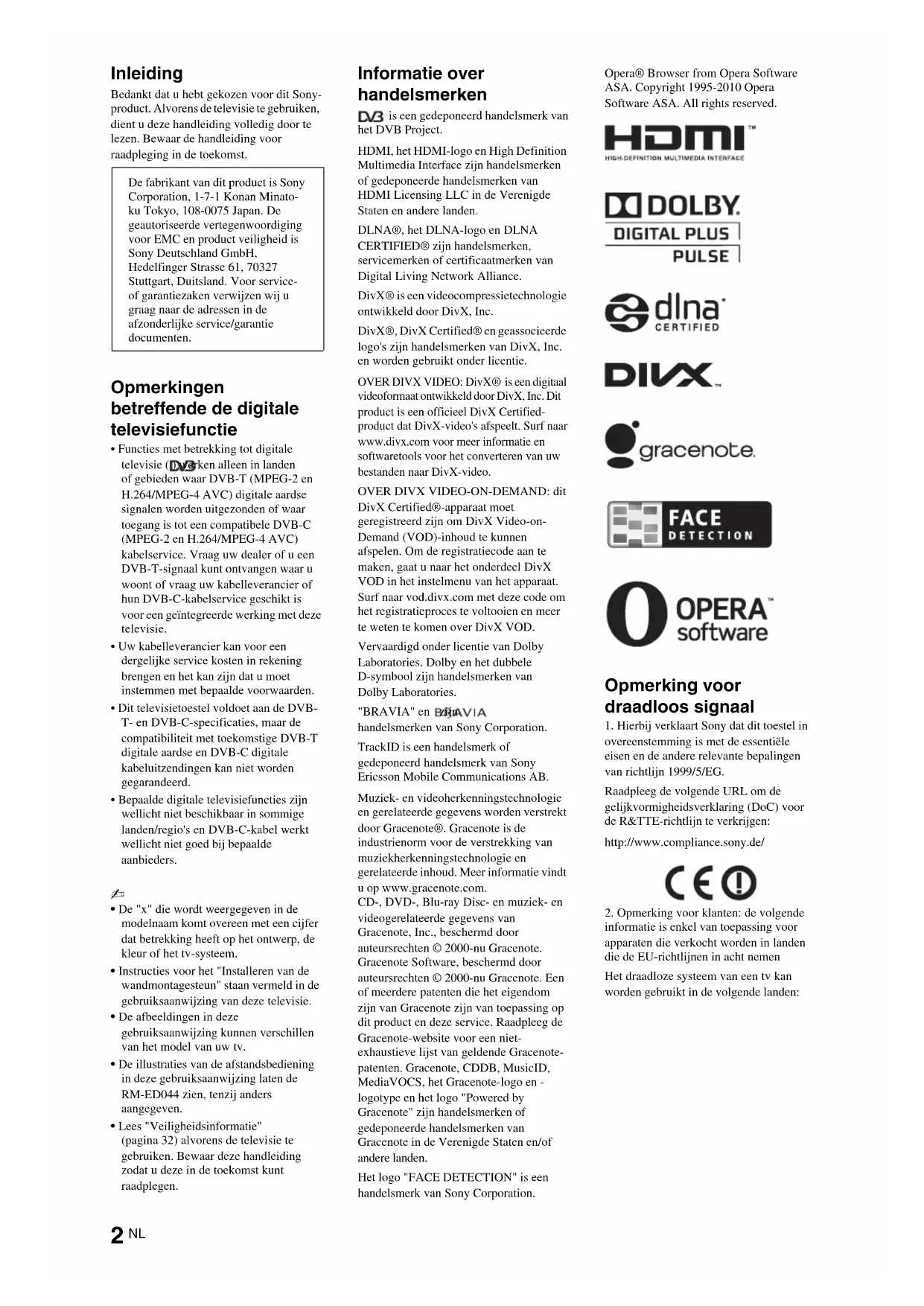 is een digitaal videoformaat ontwikkeld door DivX, Inc. Dit product is een officieel DivX Certified- product dat DivX-video's afspeelt. Surf naar www.divx.com voor meer informatie en softwaretools voor het converteren van uw bestanden naar DivX-video. OVER DIVX VIDEO-ON-DEMAND: dit DivX Certified®-apparaat moet geregistreerd zijn om DivX Video-on- Demand (VOD)-inhoud te kunnen afspelen. Om de registratiecode aan te maken, gaat u naar het onderdeel DivX VOD in het instelmenu van het apparaat. Surf naar vod.divx.com met deze code om het registratieproces te voltooien en meer te weten te komen over DivX VOD. Vervaardigd onder licentie van Dolby Laboratories. Dolby en het dubbele D-symbool zijn handelsmerken van Dolby Laboratories. "BRAVIA" en zijn handelsmerken van Sony Corporation. TrackID is een handelsmerk of gedeponeerd handelsmerk van Sony Ericsson Mobile Communications AB. Muziek- en videoherkenningstechnologie en gerelateerde gegevens worden verstrekt door Gracenote®. Gracenote is de industrienorm voor de verstrekking van muziekherkenningstechnologie en gerelateerde inhoud. Meer informatie vindt u op www.gracenote.com. CD-, DVD-, Blu-ray Disc- en muziek- en videogerelateerde gegevens van Gracenote, Inc., beschermd door auteursrechten © 2000-nu Gracenote. Gracenote Software, beschermd door auteursrechten © 2000-nu Gracenote. Een of meerdere patenten die het eigendom zijn van Gracenote zijn van toepassing op dit product en deze service. Raadpleeg de Gracenote-website voor een niet- exhaustieve lijst van geldende Gracenote- patenten. Gracenote, CDDB, MusicID, MediaVOCS, het Gracenote-logo en - logotype en het logo "Powered by Gracenote" zijn handelsmerken of gedeponeerde handelsmerken van Gracenote in de Verenigde Staten en/of andere landen. Het logo "FACE DETECTION" is een handelsmerk van Sony Corporation. Opera® Browser from Opera Software ASA. Copyright 1995-2010 Opera Software ASA. All rights reserved. Opmerking voor draadloos signaal