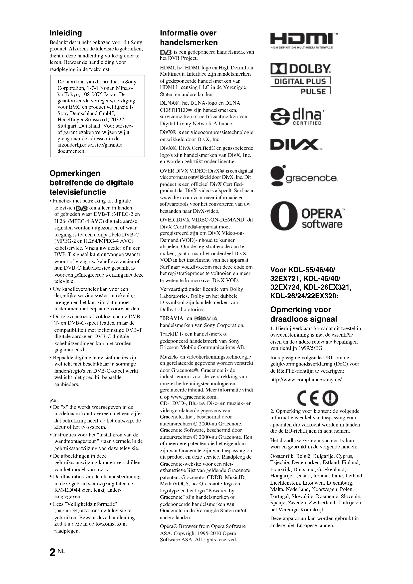 is een digitaal videoformaat ontwikkeld door DivX, Inc. Dit product is een officieel DivX Certified- product dat DivX-video's afspeelt. Surf naar www.divx.com voor meer informatie en softwaretools voor het converteren van uw bestanden naar DivX-video. OVER DIVX VIDEO-ON-DEMAND: dit DivX Certified®-apparaat moet geregistreerd zijn om DivX Video-on- Demand (VOD)-inhoud te kunnen afspelen. Om de registratiecode aan te maken, gaat u naar het onderdeel DivX VOD in het instelmenu van het apparaat. Surf naar vod.divx.com met deze code om het registratieproces te voltooien en meer te weten te komen over DivX VOD. Vervaardigd onder licentie van Dolby Laboratories. Dolby en het dubbele D-symbool zijn handelsmerken van Dolby Laboratories. "BRAVIA" en zijn handelsmerken van Sony Corporation. TrackID is een handelsmerk of gedeponeerd handelsmerk van Sony Ericsson Mobile Communications AB. Muziek- en videoherkenningstechnologie en gerelateerde gegevens worden verstrekt door Gracenote®. Gracenote is de industrienorm voor de verstrekking van muziekherkenningstechnologie en gerelateerde inhoud. Meer informatie vindt u op www.gracenote.com. CD-, DVD-, Blu-ray Disc- en muziek- en videogerelateerde gegevens van Gracenote, Inc., beschermd door auteursrechten © 2000-nu Gracenote. Gracenote Software, beschermd door auteursrechten © 2000-nu Gracenote. Een of meerdere patenten die het eigendom zijn van Gracenote zijn van toepassing op dit product en deze service. Raadpleeg de Gracenote-website voor een niet- exhaustieve lijst van geldende Gracenote- patenten. Gracenote, CDDB, MusicID, MediaVOCS, het Gracenote-logo en - logotype en het logo "Powered by Gracenote" zijn handelsmerken of gedeponeerde handelsmerken van Gracenote in de Verenigde Staten en/of andere landen. Opera® Browser from Opera Software ASA. Copyright 1995-2010 Opera Software ASA. All rights reserved. Voor KDL-55/46/40/ 32EX721, KDL-46/40/ 32EX724, KDL-26EX321, KDL-26/24/22EX320: Opmerking voor draadloos signaal