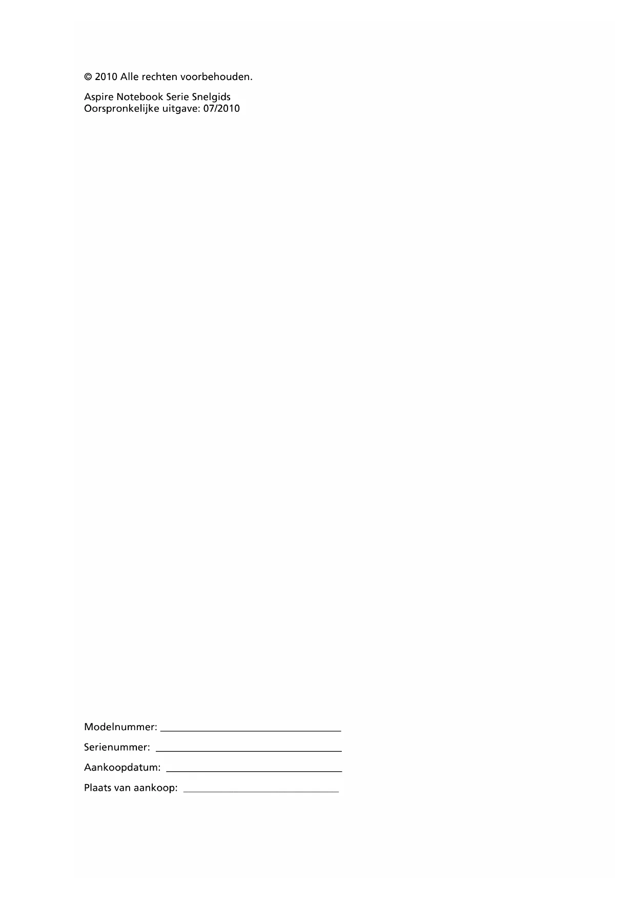 4Aspire Notebook Serie SnelgidsModelnummer: ____________________________________ Serienummer: _____________________________________ Aankoopdatum: ___________________________________ Plaats van aankoop: _______________________________ © 2010 Alle rechten voorbehouden. Aspire Notebook Serie Snelgids Oorspronkelijke uitgave: 07/20103 Voordat u aan de slag gaat Bedankt dat u hebt gekozen voor een notebook van Acer als oplossing voor uw mobiele computereisen. Uw gidsen Om u te helpen met het werken op het Acer notebook hebben we een aantal gidsen ontworpen: Allereerst helpt de instelkaart u bij het instellen van uw computer. De Aspire Algemene gebruikershandleiding bevat handige informatie die van toepassing zijn op alle modellen uit de Aspire productreeks. De handleiding behandelt basale onderwerpen, zoals de het gebruik van het toetsenbord, geluid, enz. Vandaar dat zowel de Algemene gebruikershandleiding als de hieronder genoemde AcerSystem User Guide af en toe naar functies of kenmerken verwijzen die slechts voor enkele modellen in de reeks gelden, en dus niet noodzakelijk voor het model dat u heeft aangeschaft. Dit wordt in de tekst aangegeven met opmerkingen in de trand van "alleen voor bepaalde modellen". Met de Snelgids krijgt u een introductie in de basiseigenschappen en functies van uw nieuwe computer. Als u meer wilt weten over hoe uw computer u kan helpen productiever te werken, raadpleeg dan de AcerSystem User Guide. Deze Gebruikershandleiding bevat gedetailleerde informatie over onderwerpen zoals systeemfuncties, gegevensherstel, uitbreidingsopties en probleem oplossen. Daarnaast bevat het informatie over garantie en de algemene voorwaarden en veiligheid voor uw notebook. Het is als Portable Document Format (PDF) beschikbaar en is al van te voren op uw notebook gezet. Volg deze stappen voor toegang tot dit document: 1 Klik op Start > Alle Programma’s > AcerSystem. 2 Klik vervolgens op AcerSystem User Guide. Opmerking: Als u het bestand wilt inzien, dient Adobe Reader te zijn geïnstalleerd. Als Adobe Reader nog niet op uw computer is geïnstalleerd, wordt, als u op AcerSystem User Guide klikt, eerst het installatieprogramma van Adobe Reader gestart. Volg de instructies op het scherm om het programma te installeren. Gebruiksaanwijzingen bij Adobe Reader vindt u in het menu Help en Ondersteuning.4 Nederlands Rondleiding door uw Acer notebook Nadat u de computer hebt ingesteld zoals is beschreven op de instelposter, bent u nu klaar voor een rondleiding door de nieuwe Acer notebook. Bovenkant