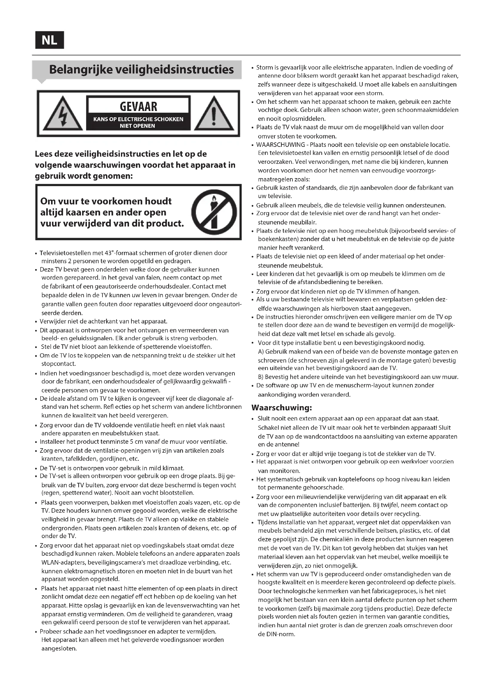 - Televisietoestellen met 43"-formaat schermen of groter dienen door minstens 2 personen te worden opgetild en gedragen.• Deze TV bevat geen onderdelen welke door de gebruiker kunnen worden gerepareerd. In het geval van falen, neem contact op met de fabrikant of een geautoriseerde onderhoudsdealer. Contact met bepaalde delen in de TV kunnen uw leven in gevaar brengen. Onder de garantie vallen geen fouten door reparaties uitgevoerd door ongeautori-seerde derden.• Verwijder niet de achterkant van het apparaat.• Dit apparaat is ontworpen voor het ontvangen en vermeerderen van beeld- en geluidssignalen. Elk ander gebruik is streng verboden.