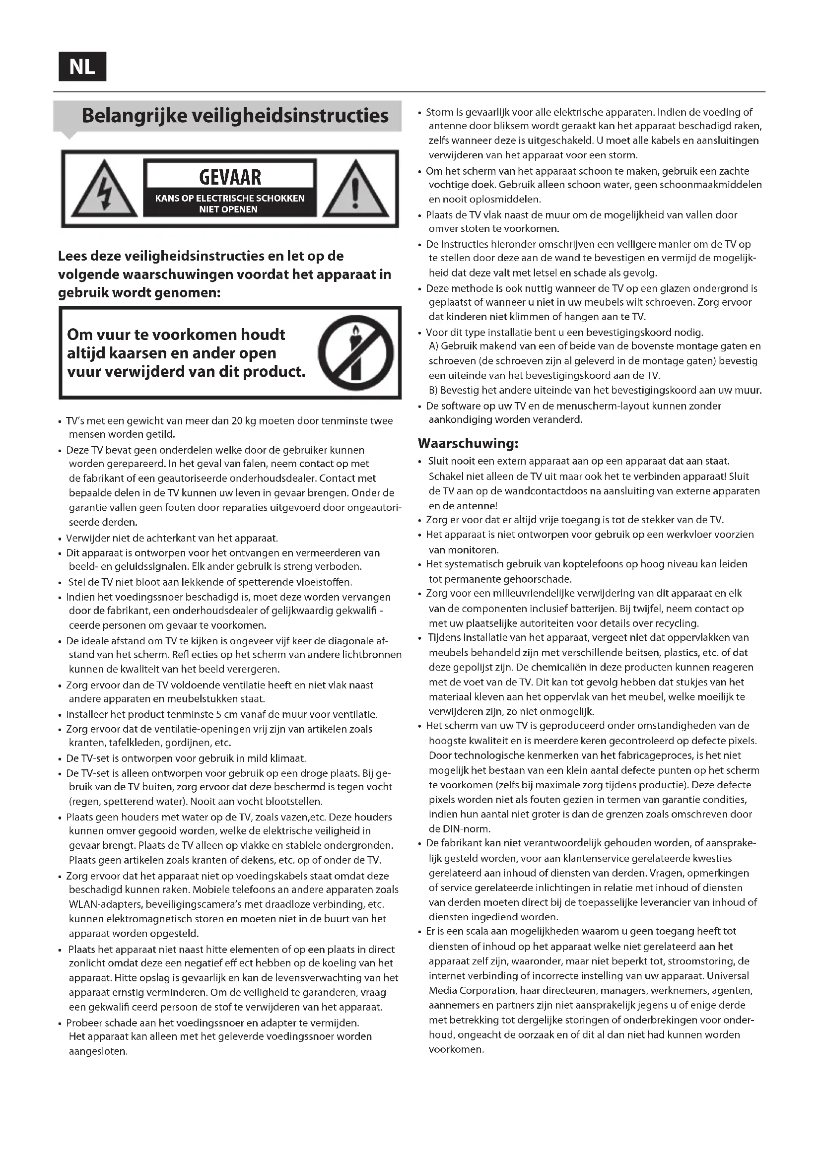 - Tijdens installatie van het apparaat, vergeet niet dat oppervlakken van meubels behandeld zijn met verschillende beitsen, plastics, etc. of dat deze gepolijst zijn. De chemicaliën in deze producten kunnen reageren met de voet van de TV. Dit kan tot gevolg hebben dat stukjes van het materiaal kleven aan het oppervlak van het meubel, welke moeilijk te verwijderen zijn, zo niet onmogelijk.• Het scherm van uw TV is geproduceerd onder omstandigheden van de hoogste kwaliteit en is meerdere keren gecontroleerd op defecte pixels. Door technologische kenmerken van het fabricageproces, is het niet mogelijk het bestaan van een klein aantal defecte punten op het scherm te voorkomen (zelfs bij maximale zorg tijdens productie). Deze defecte pixels worden niet als fouten gezien in termen van garantie condities, indien hun aantal niet groter is dan de grenzen zoals omschreven door de DIN-norm. • De fabrikant kan niet verantwoordelijk gehouden worden, of aansprake-lijk gesteld worden, voor aan klantenservice gerelateerde kwesties gerelateerd aan inhoud of diensten van derden. Vragen, opmerkingen of service gerelateerde inlichtingen in relatie met inhoud of diensten van derden moeten direct bij de toepasselijke leverancier van inhoud of diensten ingediend worden.• Er is een scala aan mogelijkheden waarom u geen toegang heeft tot diensten of inhoud op het apparaat welke niet gerelateerd aan het apparaat zelf zijn, waaronder, maar niet beperkt tot, stroomstoring, de internet verbinding of incorrecte instelling van uw apparaat. Universal Media Corporation, haar directeuren, managers, werknemers, agenten, aannemers en partners zijn niet aansprakelijk jegens u of enige derde met betrekking tot dergelijke storingen of onderbrekingen voor onder-houd, ongeacht de oorzaak en of dit al dan niet had kunnen worden voorkomen.61