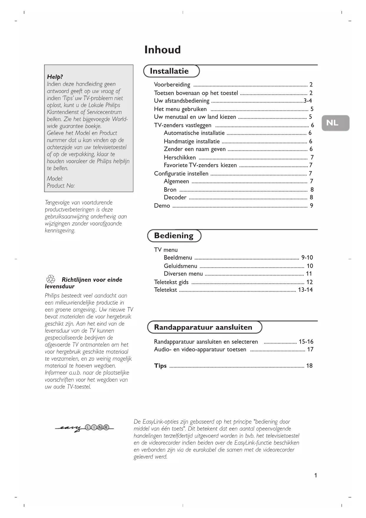 - Vous pouvez toujours utiliser la touche MENU et les touches -/+ en haut du téléviseur. Veille Votre TV consomme de l’énergie en veille. Cette consommation contribue à la pollution de l’air et de l’eau. Consommation : 1 W.1 Inhoud Voorbereiding ................................................................................... 2 Toetsen bovenaan op het toestel ................................................. 2 Uw afstandsbediening ...................................................................3-4 Het menu gebruiken ....................................................................... 5 Uw menutaal en uw land kiezen .................................................. 5 TV-zenders vastleggen .................................................................... 6 Automatische installatie .......................................................... 6 Handmatige installatie .............................................................. 6 Zender een naam geven .......................................................... 6 Herschikken ............................................................................... 7 Favoriete TV-zenders kiezen .................................................. 7 Configuratie instellen ...................................................................... 7 Algemeen .................................................................................... 7 Bron ............................................................................................. 8 Decoder ...................................................................................... 8 Demo .................................................................................................. 9 Installatie TV menu Beeldmenu ............................................................................ 9-10 Geluidsmenu ............................................................................ 10 Diversen menu ........................................................................ 11 Teletekst gids .................................................................................. 12 Teletekst ..................................................................................... 13-14 Randapparatuur aansluiten Randapparatuur aansluiten en selecteren ........................ 15-16 Audio- en video-apparatuur toetsen ........................................ 17 Tips .................................................................................................. 18 Bediening De EasyLink-opties zijn gebaseerd op het principe "bediening door middel van één toets". Dit betekent dat een aantal opeenvolgende handelingen terzelfdertijd uitgevoerd worden in bvb. het televisietoestel en de videorecorder indien beiden over de EasyLink-functie beschikken en verbonden zijn via de eurokabel die samen met de videorecorder geleverd werd. R Richtlijnen voor einde levensduur Philips besteedt veel aandacht aan een milieuvriendelijke productie in een groene omgeving.. Uw nieuwe TV bevat materialen die voor hergebruik geschikt zijn. Aan het eind van de levensduur van de TV kunnen gespecialiseerde bedrijven de afgevoerde TV ontmantelen om het voor hergebruik geschikte materiaal te verzamelen, en zo weinig mogelijk materiaal te hoeven wegdoen. Informeer a.u.b. naar de plaatselijke voorschriften voor het wegdoen van uw oude TV-toestel. Help? Indien deze handleiding geen antwoord geeft op uw vraag of indien ‘Tips’ uw TV-probleem niet oplost, kunt u de Lokale Philips Klantendienst of Servicecentrum bellen. Zie het bijgevoegde World- wide guarantee boekje. Gelieve het Model en Product nummer dat u kan vinden op de achterzijde van uw televisietoestel of op de verpakking, klaar te houden vooraleer de Philips helplijn te bellen. Model: Product No: Tengevolge van voortdurende productverbeteringen is deze gebruiksaanwijzing onderhevig aan wijzigingen zonder voorafgaande kennisgeving. NL2 & Plaats uw toestel op een harde ondergrond. Laat voor ventilatie minstens 5 cm vrij rondom de TV. Plaats de TV niet op een tapijt. Om onveilige situaties te voorkomen, plaats geen voorwerpen bovenop het toestel.Vermijd warmte en rechtstreeks zonlicht en stel het televisietoestel niet bloot aan regen of water. é Sluit de antenne goed aan op de antenne-ingang x op de achterzijde van de TV. “ Stop de stekker in het stopcontact met een netspanning van 220V - 240V. ‘ Afstandsbediening: Plaats de 2 meegeleverde batterijen (type R6-1,5V) in het batterijvak. De bijgeleverde batterijen bevatten niet de zware metalen kwik en cadmium. Informeer a.u.b. naar de plaatselijke voorschriften voor het afvoeren van lege batterijen. ( TV inschakelen: Druk op de schakelaar A vooraan op uw TV. Een blauw lampje vooraan op het televisitoestel en het scherm lichten op. Als de TV in de standby stand staat (rood lampje), druk dan op