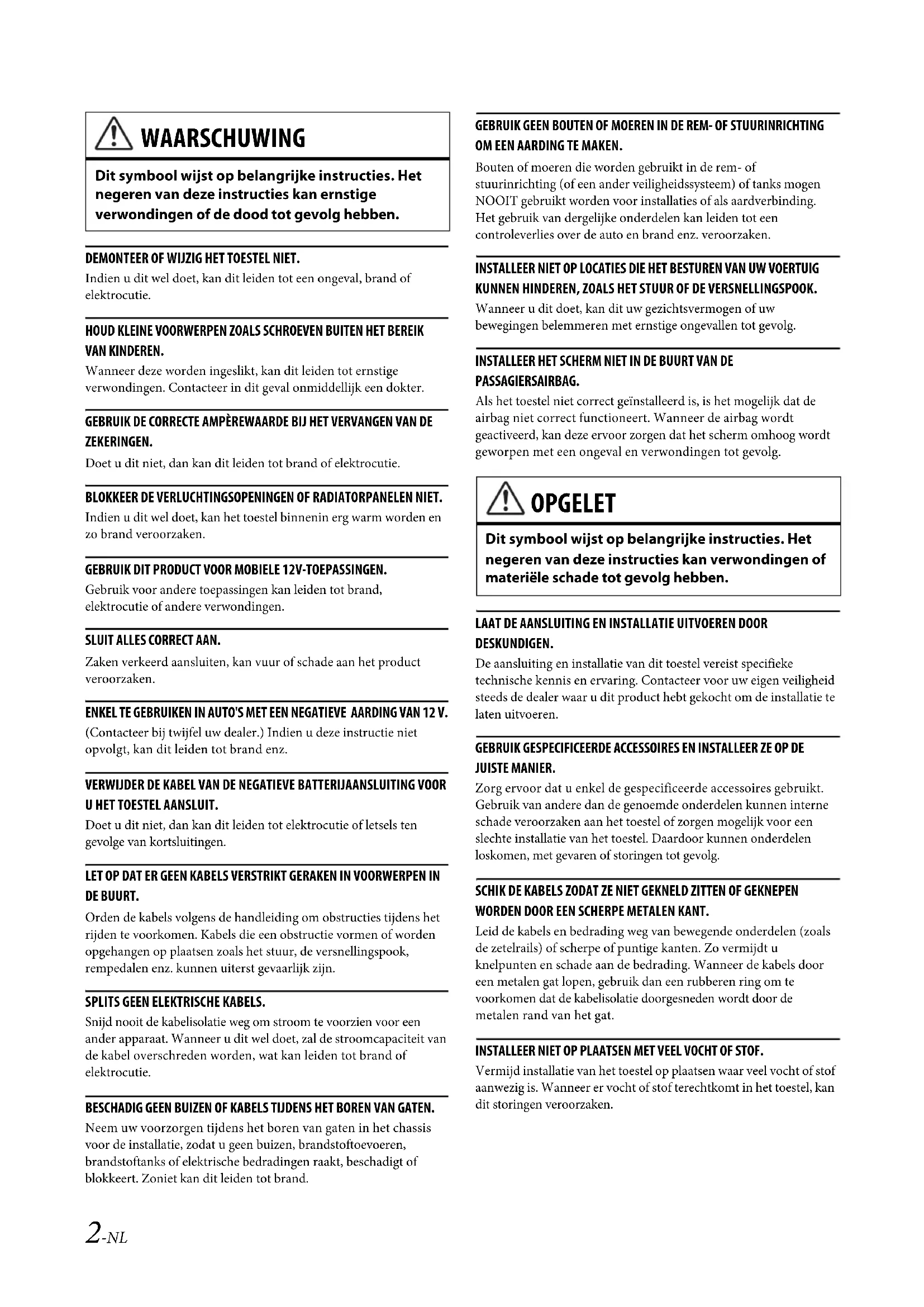 - Systeemvoorbeeld 07NL00X801D-U.book Page 1 Tuesday, May 19, 2015 2:25 PM2-NL 07NL04X801D-U_NL.fm ALPINE X801D-U/INE-W997D 68-29530Z17-A (NL) DEMONTEER OF WIJZIG HET TOESTEL NIET. Indien u dit wel doet, kan dit leiden tot een ongeval, brand of elektrocutie. HOUD KLEINE VOORWERPEN ZOALS SCHROEVEN BUITEN HET BEREIK VAN KINDEREN. Wanneer deze worden ingeslikt, kan dit leiden tot ernstige verwondingen. Contacteer in dit geval onmiddellijk een dokter. GEBRUIK DE CORRECTE AMPÈREWAARDE BIJ HET VERVANGEN VAN DE ZEKERINGEN. Doet u dit niet, dan kan dit leiden tot brand of elektrocutie. BLOKKEER DE VERLUCHTINGSOPENINGEN OF RADIATORPANELEN NIET. Indien u dit wel doet, kan het toestel binnenin erg warm worden en zo brand veroorzaken. GEBRUIK DIT PRODUCT VOOR MOBIELE 12V-TOEPASSINGEN. Gebruik voor andere toepassingen kan leiden tot brand, elektrocutie of andere verwondingen. SLUIT ALLES CORRECT AAN. Zaken verkeerd aansluiten, kan vuur of schade aan het product veroorzaken. ENKEL TE GEBRUIKEN IN AUTO'S MET EEN NEGATIEVE AARDING VAN 12 V. (Contacteer bij twijfel uw dealer.) Indien u deze instructie niet opvolgt, kan dit leiden tot brand enz. VERWIJDER DE KABEL VAN DE NEGATIEVE BATTERIJAANSLUITING VOOR U HET TOESTEL AANSLUIT. Doet u dit niet, dan kan dit leiden tot elektrocutie of letsels ten gevolge van kortsluitingen. LET OP DAT ER GEEN KABELS VERSTRIKT GERAKEN IN VOORWERPEN IN DE BUURT. Orden de kabels volgens de handleiding om obstructies tijdens het rijden te voorkomen. Kabels die een obstructie vormen of worden opgehangen op plaatsen zoals het stuur, de versnellingspook, rempedalen enz. kunnen uiterst gevaarlijk zijn. SPLITS GEEN ELEKTRISCHE KABELS. Snijd nooit de kabelisolatie weg om stroom te voorzien voor een ander apparaat. Wanneer u dit wel doet, zal de stroomcapaciteit van de kabel overschreden worden, wat kan leiden tot brand of elektrocutie. BESCHADIG GEEN BUIZEN OF KABELS TIJDENS HET BOREN VAN GATEN. Neem uw voorzorgen tijdens het boren van gaten in het chassis voor de installatie, zodat u geen buizen, brandstoftoevoeren, brandstoftanks of elektrische bedradingen raakt, beschadigt of blokkeert. Zoniet kan dit leiden tot brand. GEBRUIK GEEN BOUTEN OF MOEREN IN DE REM- OF STUURINRICHTING OM EEN AARDING TE MAKEN. Bouten of moeren die worden gebruikt in de rem- of stuurinrichting (of een ander veiligheidssysteem) of tanks mogen NOOIT gebruikt worden voor installaties of als aardverbinding. Het gebruik van dergelijke onderdelen kan leiden tot een controleverlies over de auto en brand enz. veroorzaken. INSTALLEER NIET OP LOCATIES DIE HET BESTUREN VAN UW VOERTUIG KUNNEN HINDEREN, ZOALS HET STUUR OF DE VERSNELLINGSPOOK. Wanneer u dit doet, kan dit uw gezichtsvermogen of uw bewegingen belemmeren met ernstige ongevallen tot gevolg. INSTALLEER HET SCHERM NIET IN DE BUURT VAN DE PASSAGIERSAIRBAG. Als het toestel niet correct geïnstalleerd is, is het mogelijk dat de airbag niet correct functioneert. Wanneer de airbag wordt geactiveerd, kan deze ervoor zorgen dat het scherm omhoog wordt geworpen met een ongeval en verwondingen tot gevolg. LAAT DE AANSLUITING EN INSTALLATIE UITVOEREN DOOR DESKUNDIGEN. De aansluiting en installatie van dit toestel vereist specifieke technische kennis en ervaring. Contacteer voor uw eigen veiligheid steeds de dealer waar u dit product hebt gekocht om de installatie te laten uitvoeren. GEBRUIK GESPECIFICEERDE ACCESSOIRES EN INSTALLEER ZE OP DE JUISTE MANIER. Zorg ervoor dat u enkel de gespecificeerde accessoires gebruikt. Gebruik van andere dan de genoemde onderdelen kunnen interne schade veroorzaken aan het toestel of zorgen mogelijk voor een slechte installatie van het toestel. Daardoor kunnen onderdelen loskomen, met gevaren of storingen tot gevolg. SCHIK DE KABELS ZODAT ZE NIET GEKNELD ZITTEN OF GEKNEPEN WORDEN DOOR EEN SCHERPE METALEN KANT. Leid de kabels en bedrading weg van bewegende onderdelen (zoals de zetelrails) of scherpe of puntige kanten. Zo vermijdt u knelpunten en schade aan de bedrading. Wanneer de kabels door een metalen gat lopen, gebruik dan een rubberen ring om te voorkomen dat de kabelisolatie doorgesneden wordt door de metalen rand van het gat. INSTALLEER NIET OP PLAATSEN MET VEEL VOCHT OF STOF. Vermijd installatie van het toestel op plaatsen waar veel vocht of stof aanwezig is. Wanneer er vocht of stof terechtkomt in het toestel, kan dit storingen veroorzaken. WAARSCHUWING Dit symbool wijst op belangrijke instructies. Het negeren van deze instructies kan ernstige verwondingen of de dood tot gevolg hebben. OPGELET Dit symbool wijst op belangrijke instructies. Het negeren van deze instructies kan verwondingen of materiële schade tot gevolg hebben. 07NL00X801D-U.book Page 2 Tuesday, May 19, 2015 2:25 PM3-NL 07NL04X801D-U_NL.fm ALPINE X801D-U/INE-W997D 68-29530Z17-A (NL) p. 9