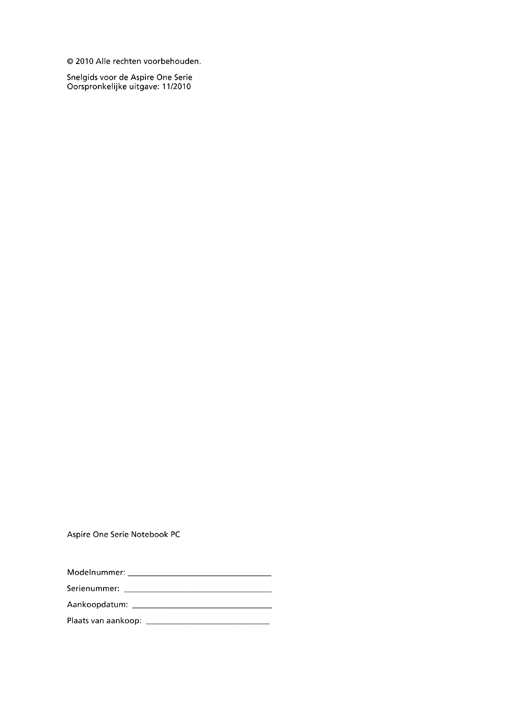 6loading-circle-1Modelnummer: ____________________________________ Serienummer: _____________________________________ Aankoopdatum: ___________________________________ Plaats van aankoop: _______________________________ © 2010 Alle rechten voorbehouden. Snelgids voor de Aspire One Serie Oorspronkelijke uitgave: 11/2010 Aspire One Serie Notebook PC3 Om te beginnen Bedankt dat u hebt gekozen voor een notebook van Acer als oplossing voor uw mobiele computereisen. Uw gidsen Om u te helpen met het werken op het Acer notebook hebben we een aantal gidsen ontworpen: Allereerst helpt de instelkaart u bij het instellen van uw computer. De Algemene Gebruikershandleiding Aspire One Serie bevat nuttige informatie voor alle modellen in de Aspire One-productreeks. De handleiding behandelt basale onderwerpen, zoals Acer eRecovery Management, het gebruik van het toetsenbord, geluid, enz. Vandaar dat zowel de Algemene Gebruikershandleiding als de hieronder genoemde AcerSystem User Guide af en toe naar functies of kenmerken verwijzen die slechts voor enkele modellen in de reeks gelden, en dus niet noodzakelijk voor het model dat u heeft aangeschaft. Dit wordt in de tekst aangegeven met opmerkingen in de trand van "alleen voor bepaalde modellen". In de Snelgids krijgt u een introductie over de basiseigenschappen en functies van uw nieuwe computer. Voor meer informatie over hoe de computer u kan helpen productiever te werken, zie de AcerSystem User Guide. Hierin vindt u gedetailleerde informatie over onderwerpen als systeemhulpmiddelen, gegevensherstel, uitbreidingsopties en oplossen van problemen. Daarnaast bevat het informatie over garantie en de algemene voorwaarden en veiligheid voor uw notebook. Het is als Portable Document Format (PDF) beschikbaar en is al van te voren op uw notebook gezet. Volg deze stappen voor toegang tot dit document: 1 Klik op Start > Alle Programma's > AcerSystem. 2 Klik op AcerSystem User Guide. Opmerking: Als u het bestand wilt inzien, dient Adobe Reader te zijn geïnstalleerd. Als Adobe Reader nog niet op uw computer is geïnstalleerd, wordt, als u op AcerSystem User Guide klikt, eerst het installatieprogramma van Adobe Reader gestart. Volg de instructies op het scherm om het programma te installeren. Gebruiksaanwijzingen bij Adobe Reader vindt u in het menu Help en Ondersteuning.4 Nederlands Rondleiding door uw Acer notebook Nadat u de computer hebt ingesteld zoals is beschreven op de instelposter, bent u nu klaar voor een rondleiding door de nieuwe Acer notebook. Bovenkant # Pictogram Item Beschrijving1 Microfoon Interne microfoon voor geluidsopname.2 Beeldscherm Ook wel Liquid-Crystal Display (LCD) genoemd, geeft de beelduitvoer van de computer weer (configuratie kan per model verschillen).