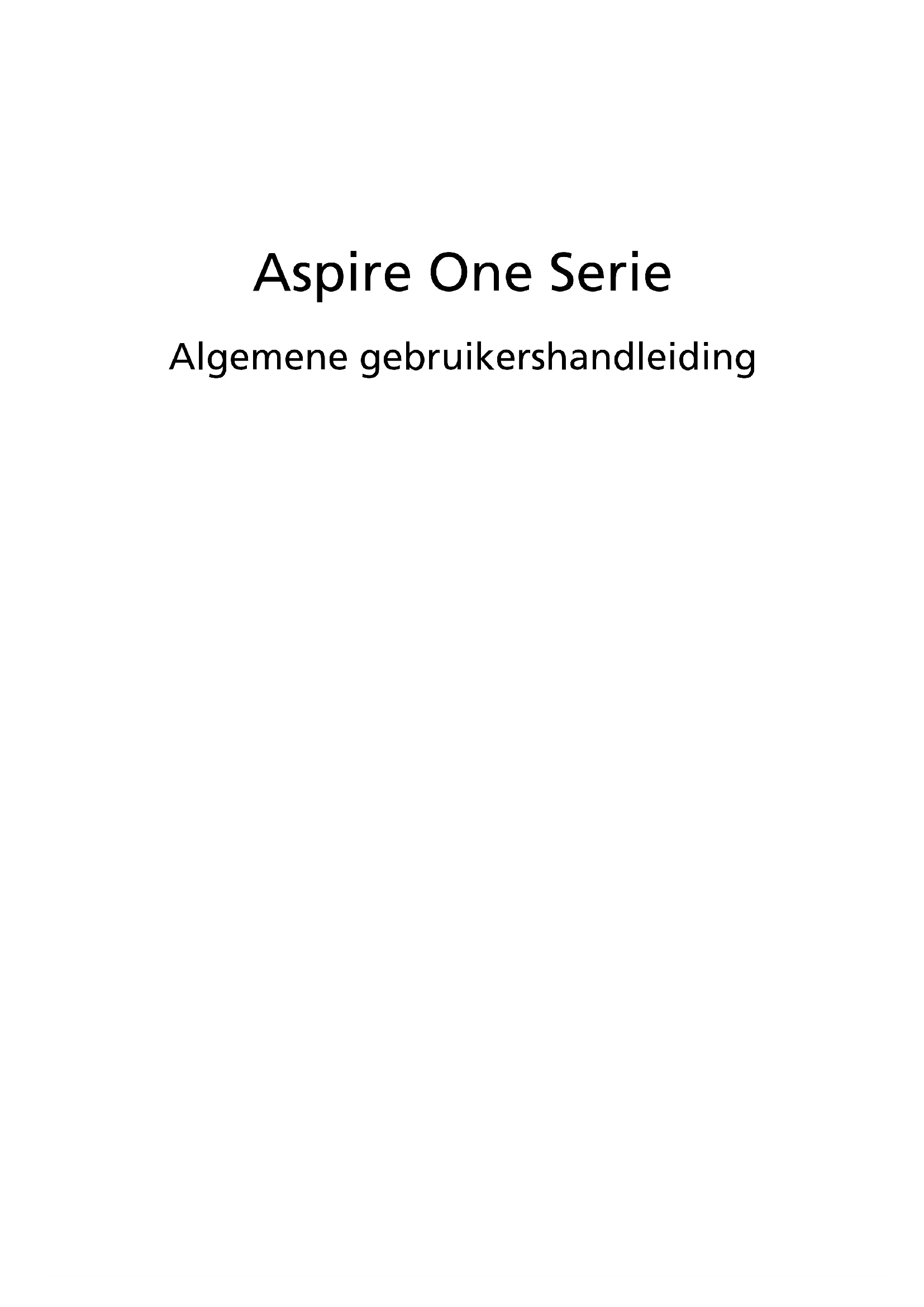 - v'n Pixel fault class Class IIAspire One Serie Algemene gebruikershandleidingModelnummer: ____________________________________ Serienummer: _____________________________________ Aankoopdatum: ___________________________________ Plaats van aankoop: _______________________________ © 2010 Alle rechten voorbehouden Algemene gebruikershandleiding Aspire One Serie Oorspronkelijke uitgave: 12/2010iii Informatie voor uw veiligheid en gemak Veiligheidsinstructies Lees deze instructies aandachtig door. Bewaar dit document voor toekomstige naslag. Volg alle waarschuwingen en instructies die aangegeven zijn op het product zelf. Het product uitschakelen voordat het wordt schoongemaakt Haal de stekker van dit apparaat uit het stopcontact voordat u het apparaat reinigt. Gebruik geen vloeibare schoonmaakmiddelen of schoonmaakmiddelen uit spuitbussen. Reinig alleen met een vochtige doek. VOORZICHTIG loskoppelen van de stekker Let op de volgende richtlijnen als de stroomkabel op de stroombron wordt aangesloten of losgekoppeld: Installeer de stroombron voordat u de stroomkabel in het stopcontact steekt. Koppel de stroomkabel eerst los voordat de stroombron van de computer wordt losgekoppeld. Als het systeem meerdere stroombronnen heeft, koppel dan alle stroomkabels uit alle stroombronnen los. VOORZICHTIG bij Toegankelijkheid Zorg dat het gebruikte stopcontact makkelijk toegankelijk is en zo dicht mogelijk bij de gebruikte apparatuur is. Als u de stroom van het apparaat wilt afhalen, zorg dan dat u de stroomkabel uit het stopcontact trekt. LET OP de bijgesloten dummykaart(en) (alleen voor bepaalde modellen) De computer wordt geleverd met plastic dummies, nepkaarten, in de kaartsleuven. Dummies beschermen ongebruikte sleuven tegen stof, metalen objecten en andere deeltjes. Bewaar de dummies en gebruik deze als in de sleuven geen kaarten worden gebruikt. WAARSCHUWING bij het luisteren Om uw gehoor te beschermen volgt u deze instructies.