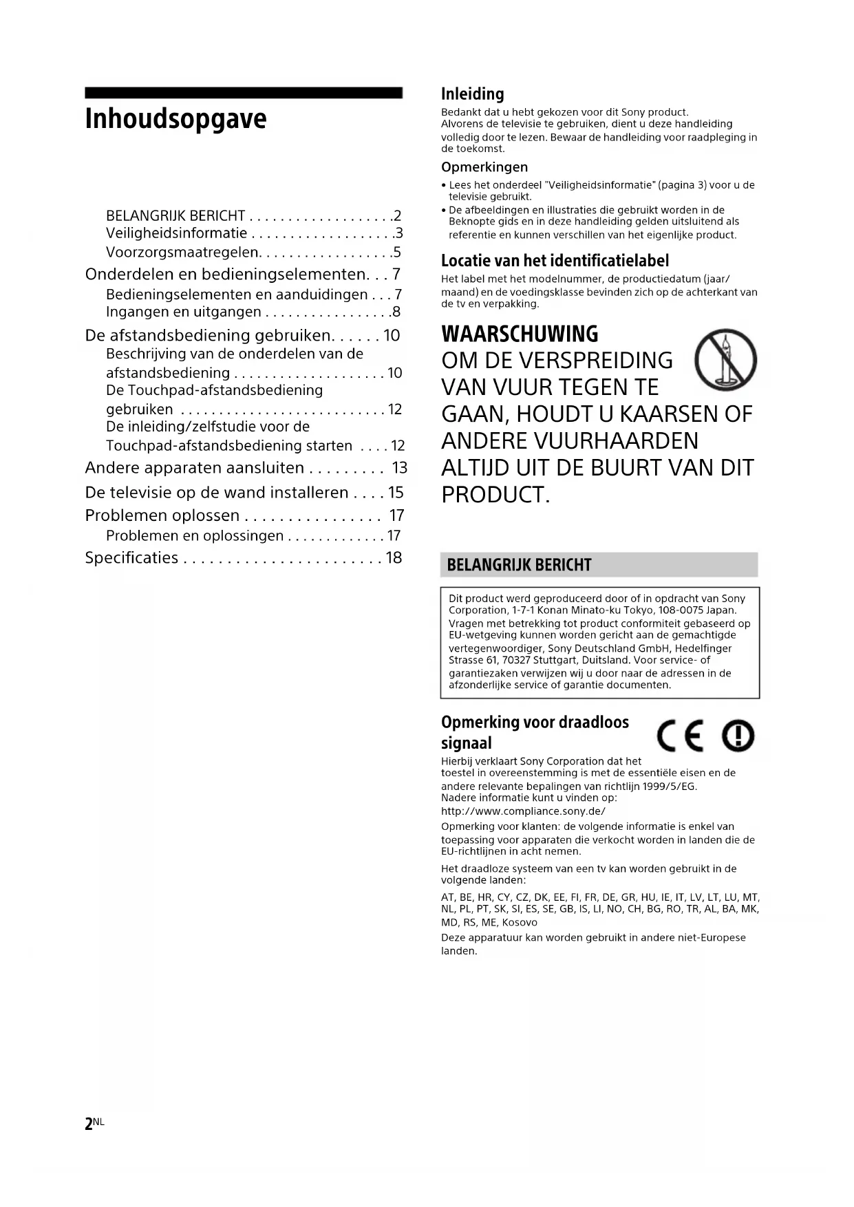PRODUCT. Opmerking voor draadloos signaal Hierbij verklaart Sony Corporation dat het toestel in overeenstemming is met de essentiële eisen en de andere relevante bepalingen van richtlijn 1999/5/EG.Nadere informatie kunt u vinden op:http://www.compliance.sony.de/Opmerking voor klanten: de volgende informatie is enkel van toepassing voor apparaten die verkocht worden in landen die de EU-richtlijnen in acht nemen.Het draadloze systeem van een tv kan worden gebruikt in de volgende landen:AT, BE, HR, CY, CZ, DK, EE, FI, FR, DE, GR, HU, IE, IT, LV, LT, LU, MT, NL, PL, PT, SK, SI, ES, SE, GB, IS, LI, NO, CH, BG, RO, TR, AL, BA, MK, MD, RS, ME, KosovoDeze apparatuur kan worden gebruikt in andere niet-Europese landen. BELANGRIJK BERICHT Dit product werd geproduceerd door of in opdracht van Sony Corporation, 1-7-1 Konan Minato-ku Tokyo, 108-0075 Japan. Vragen met betrekking tot product conformiteit gebaseerd op EU-wetgeving kunnen worden gericht aan de gemachtigde vertegenwoordiger, Sony Deutschland GmbH, Hedelfinger Strasse 61, 70327 Stuttgart, Duitsland. Voor service- of garantiezaken verwijzen wij u door naar de adressen in de afzonderlijke service of garantie documenten.GB