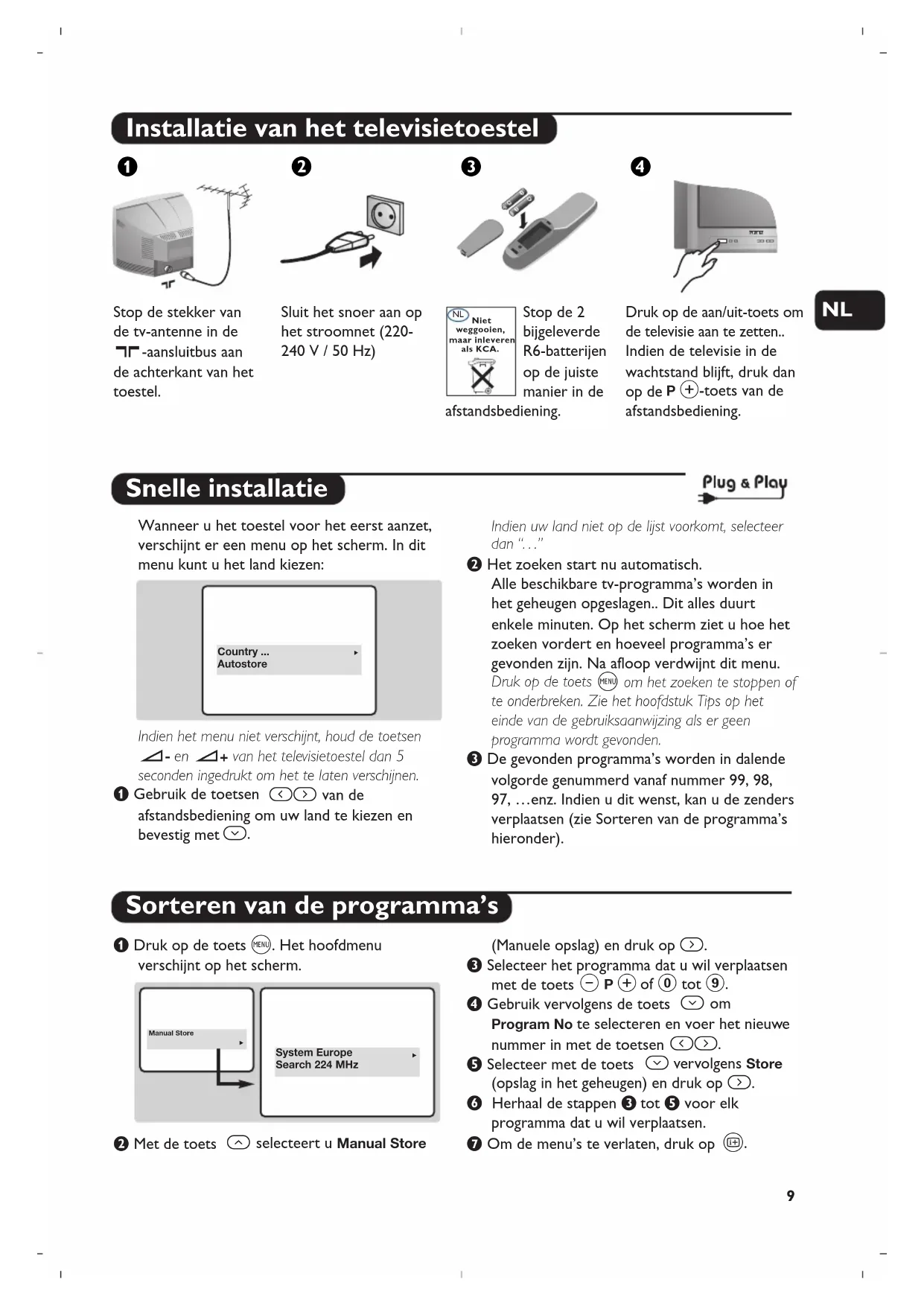 (- P +). Pour accéder aux menus, appuyez simultanément sur les touches ” - et ” +. Ensuite, utilisez les touches - P + et - ” + pour régler. Conseils : voir à la fin du mode d’emploi (p. 57). Autres fonctions9 Installatie van het televisietoestel Stop de stekker van de tv-antenne in de :-aansluitbus aan de achterkant van het toestel. Sluit het snoer aan op het stroomnet (220- 240 V / 50 Hz) Stop de 2 bijgeleverde R6-batterijen op de juiste manier in de afstandsbediening. Druk op de aan/uit-toets om de televisie aan te zetten.. Indien de televisie in de wachtstand blijft, druk dan op de P #-toets van de afstandsbediening. æÂê® Snelle installatie Sorteren van de programma’s Wanneer u het toestel voor het eerst aanzet, verschijnt er een menu op het scherm. In dit menu kunt u het land kiezen: Indien het menu niet verschijnt, houd de toetsen ”- en ”+ van het televisietoestel dan 5 seconden ingedrukt om het te laten verschijnen. & Gebruik de toetsen Ȭ van de afstandsbediening om uw land te kiezen en bevestig met