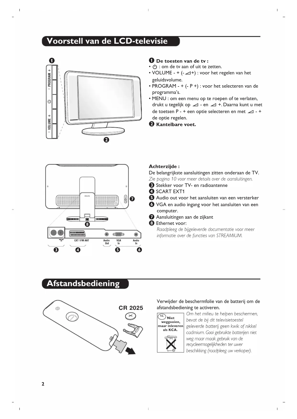 Kantelbare voet. Achterzijde : De belangrijkste aansluitingen zitten onderaan de TV. Zie pagina 10 voor meer details over de aansluitingen. “ Stekker voor TV- en radioantenne ‘ SCART EXT1 ( Audio out voor het aansluiten van een versterker § VGA en audio ingang voor het aansluiten van een computer. è Aansluitingen aan de zijkant ! Ethernet voor: Raadpleeg de bijgeleverde documentatie voor meer informatie over de functies van STREAMIUM. Verwijder de beschermfolie van de batterij om de afstandsbediening te activeren. Om het milieu te helpen beschermen, bevat de bij dit televisietoestel geleverde batterij geen kwik of nikkel cadmium. Gooi gebruikte batterijen niet weg maar maak gebruik van de recycleermogelijkheden ter uwer beschikking (raadpleeg uw verkoper). CR 2025 Niet weggooien, maar inleveren als KCA. NL3 Toetsen van de afstandsbediening Toets voor teletekst (p. 8) Keuze van de EXT- aansluitingen (p.10) Druk verscheidene keren om het aangesloten apparaat te selecteren. Geluidsmodus Om van Stereo en Nicam Stereo naar Mono te schakelen of te kiezen tussen Dual I of Dual II bij tweetalige uitzendingen.
