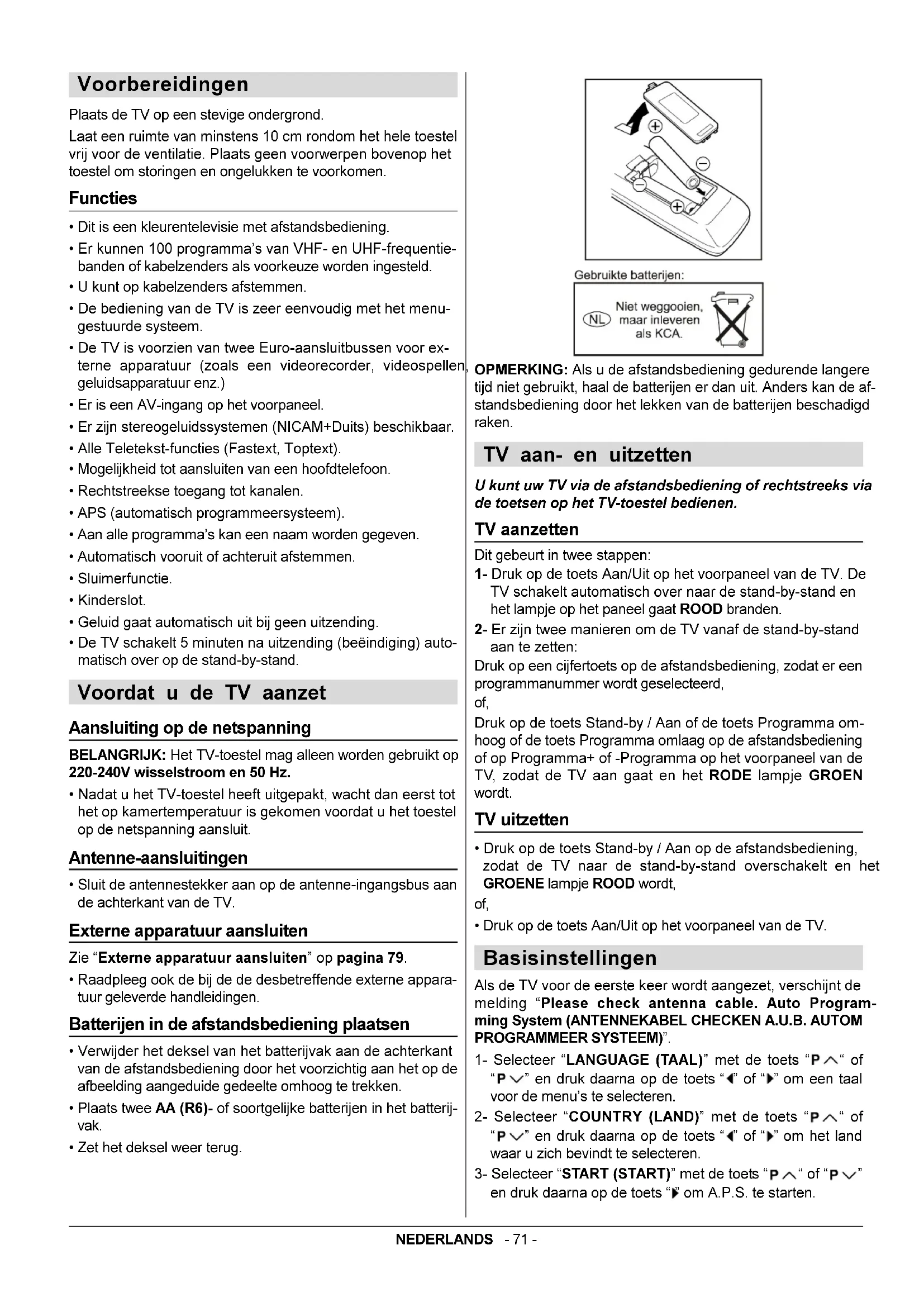 Voorbereidingen Plaats de TV op een stevige ondergrond. Laat een ruimte van minstens 10 cm rondom het hele toestel vrij voor de ventilatie. Plaats geen voorwerpen bovenop het toestel om storingen en ongelukken te voorkomen. Functies Dit is een kleurentelevisie met afstandsbediening. Er kunnen 100 programmas van VHF- en UHF-frequentie- banden of kabelzenders als voorkeuze worden ingesteld. U kunt op kabelzenders afstemmen. De bediening van de TV is zeer eenvoudig met het menu- gestuurde systeem. De TV is voorzien van twee Euro-aansluitbussen voor ex- terne apparatuur (zoals een videorecorder, videospellen, geluidsapparatuur enz.) Er is een AV-ingang op het voorpaneel. Er zijn stereogeluidssystemen (NICAM+Duits) beschikbaar. Alle Teletekst-functies (Fastext, Toptext). Mogelijkheid tot aansluiten van een hoofdtelefoon. Rechtstreekse toegang tot kanalen. APS (automatisch programmeersysteem). Aan alle programmas kan een naam worden gegeven. Automatisch vooruit of achteruit afstemmen. Sluimerfunctie. Kinderslot. Geluid gaat automatisch uit bij geen uitzending. De TV schakelt 5 minuten na uitzending (beëindiging) auto- matisch over op de stand-by-stand. Voordat u de TV aanzet Aansluiting op de netspanning BELANGRIJK: Het TV-toestel mag alleen worden gebruikt op 220-240V wisselstroom en 50 Hz. Nadat u het TV-toestel heeft uitgepakt, wacht dan eerst tot het op kamertemperatuur is gekomen voordat u het toestel op de netspanning aansluit. Antenne-aansluitingen Sluit de antennestekker aan op de antenne-ingangsbus aan de achterkant van de TV. Externe apparatuur aansluiten Zie Externe apparatuur aansluiten op pagina 79. Raadpleeg ook de bij de de desbetreffende externe appara- tuur geleverde handleidingen. Batterijen in de afstandsbediening plaatsen Verwijder het deksel van het batterijvak aan de achterkant van de afstandsbediening door het voorzichtig aan het op de afbeelding aangeduide gedeelte omhoog te trekken. Plaats twee AA (R6)- of soortgelijke batterijen in het batterij- vak. Zet het deksel weer terug. OPMERKING: Als u de afstandsbediening gedurende langere tijd niet gebruikt, haal de batterijen er dan uit. Anders kan de af- standsbediening door het lekken van de batterijen beschadigd raken. TV aan- en uitzetten U kunt uw TV via de afstandsbediening of rechtstreeks via de toetsen op het TV-toestel bedienen. TV aanzetten Dit gebeurt in twee stappen: