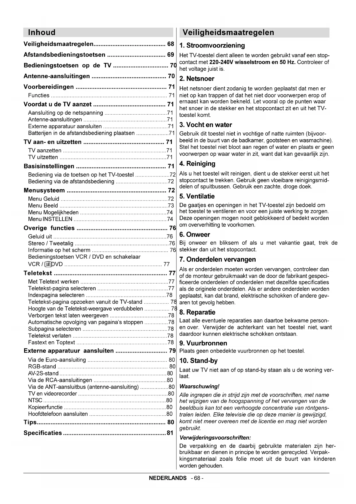 Laat uw TV niet aan of op stand-by staan als u de woning ver- laat. Waarschuwing! Alle ingrepen die in strijd zijn met de voorschriften, met name het wijzigen van de hoogspanning of het vervangen van de beeldbuis kan tot een verhoogde concentratie van röntgens- tralen leiden. Elke televisie die op deze manier is gewijzigd, komt niet meer overeen met de licentie en mag niet worden gebruikt. Verwijderingsvoorschriften: De verpakking en de daarbij gebruikte materialen zijn her- bruikbaar en dienen in principe te worden gerecycled. Verpak- kingsmateriaal zoals folie moet uit de buurt van kinderen worden gehouden.NEDERLANDS - 69 - = Stand-by / Aan