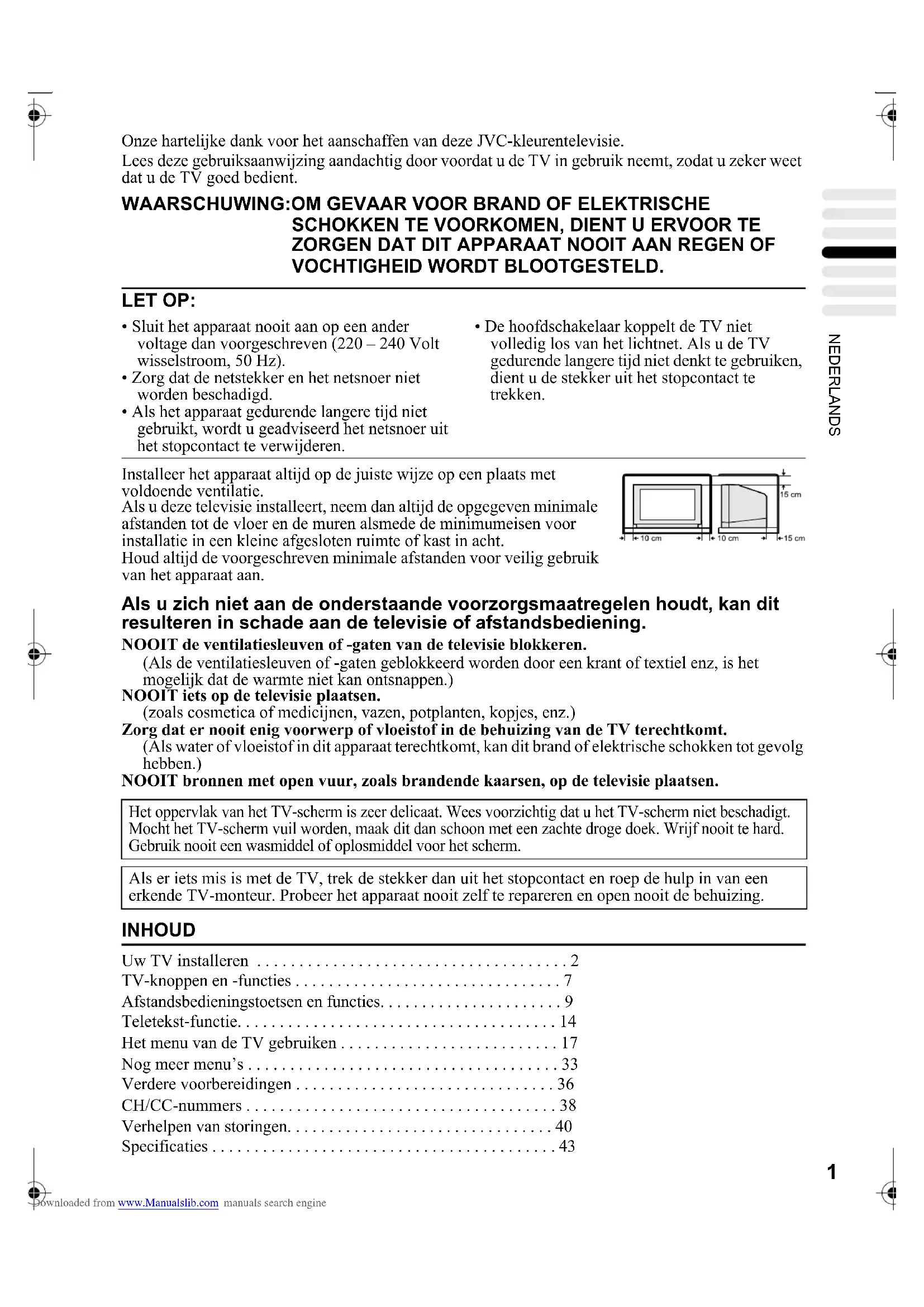 - Entrée vidéo, entrée S-VIDEO (Y/C) et entrées Audio G/D disponibles. Prise pour casque d’écoute Mini-prise stéréo (3,5 mm de diamètre) Dimensions (L × H × P) 725 mm × 480 mm × 496 mm Poids 34,7 kg Accessoires Télécommande × 1 (RM-C54 (grise) ou RM-C50 (noire) fournie.) Piles sèches AAA/R03 × 2 AV32&28H20EU_Fre.fm Page 45 Wednesday, February 20, 2002 2:05 PM Downloaded from www.Manualslib.com manuals search engine46 AV32/28X25EU / AV32/28H20EU / AV28CH1EU / LCT1142-001A-U / Français AV32&28H20EU_Fre.fm Page 46 Wednesday, February 20, 2002 2:05 PM Downloaded from www.Manualslib.com manuals search engine1 NEDERLANDS AV32/28X25EU / AV32/28H20EU / AV28CH1EU / LCT1142-001A-U / Nederlands Onze hartelijke dank voor het aanschaffen van deze JVC-kleurentelevisie. Lees deze gebruiksaanwijzing aandachtig door voordat u de TV in gebruik neemt, zodat u zeker weet dat u de TV goed bedient. Installeer het apparaat altijd op de juiste wijze op een plaats met voldoende ventilatie. Als u deze televisie installeert, neem dan altijd de opgegeven minimale afstanden tot de vloer en de muren alsmede de minimumeisen voor installatie in een kleine afgesloten ruimte of kast in acht. Houd altijd de voorgeschreven minimale afstanden voor veilig gebruik van het apparaat aan. Als u zich niet aan de onderstaande voorzorgsmaatregelen houdt, kan dit resulteren in schade aan de televisie of afstandsbediening. NOOIT de ventilatiesleuven of -gaten van de televisie blokkeren. (Als de ventilatiesleuven of -gaten geblokkeerd worden door een krant of textiel enz, is het mogelijk dat de warmte niet kan ontsnappen.) NOOIT iets op de televisie plaatsen. (zoals cosmetica of medicijnen, vazen, potplanten, kopjes, enz.) Zorg dat er nooit enig voorwerp of vloeistof in de behuizing van de TV terechtkomt. (Als water of vloeistof in dit apparaat terechtkomt, kan dit brand of elektrische schokken tot gevolg hebben.) NOOIT bronnen met open vuur, zoals brandende kaarsen, op de televisie plaatsen. INHOUD Uw TV installeren . . . . . . . . . . . . . . . . . . . . . . . . . . . . . . . . . . . . . 2 TV-knoppen en -functies . . . . . . . . . . . . . . . . . . . . . . . . . . . . . . . . 7 Afstandsbedieningstoetsen en functies. . . . . . . . . . . . . . . . . . . . . . 9 Teletekst-functie. . . . . . . . . . . . . . . . . . . . . . . . . . . . . . . . . . . . . . 14 Het menu van de TV gebruiken . . . . . . . . . . . . . . . . . . . . . . . . . . 17 Nog meer menu’s . . . . . . . . . . . . . . . . . . . . . . . . . . . . . . . . . . . . . 33 Verdere voorbereidingen . . . . . . . . . . . . . . . . . . . . . . . . . . . . . . . 36 CH/CC-nummers . . . . . . . . . . . . . . . . . . . . . . . . . . . . . . . . . . . . . 38 Verhelpen van storingen. . . . . . . . . . . . . . . . . . . . . . . . . . . . . . . . 40 Specificaties . . . . . . . . . . . . . . . . . . . . . . . . . . . . . . . . . . . . . . . . . 43 WAARSCHUWING:OM GEVAAR VOOR BRAND OF ELEKTRISCHE SCHOKKEN TE VOORKOMEN, DIENT U ERVOOR TE ZORGEN DAT DIT APPARAAT NOOIT AAN REGEN OF VOCHTIGHEID WORDT BLOOTGESTELD. LET OP: