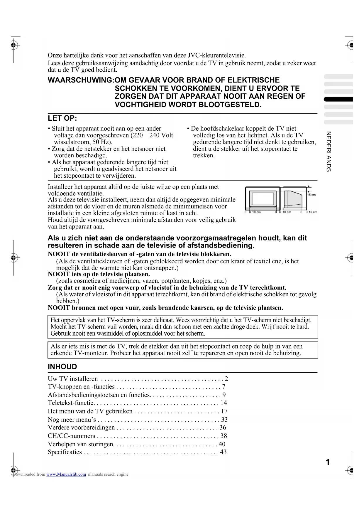 - Entrée vidéo, entrée S-VIDEO (Y/C) et entrées Audio G/D disponibles. Prise pour casque d’écoute Mini-prise stéréo (3,5 mm de diamètre) Dimensions (L × H × P) 725 mm × 480 mm × 496 mm Poids 34,7 kg Accessoires Télécommande × 1 (RM-C54 (grise) ou RM-C50 (noire) fournie.) Piles sèches AAA/R03 × 2 AV32&28H20EU_Fre.fm Page 45 Wednesday, February 20, 2002 2:05 PM Downloaded from www.Manualslib.com manuals search engine46 AV32/28X25EU / AV32/28H20EU / AV28CH1EU / LCT1142-001A-U / Français AV32&28H20EU_Fre.fm Page 46 Wednesday, February 20, 2002 2:05 PM Downloaded from www.Manualslib.com manuals search engine1 NEDERLANDS AV32/28X25EU / AV32/28H20EU / AV28CH1EU / LCT1142-001A-U / Nederlands Onze hartelijke dank voor het aanschaffen van deze JVC-kleurentelevisie. Lees deze gebruiksaanwijzing aandachtig door voordat u de TV in gebruik neemt, zodat u zeker weet dat u de TV goed bedient. Installeer het apparaat altijd op de juiste wijze op een plaats met voldoende ventilatie. Als u deze televisie installeert, neem dan altijd de opgegeven minimale afstanden tot de vloer en de muren alsmede de minimumeisen voor installatie in een kleine afgesloten ruimte of kast in acht. Houd altijd de voorgeschreven minimale afstanden voor veilig gebruik van het apparaat aan. Als u zich niet aan de onderstaande voorzorgsmaatregelen houdt, kan dit resulteren in schade aan de televisie of afstandsbediening. NOOIT de ventilatiesleuven of -gaten van de televisie blokkeren. (Als de ventilatiesleuven of -gaten geblokkeerd worden door een krant of textiel enz, is het mogelijk dat de warmte niet kan ontsnappen.) NOOIT iets op de televisie plaatsen. (zoals cosmetica of medicijnen, vazen, potplanten, kopjes, enz.) Zorg dat er nooit enig voorwerp of vloeistof in de behuizing van de TV terechtkomt. (Als water of vloeistof in dit apparaat terechtkomt, kan dit brand of elektrische schokken tot gevolg hebben.) NOOIT bronnen met open vuur, zoals brandende kaarsen, op de televisie plaatsen. INHOUD Uw TV installeren . . . . . . . . . . . . . . . . . . . . . . . . . . . . . . . . . . . . . 2 TV-knoppen en -functies . . . . . . . . . . . . . . . . . . . . . . . . . . . . . . . . 7 Afstandsbedieningstoetsen en functies. . . . . . . . . . . . . . . . . . . . . . 9 Teletekst-functie. . . . . . . . . . . . . . . . . . . . . . . . . . . . . . . . . . . . . . 14 Het menu van de TV gebruiken . . . . . . . . . . . . . . . . . . . . . . . . . . 17 Nog meer menu’s . . . . . . . . . . . . . . . . . . . . . . . . . . . . . . . . . . . . . 33 Verdere voorbereidingen . . . . . . . . . . . . . . . . . . . . . . . . . . . . . . . 36 CH/CC-nummers . . . . . . . . . . . . . . . . . . . . . . . . . . . . . . . . . . . . . 38 Verhelpen van storingen. . . . . . . . . . . . . . . . . . . . . . . . . . . . . . . . 40 Specificaties . . . . . . . . . . . . . . . . . . . . . . . . . . . . . . . . . . . . . . . . . 43 WAARSCHUWING:OM GEVAAR VOOR BRAND OF ELEKTRISCHE SCHOKKEN TE VOORKOMEN, DIENT U ERVOOR TE ZORGEN DAT DIT APPARAAT NOOIT AAN REGEN OF VOCHTIGHEID WORDT BLOOTGESTELD. LET OP: