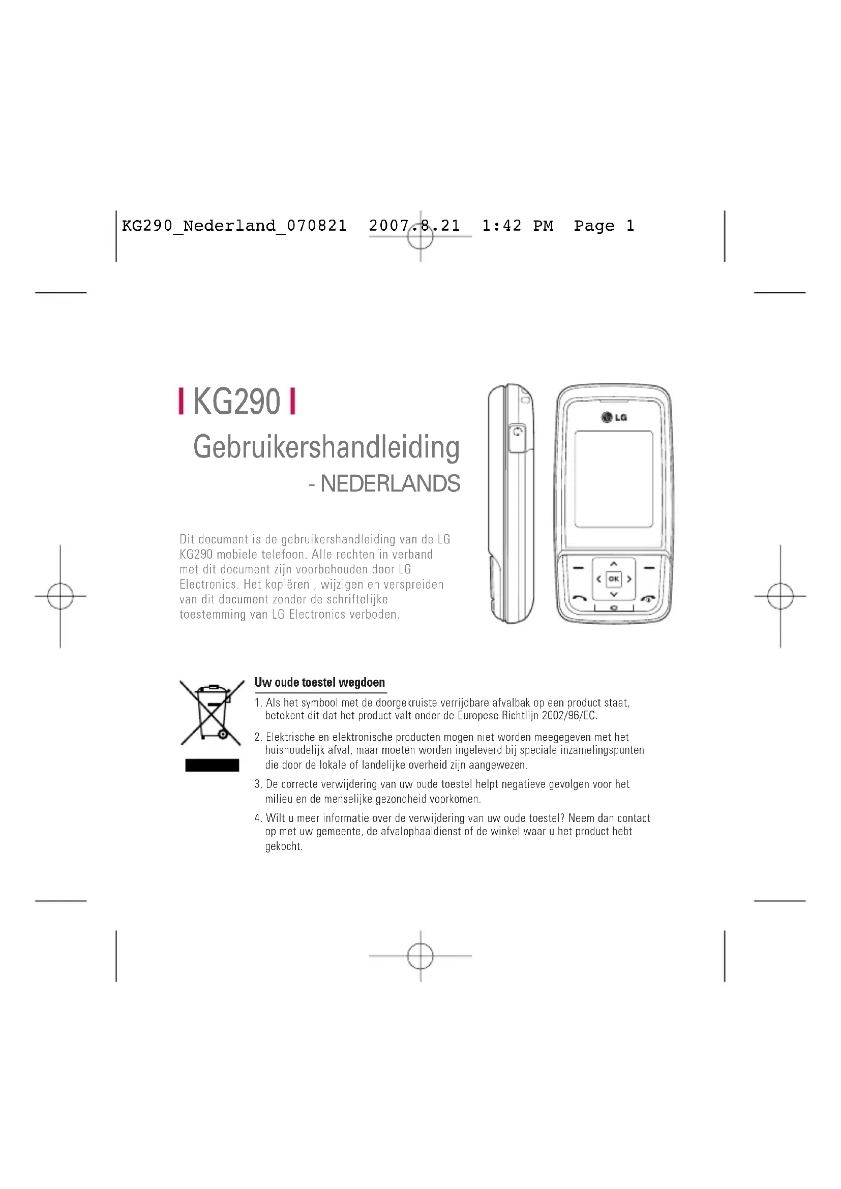 KG290 Gebruikershandleiding - NEDERLANDS 1. Als het symbool met de doorgekruiste verrijdbare afvalbak op een product staat,betekent dit dat het product valt onder de Europese Richtlijn 2002/96/EC.2. Elektrische en elektronische producten mogen niet worden meegegeven met hethuishoudelijk afval, maar moeten worden ingeleverd bij speciale inzamelingspuntendie door de lokale of landelijke overheid zijn aangewezen.3. De correcte verwijdering van uw oude toestel helpt negatieve gevolgen voor hetmilieu en de menselijke gezondheid voorkomen.4. Wilt u meer informatie over de verwijdering van uw oude toestel? Neem dan contactop met uw gemeente, de afvalophaaldienst of de winkel waar u het product hebtgekocht. Uw oude toestel wegdoen Dit document is de gebruikershandleiding van de LG KG290 mobiele telefoon. Alle rechten in verband met dit document zijn voorbehouden door LG Electronics. Het kopiëren , wijzigen en verspreiden van dit document zonder de schriftelijke toestemming van LG Electronics verboden. KG290_Nederland_070821 2007.8.21 1:42 PM Page 1Oproe chiede Alle op Gemist Gekoze Ontvan oproep Oproep Oproep Gegev format Introductie 6 Voor uw veiligheid7 Richtlijnen voor juist en veilig gebruik 9 KG290 functies 17 Onderdelen van de telefoon Aan de slag 22 De SIM-kaart en de batterij plaatsen De batterij opladen 25 De oplader loskoppelen 26 Toegangscodes 27 Hoofdfuncties 29 Bellen en gebeld worden Tekst invoeren 31 Verander de modus voor tekstinvoer 33 Gebruik T9-modus De ABC-modus 34 Gebruik 123 (nummer)-modus 35 Gebruik Symbool-modus Overzicht van menufuncties 36 Orange World 38 Orange World Favorieten URL invoeren Geschiedenis 39 Opgeslagen pagina's Instellingen Netwerkprofiel Weergave stijl Cache 40 Cookies Veiligheidscertificaten Afbeelding tonen Java Script Geheugen in gebruik 41 Informatie Inhoud