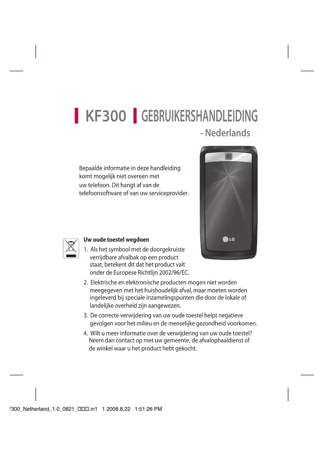 17_KF300_Netherland_KPN cover_1.1 1 2008.8.11 10:32:28 AMBluetooth QD ID B013568 17_KF300_Netherland_KPN cover_1.2 2 2008.8.11 10:32:28 AM- Nederlands GEBRUIKERSHANDLEIDING KF300 Bepaalde informatie in deze handleiding komt mogelijk niet overeen met uw telefoon. Dit hangt af van de telefoonsoftware of van uw serviceprovider. Uw oude toestel wegdoen