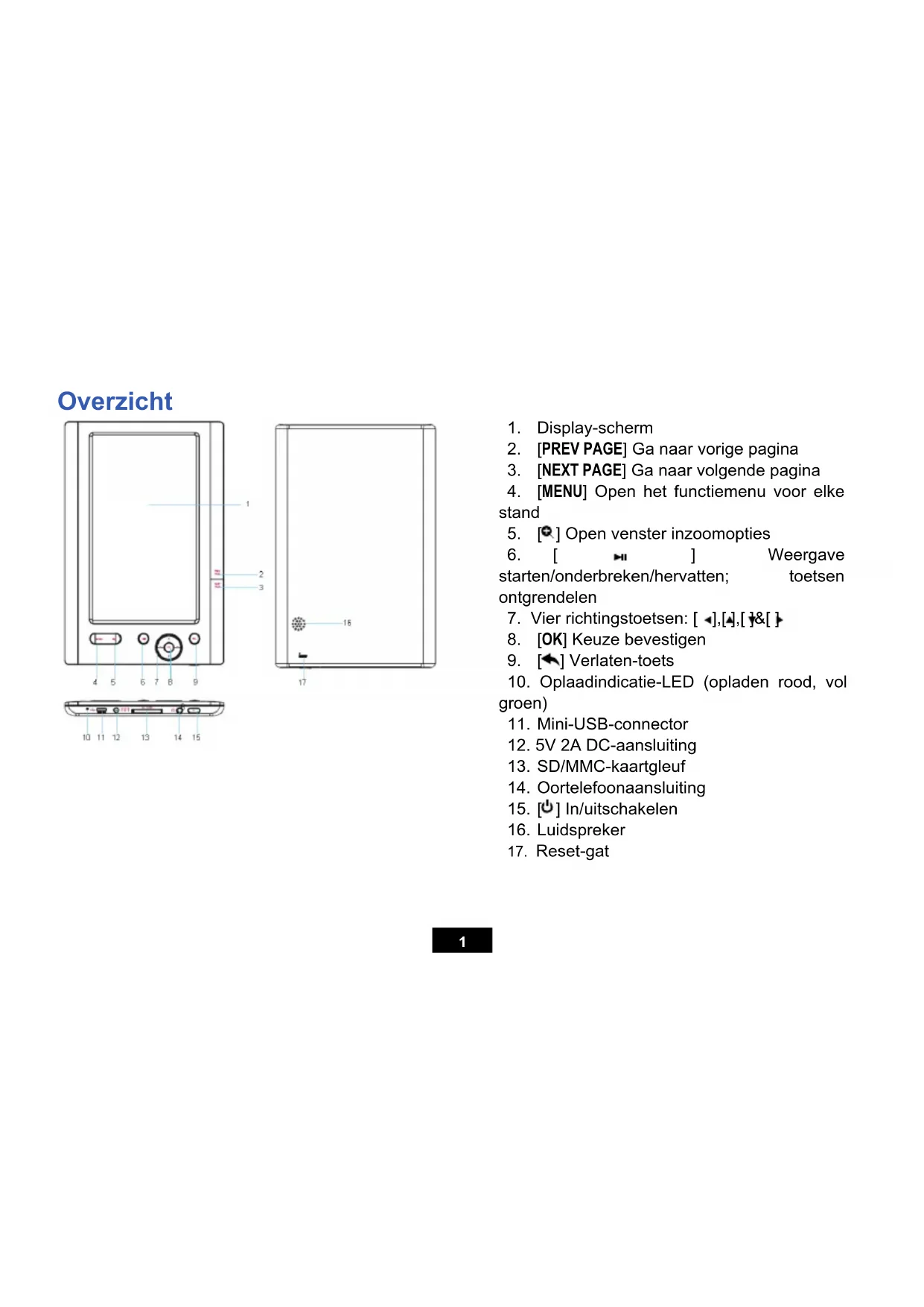1Beginnen De E-boekreader inschakelen Houd de [ ]-toets ingedrukt om de E-boekreader in te schakelen. Als de batterij bijna leeg is, steek dan het ene uiteinde van de adapter in de DC-aansluiting op de E-boekreader en het andere uiteinde in een stopcontact. Opmerking: Houd de [ ]-toets weer ingedrukt om de E-boekreader uit te schakelen. Aansluiten op een PC en bestanden downloaden van de PC Sluit het apparaat aan op de computer om bestanden te downloaden of om het apparaat op te laden.