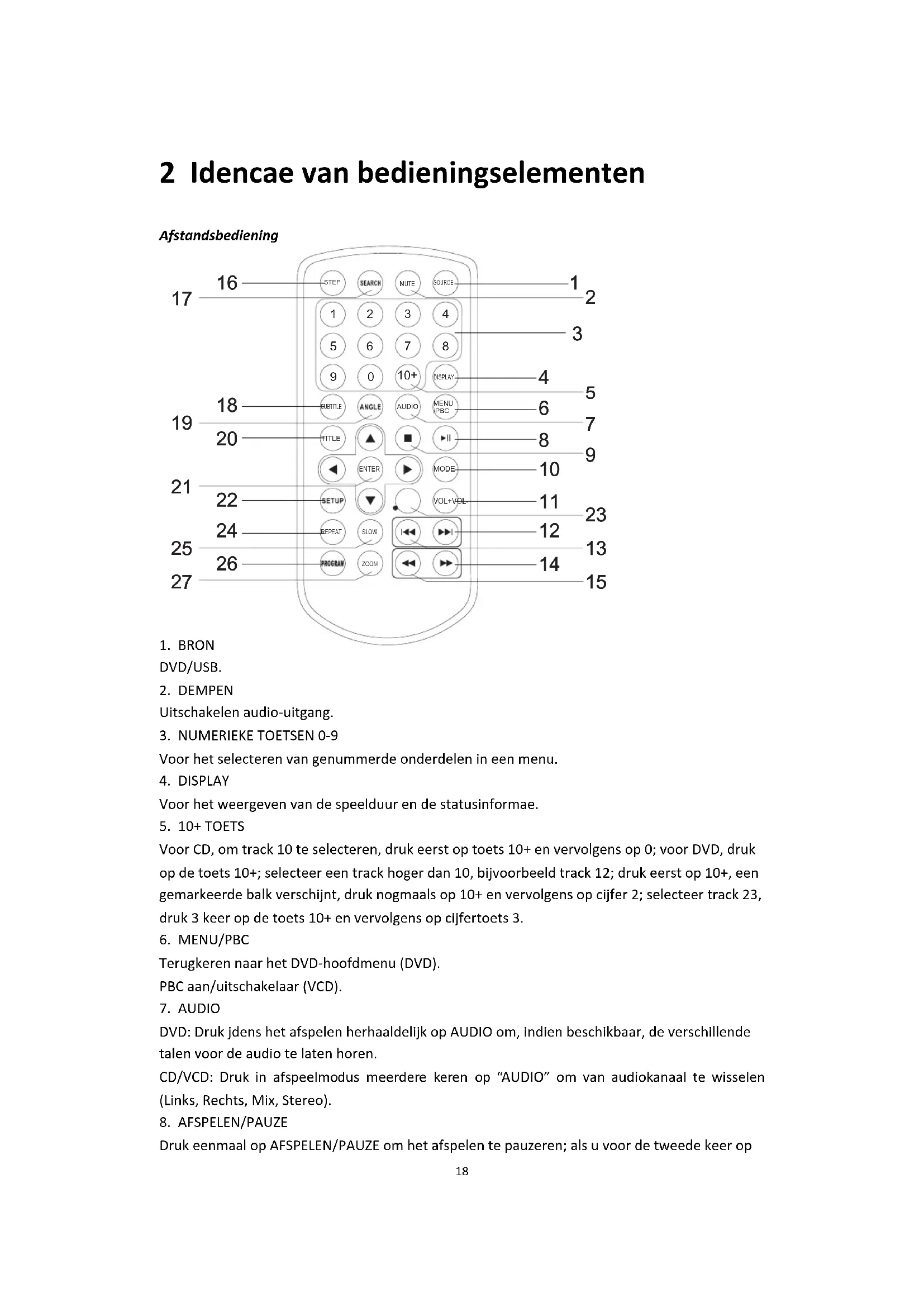 Voor CD, om track 10 te selecteren, druk eerst op toets 10+ en vervolgens op 0; voor DVD, druk op de toets 10+; selecteer een track hoger dan 10, bijvoorbeeld track 12; druk eerst op 10+, een gemarkeerde balk verschijnt, druk nogmaals op 10+ en vervolgens op cijfer 2; selecteer track 23, druk 3 keer op de toets 10+ en vervolgens op cijfertoets 3.