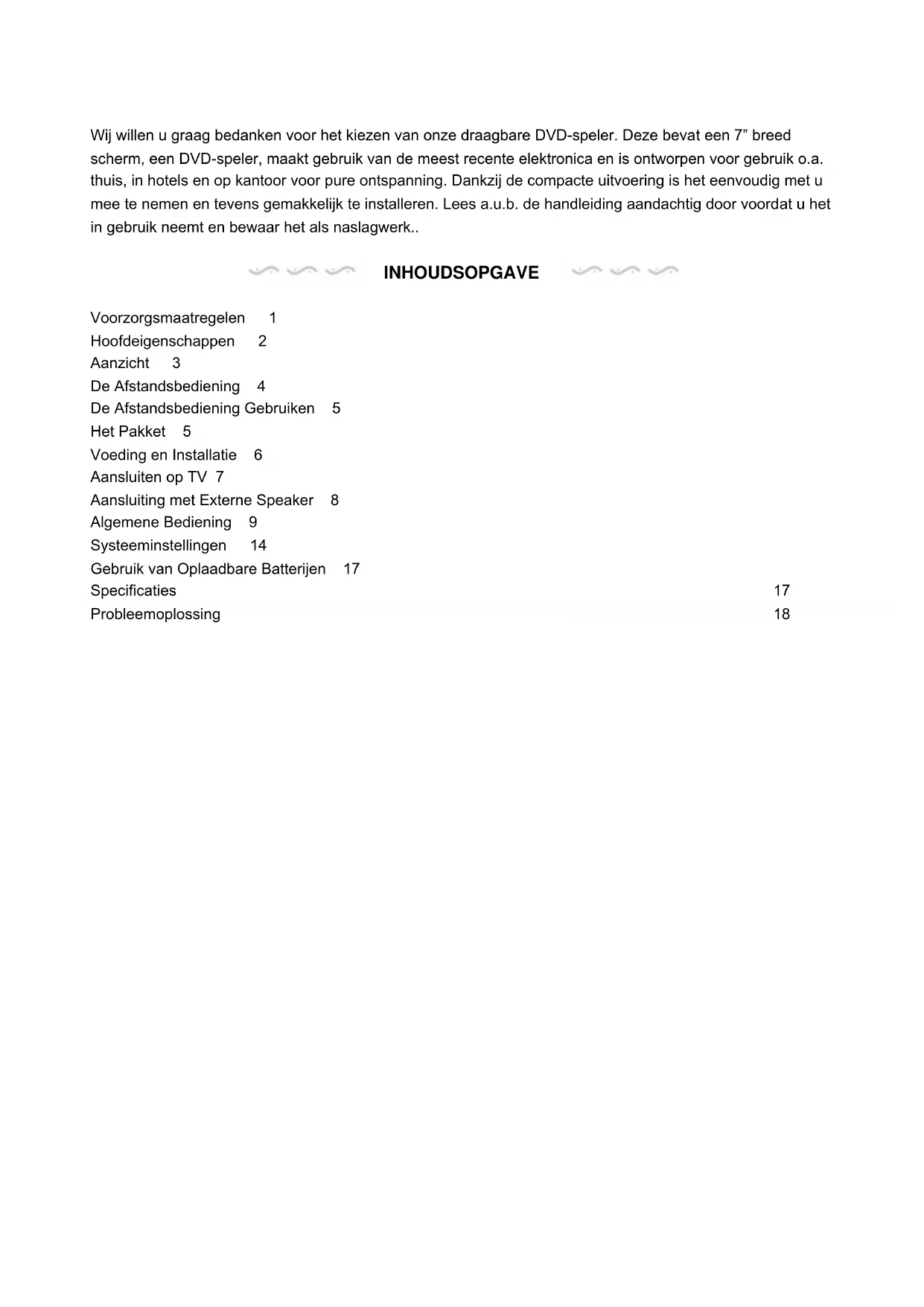 USER MANUAL GEBRUIKSHANDLEIDINGWij willen u graag bedanken voor het kiezen van onze draagbare DVD-speler. Deze bevat een 7” breed scherm, een DVD-speler, maakt gebruik van de meest recente elektronica en is ontworpen voor gebruik o.a. thuis, in hotels en op kantoor voor pure ontspanning. Dankzij de compacte uitvoering is het eenvoudig met u mee te nemen en tevens gemakkelijk te installeren. Lees a.u.b. de handleiding aandachtig door voordat u het in gebruik neemt en bewaar het als naslagwerk.. INHOUDSOPGAVE Voorzorgsmaatregelen 1 Hoofdeigenschappen 2 Aanzicht 3 De Afstandsbediening 4 De Afstandsbediening Gebruiken 5 Het Pakket 5 Voeding en Installatie 6 Aansluiten op TV 7 Aansluiting met Externe Speaker 8 Algemene Bediening 9 Systeeminstellingen 14 Gebruik van Oplaadbare Batterijen 17 Specificaties 17 Probleemoplossing 18Veiligheidsvoorschriften