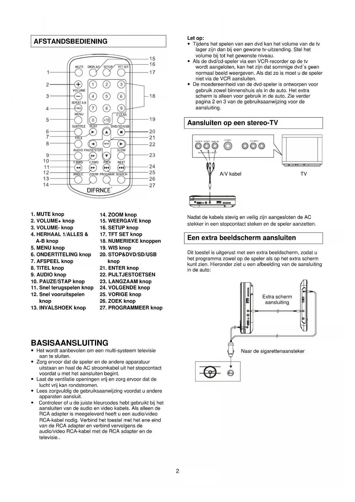 Let op: Tijdens het spelen van een dvd kan het volume van de tv lager zijn dan bij een gewone tv-uitzending. Stel het volume bij tot het gewenste niveau. Als de dvd/cd-speler via een VCR-recorder op de tv wordt aangeloten, kan het zijn dat sommige dvd´s geen normaal beeld weergeven. Als dat zo is moet u de speler niet via de VCR aansluiten. De moedereenheid van de dvd-speler is ontworpen voor gebruik zowel binnenshuis als in de auto. Het extra scherm is alleen voor gebruik in de auto. Zie verder pagina 2 en 3 van de gebruiksaanwijzing voor de aansluiting. Aansluiten op een stereo-TV