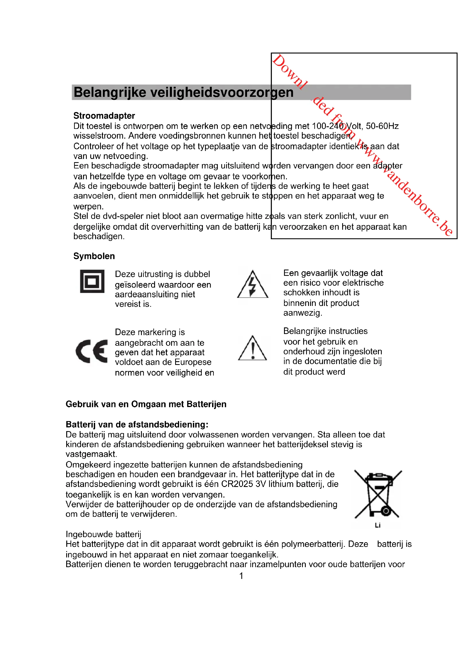 Gebruik van en Omgaan met Batterijen Batterij van de afstandsbediening: De batterij mag uitsluitend door volwassenen worden vervangen. Sta alleen toe dat kinderen de afstandsbediening gebruiken wanneer het batterijdeksel stevig is vastgemaakt. Omgekeerd ingezette batterijen kunnen de afstandsbediening beschadigen en houden een brandgevaar in. Het batterijtype dat in de afstandsbediening wordt gebruikt is één CR2025 3V lithium batterij, die toegankelijk is en kan worden vervangen. Verwijder de batterijhouder op de onderzijde van de afstandsbediening om de batterij te verwijderen. Ingebouwde batterij Het batterijtype dat in dit apparaat wordt gebruikt is één polymeerbatterij. Deze batterij is ingebouwd in het apparaat en niet zomaar toegankelijk. Batterijen dienen te worden teruggebracht naar inzamelpunten voor oude batterijen voor Deze markering is aangebracht om aan te geven dat het apparaat voldoet aan de Europese normen voor veiligheid en Belangrijke instructies voor het gebruik en onderhoud zijn ingesloten in de documentatie die bij dit product werd Deze uitrusting is dubbel geïsoleerd waardoor een aardeaansluiting niet vereist is. Een gevaarlijk voltage dat een risico voor elektrische schokken inhoudt is binnenin dit product aanwezig.Downloaded from www.vandenborre.be